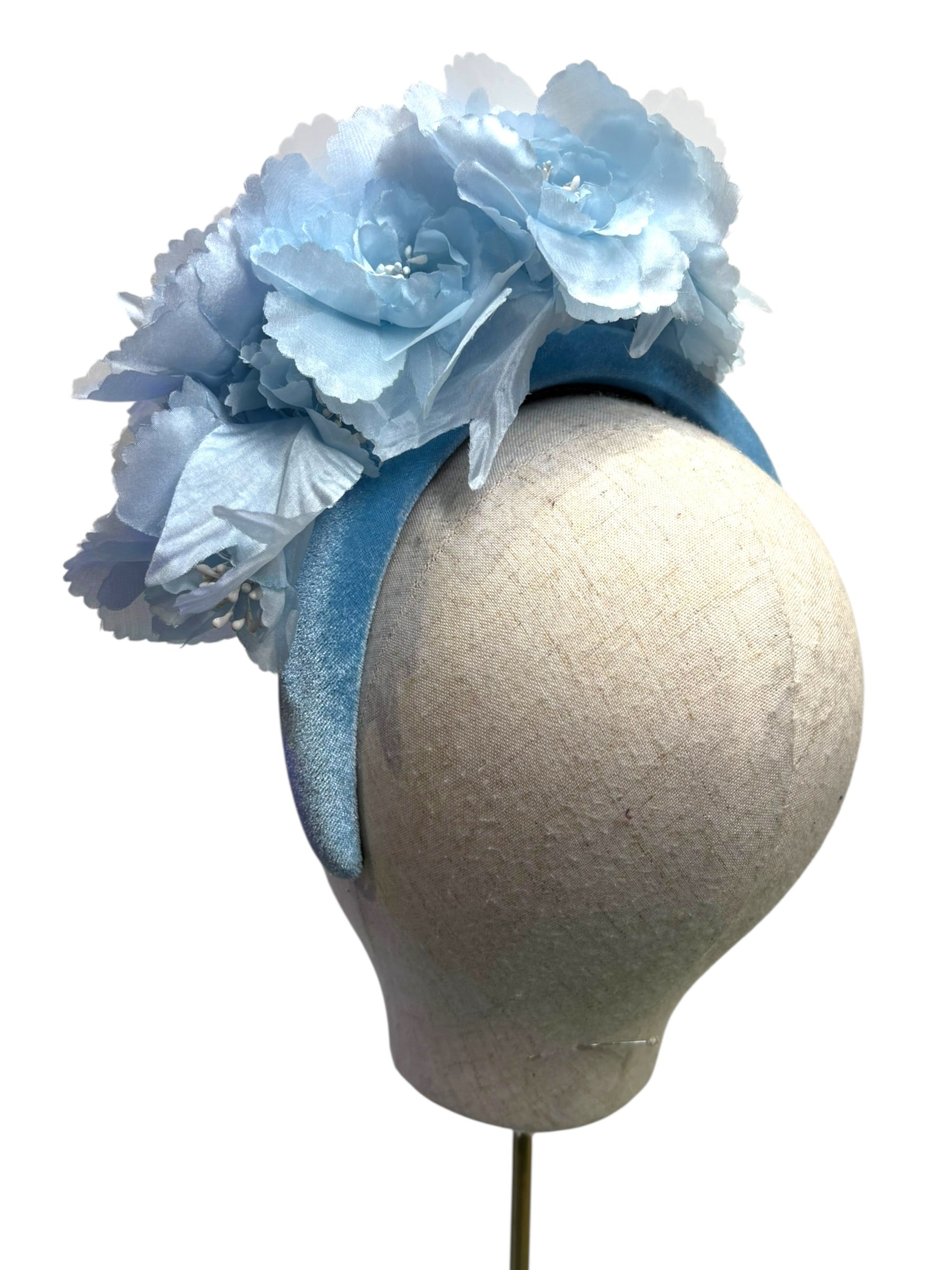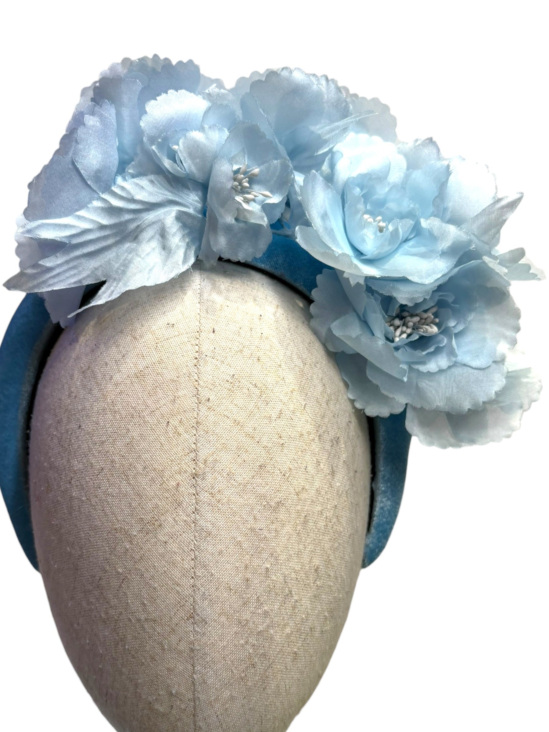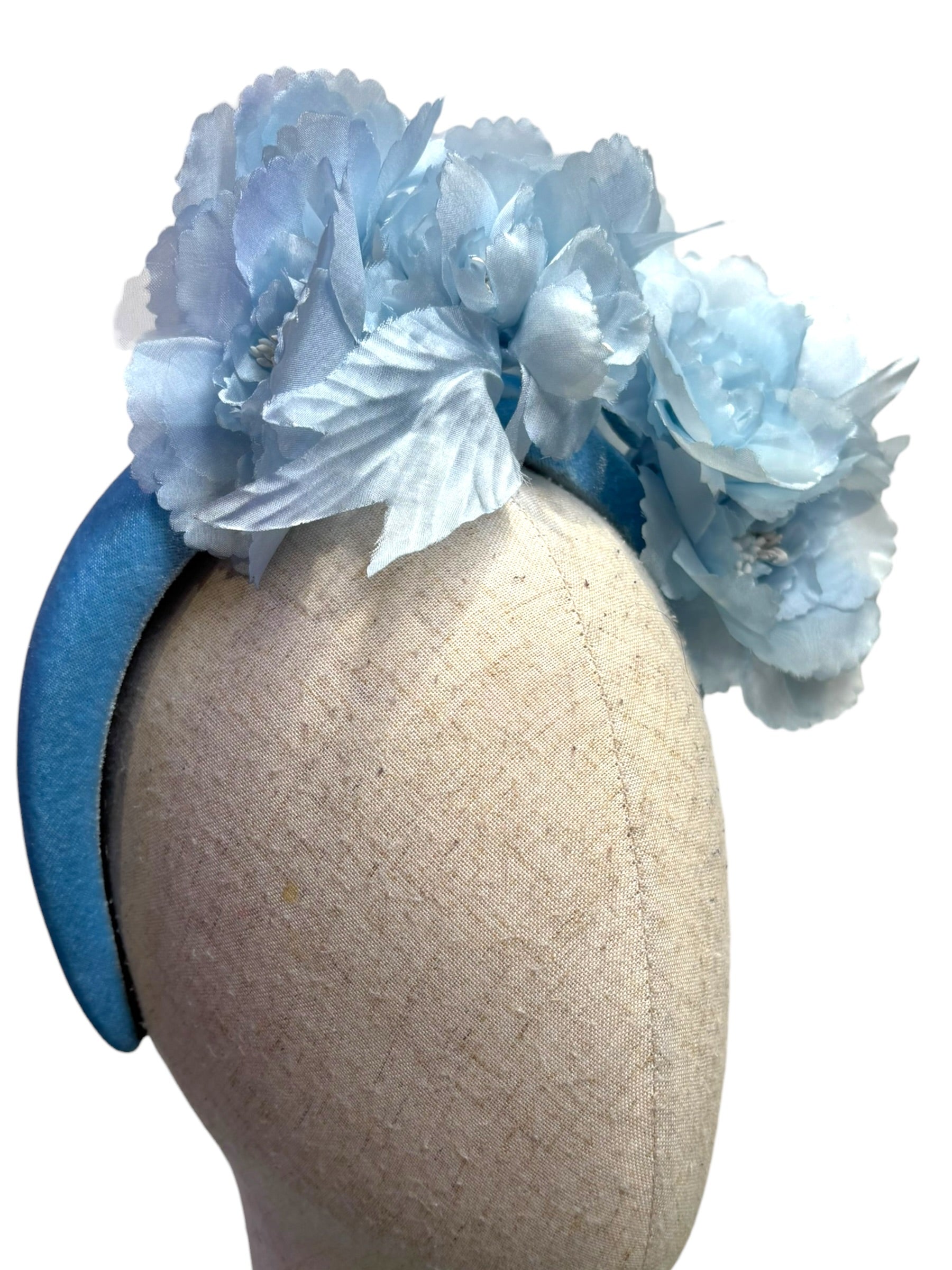An headband Fascinator in pale sky blue with organza silk flowers, perfect for weddings or races