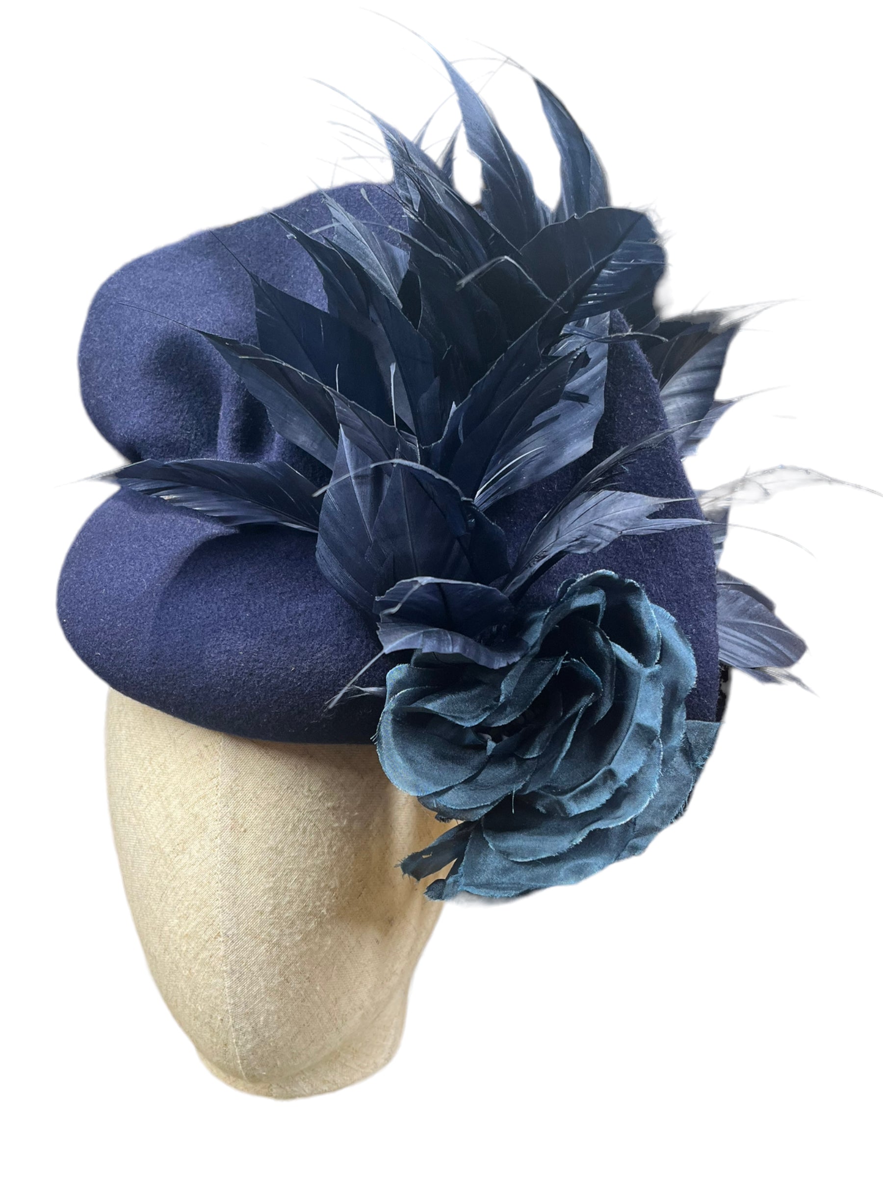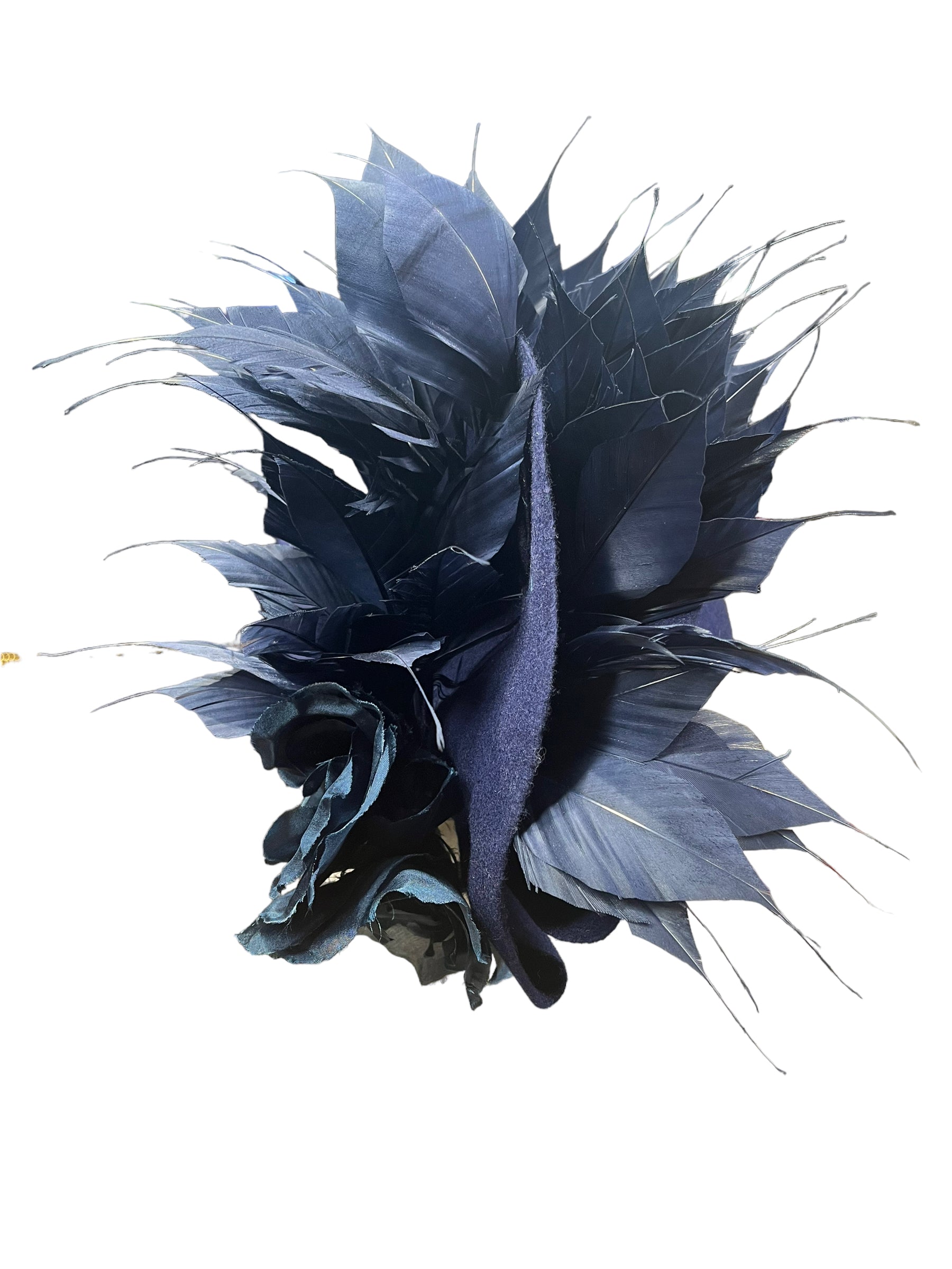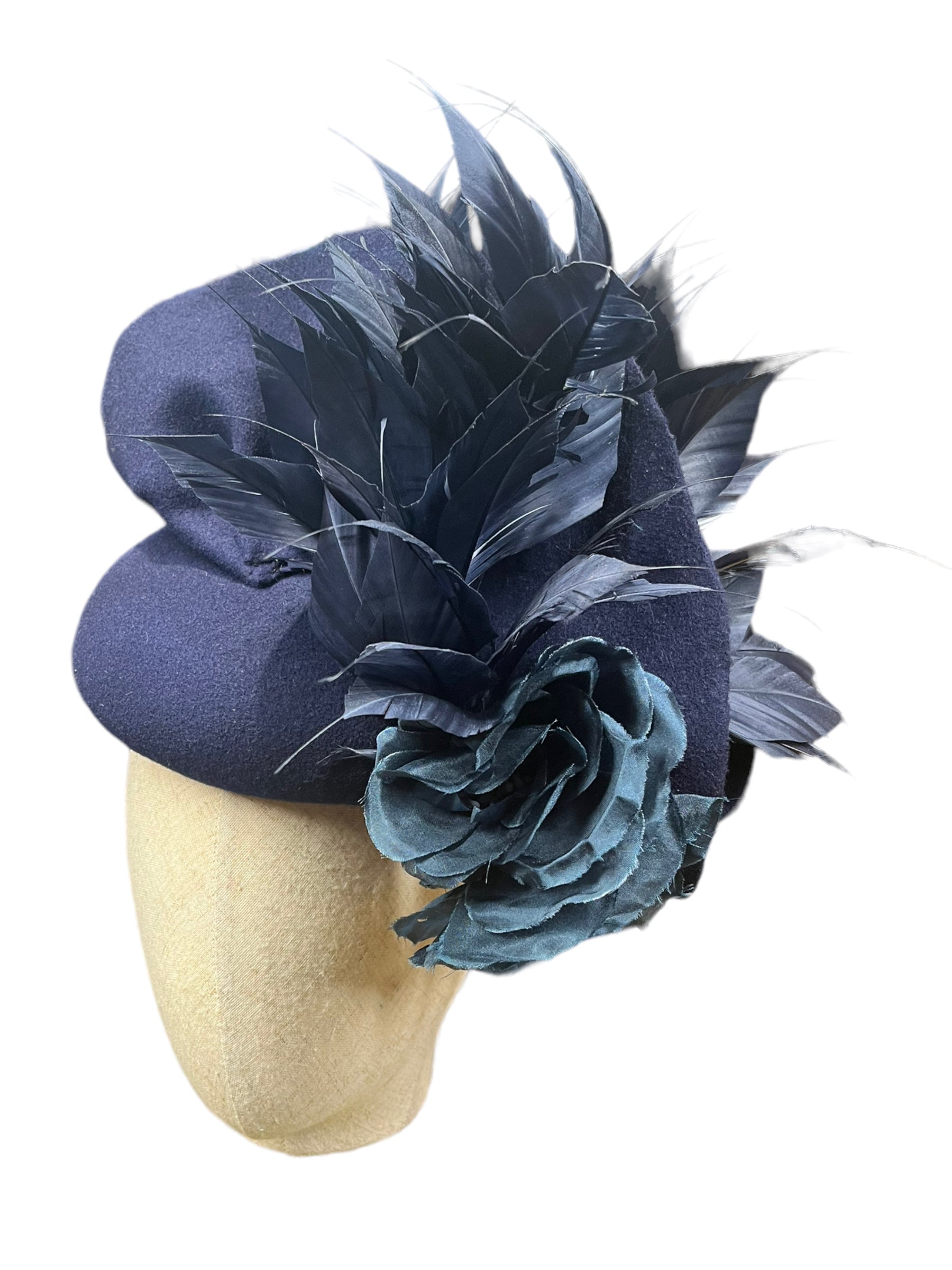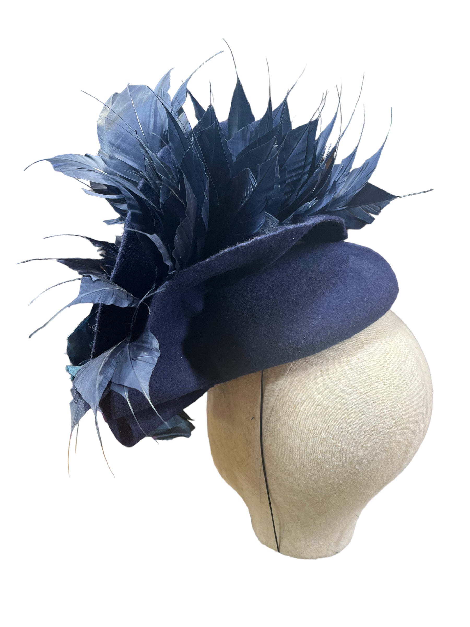 Using a French navy blue merino wool felt here a button size fascinator with feathers and organza silk rises it’s perfect for a winter wedding or races or a evening event