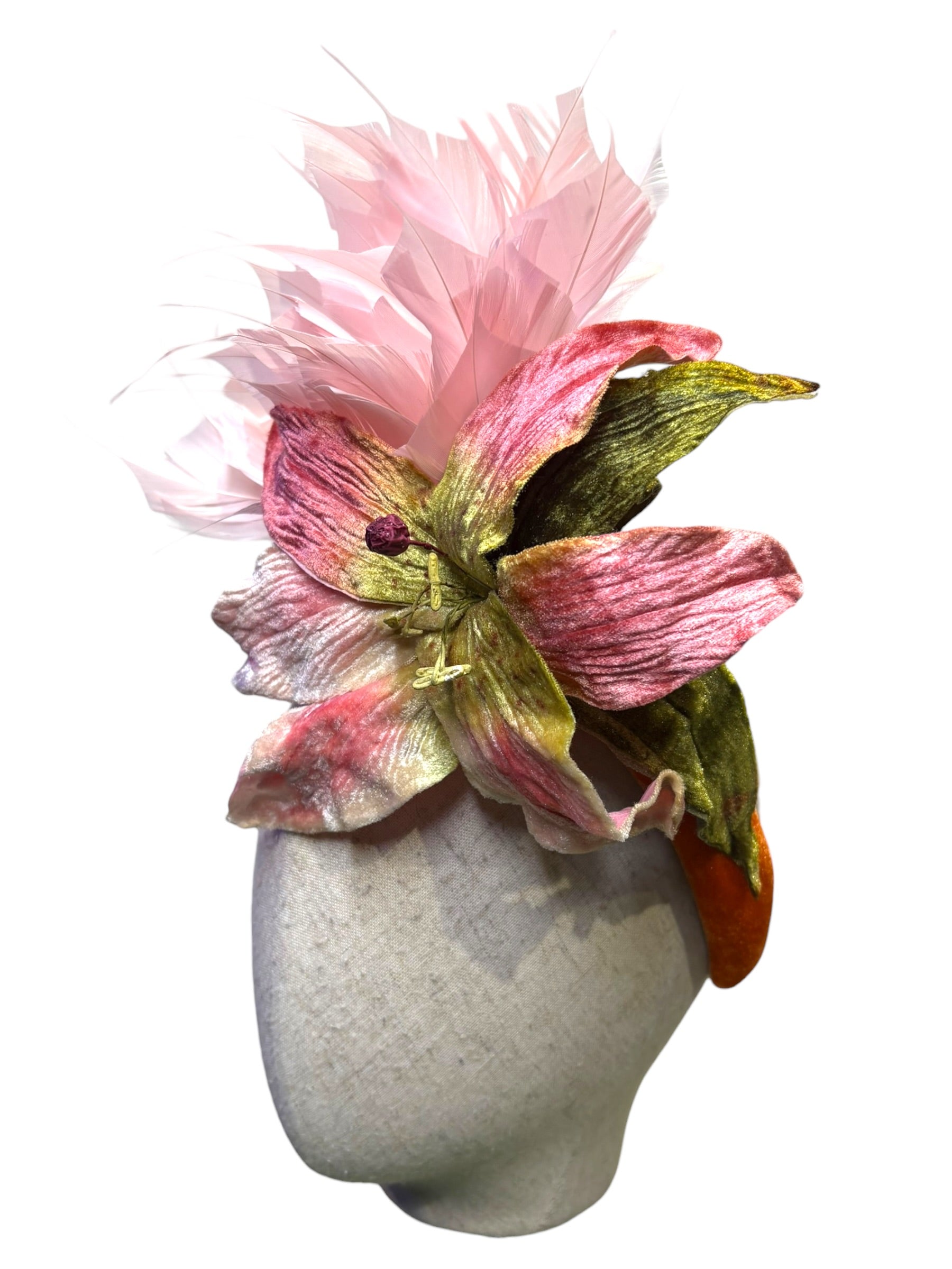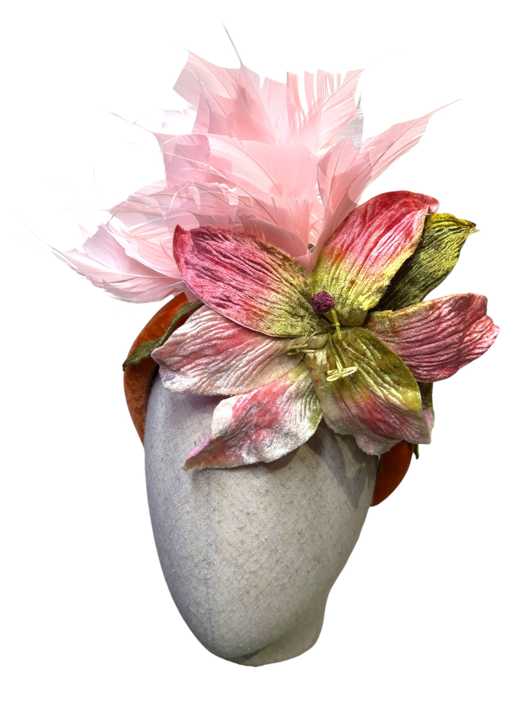 A deep baby blue velvet padded headband with hand stitched blue lace with beads, feathers and organza silk and velvet flowers.