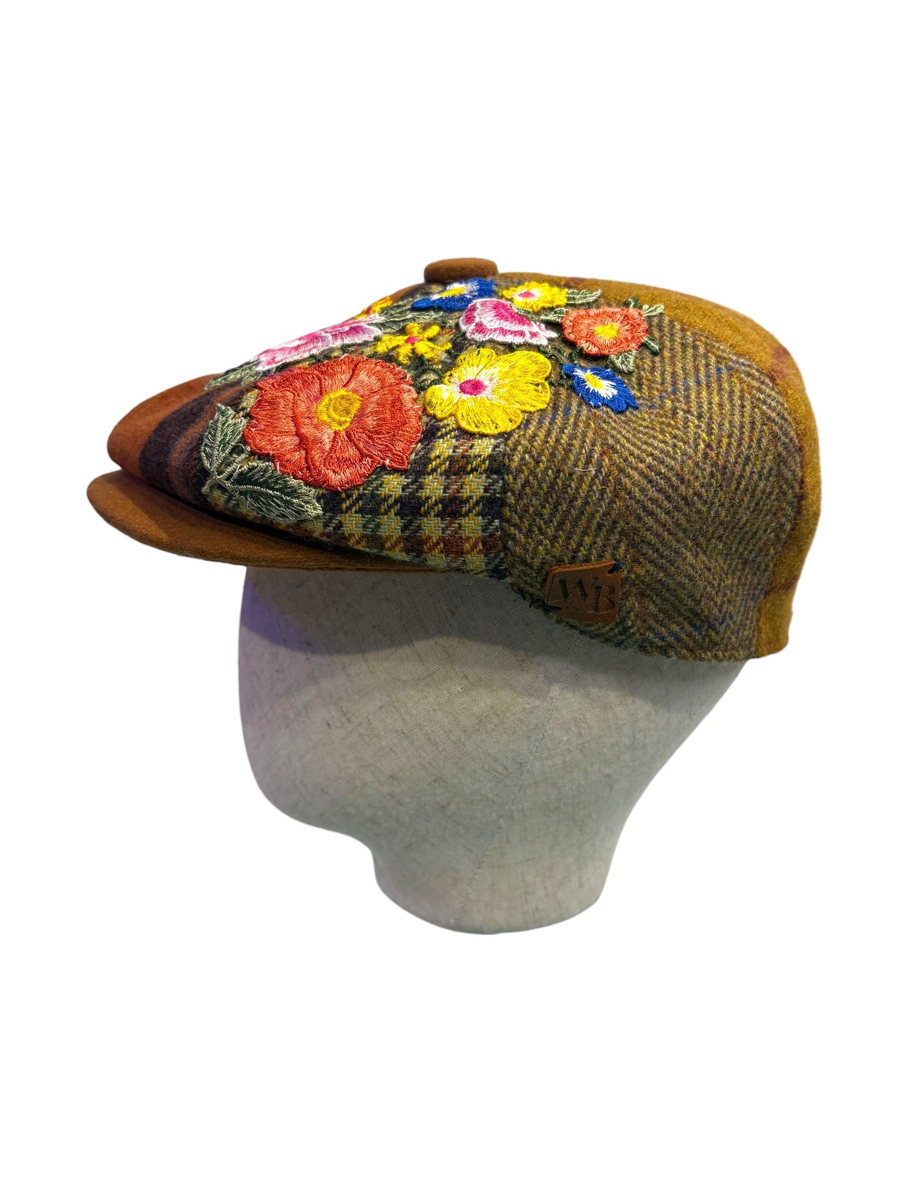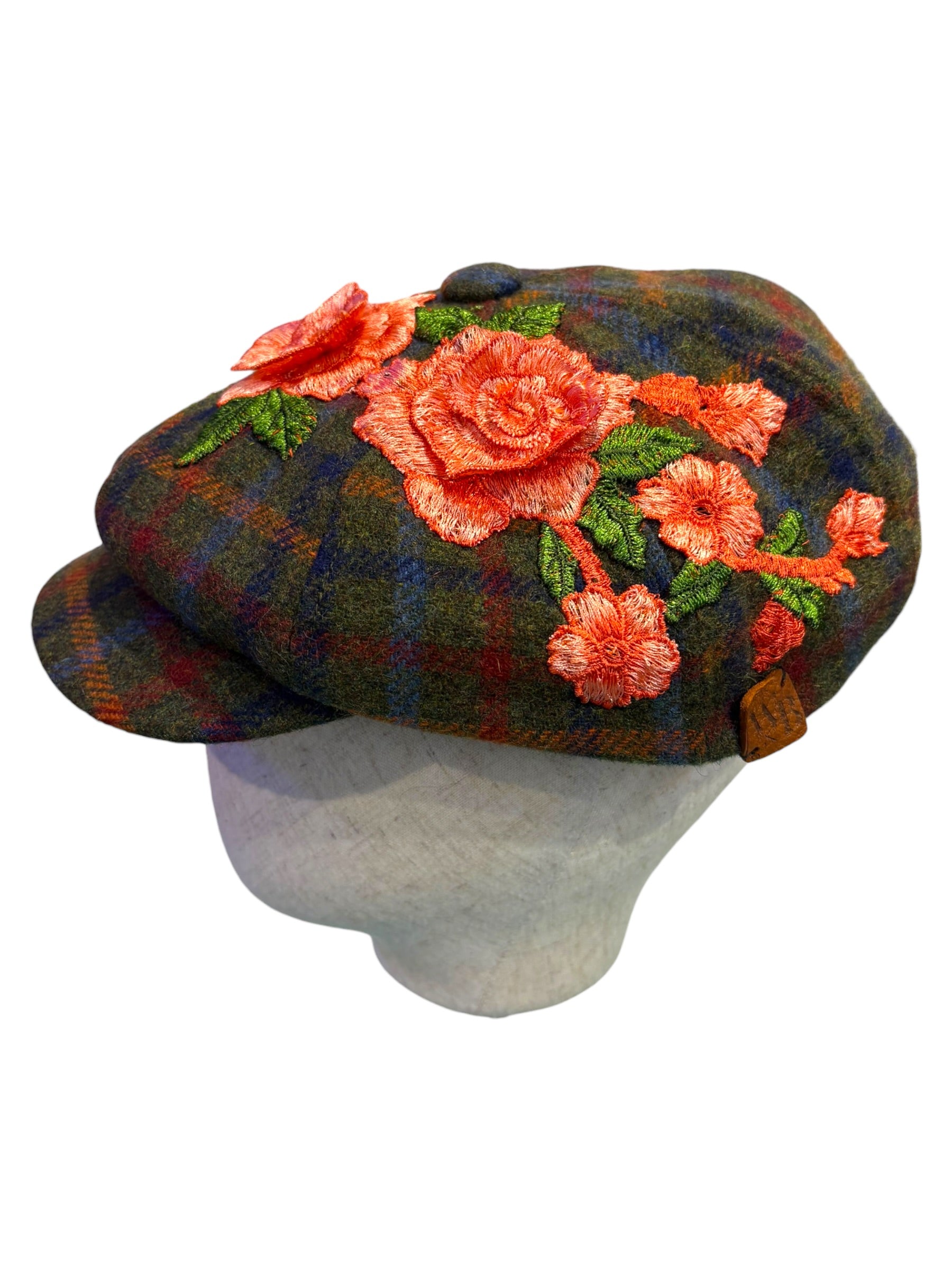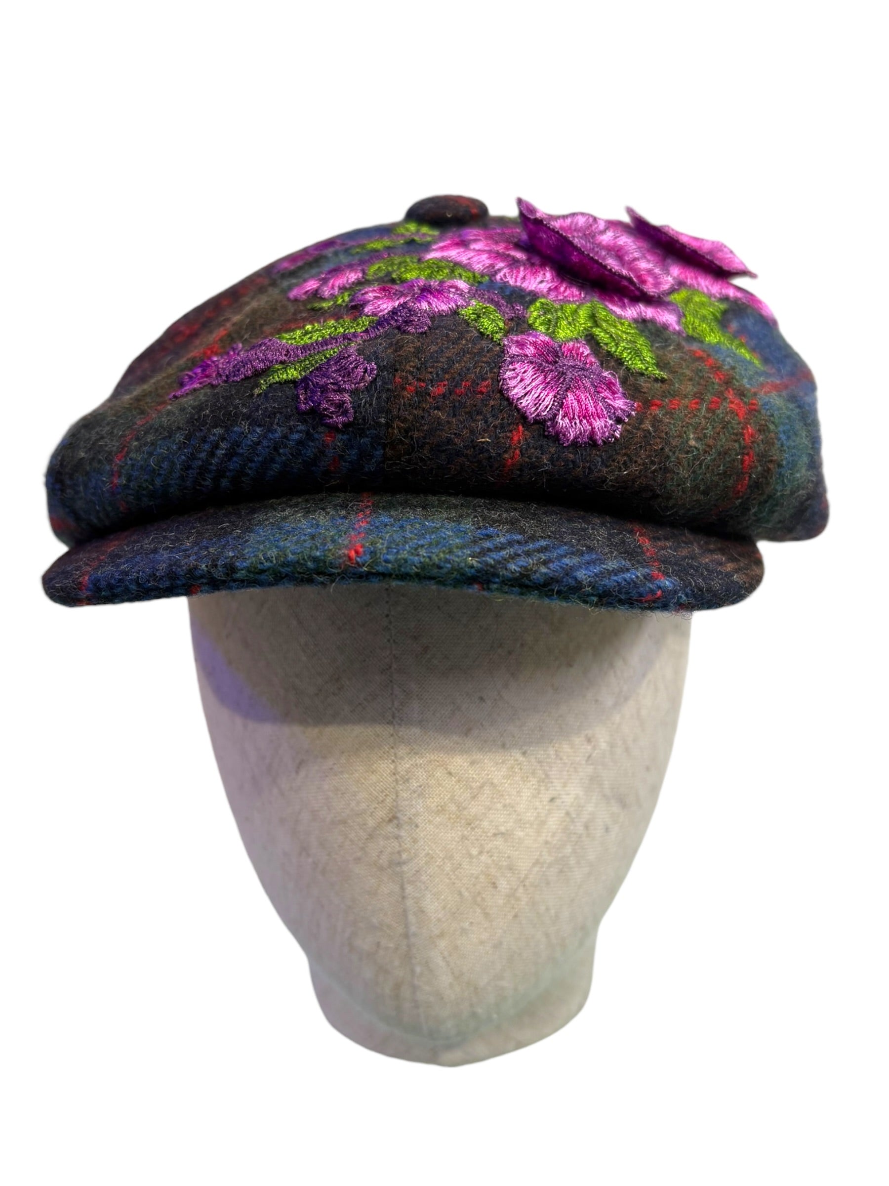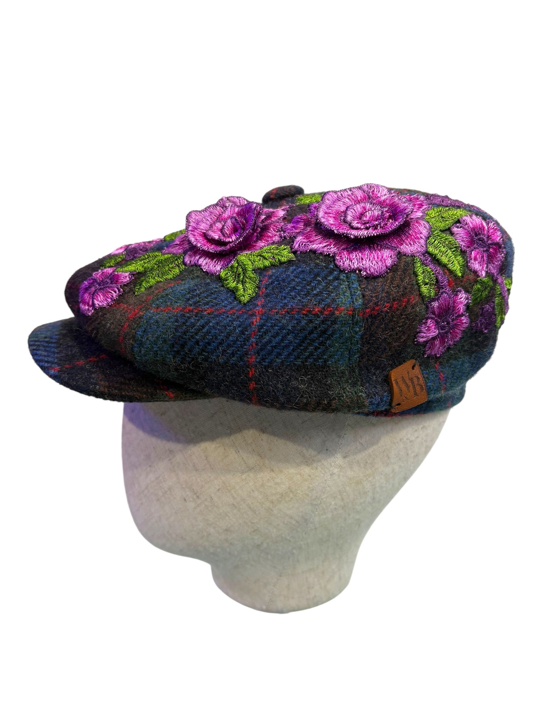 A W&B limited Edition Baker Boy Cap made in 100% tweed or tartan scottish wool with a French Embroidery