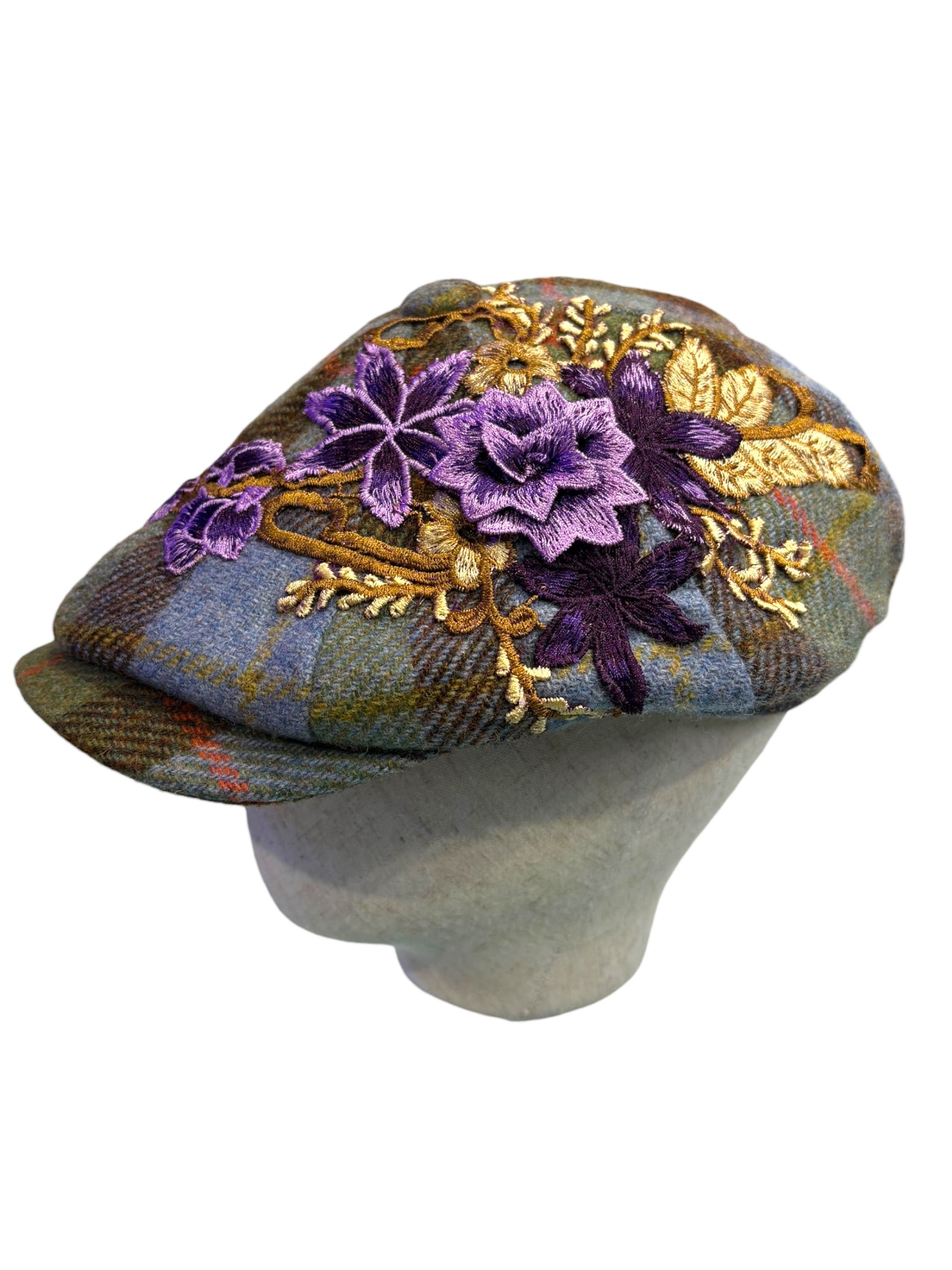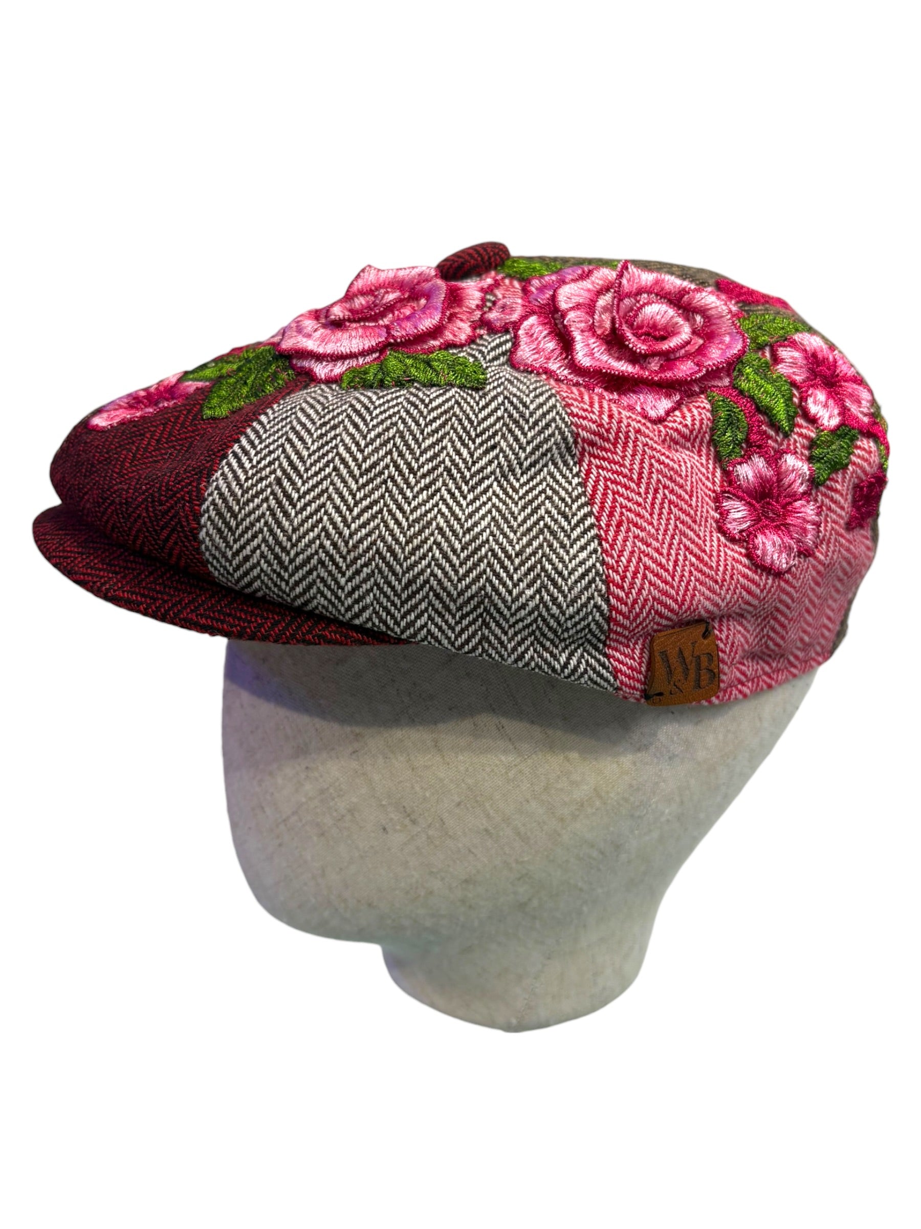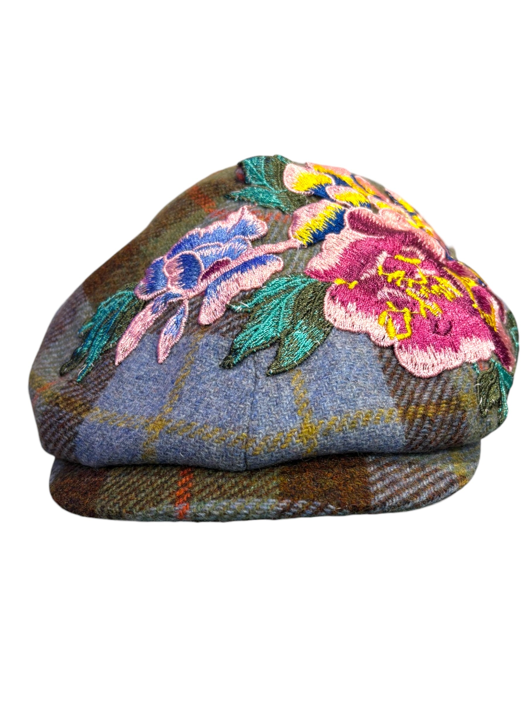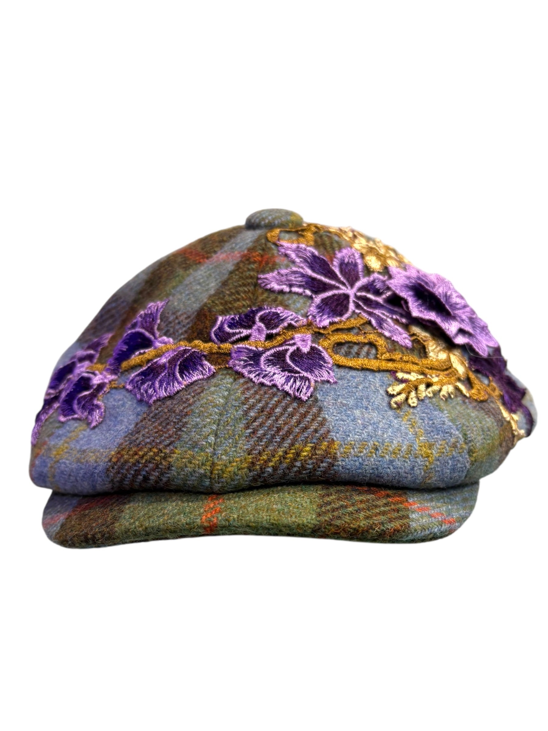 A W&B limited Edition Baker Boy Cap made in 100% tweed or tartan scottish wool with a French Embroidery