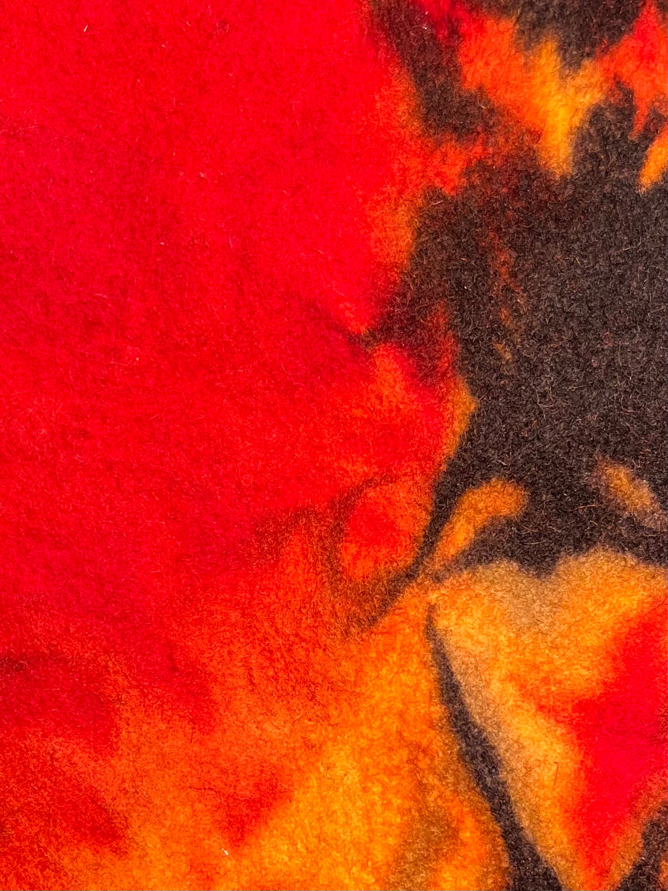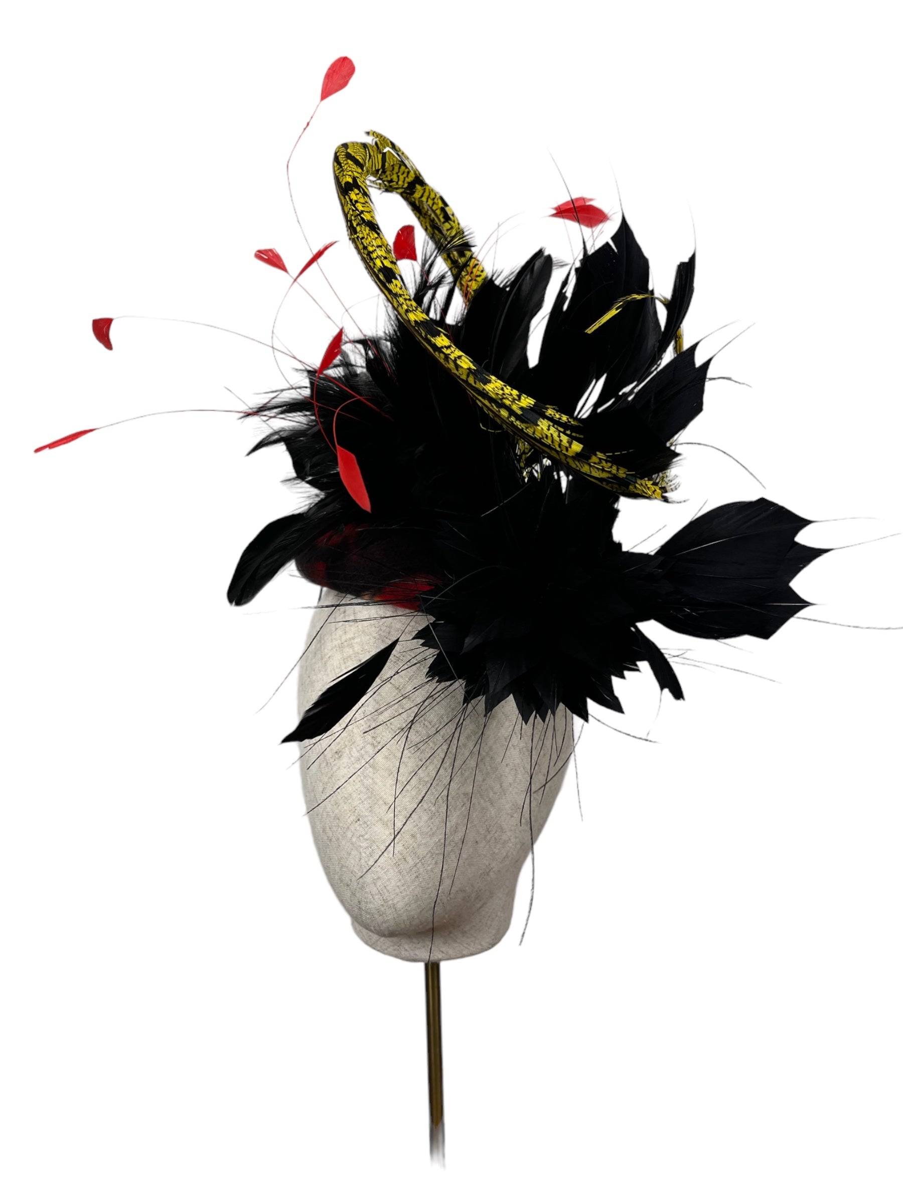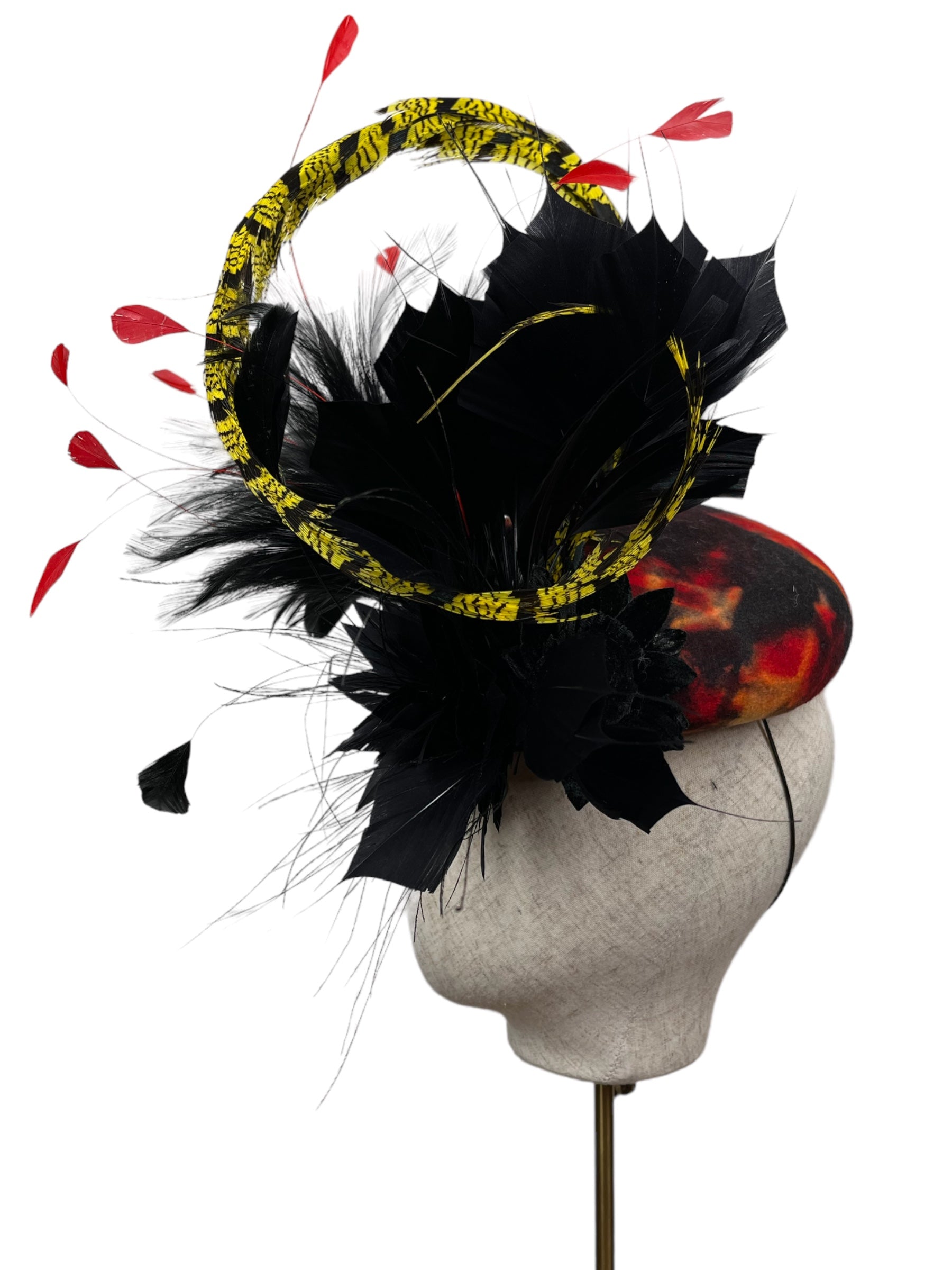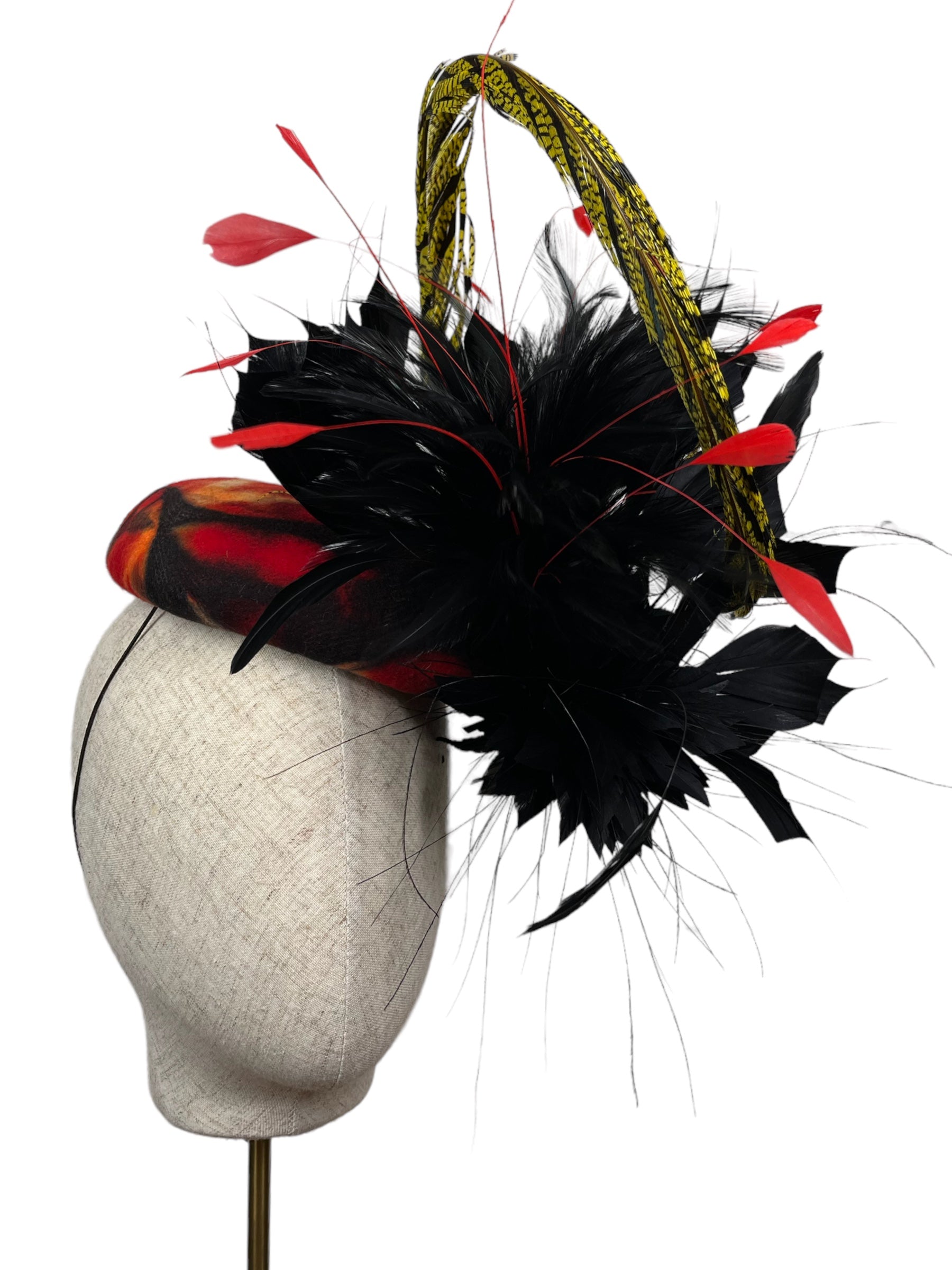 My own homage to the greatest and late iconic fashion designer Dame Vivienne Westwood, like her, it's one of a kind a tie dye merino felt button with black feather mouth, red feather drops, a velvet black flower, a feather black flower, all set off by a twirled yellow pheasant feather.