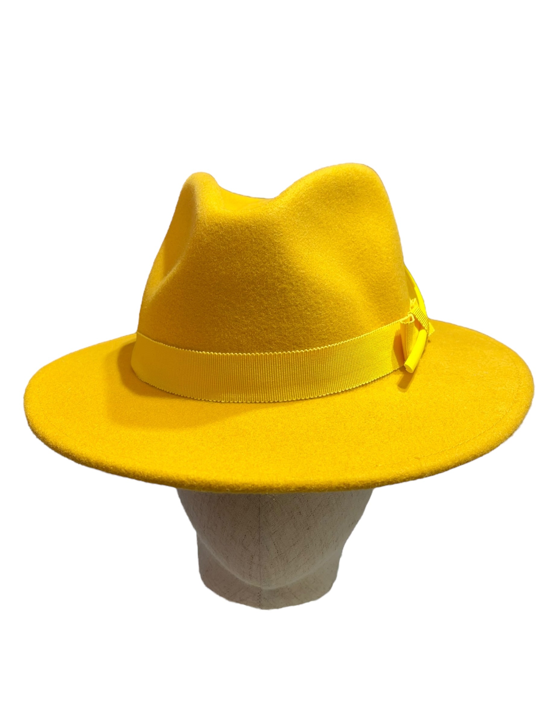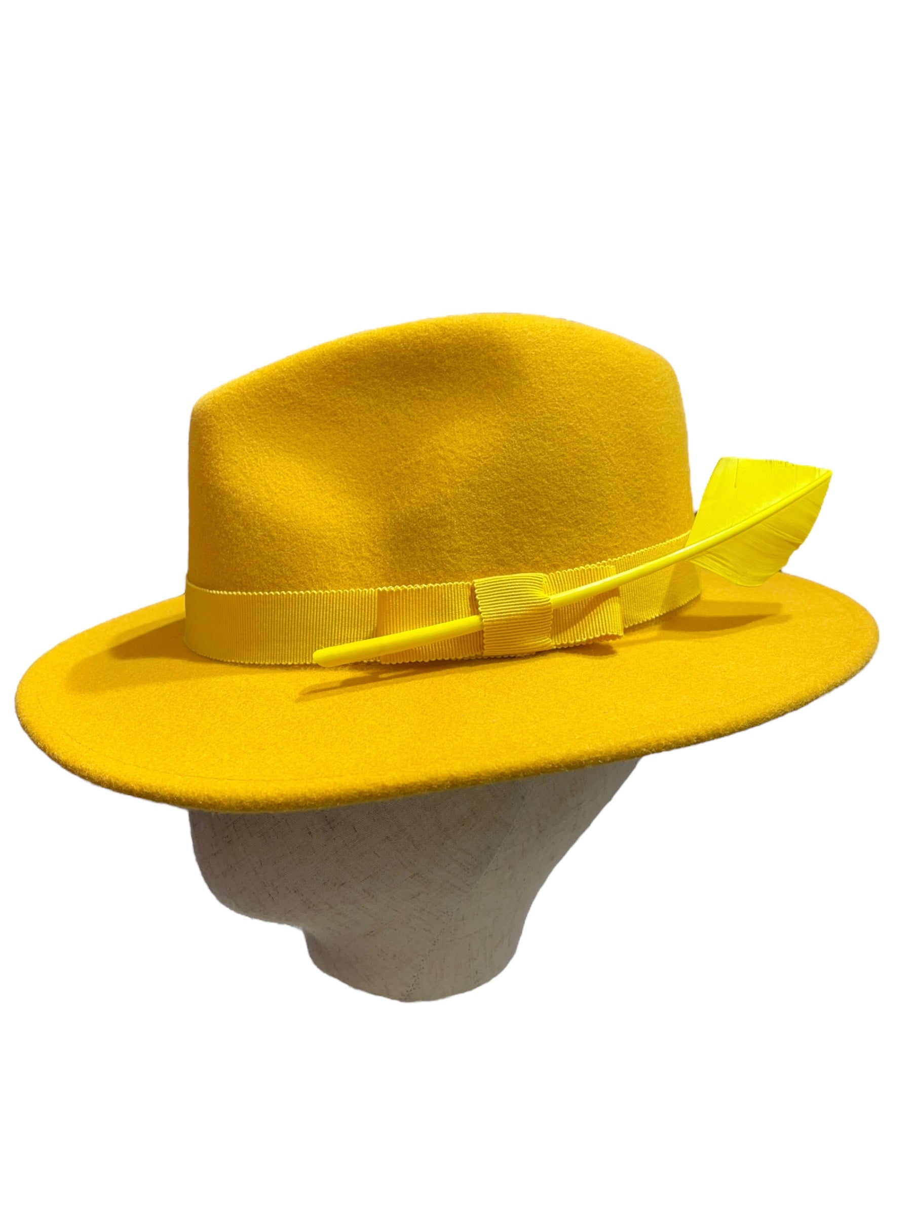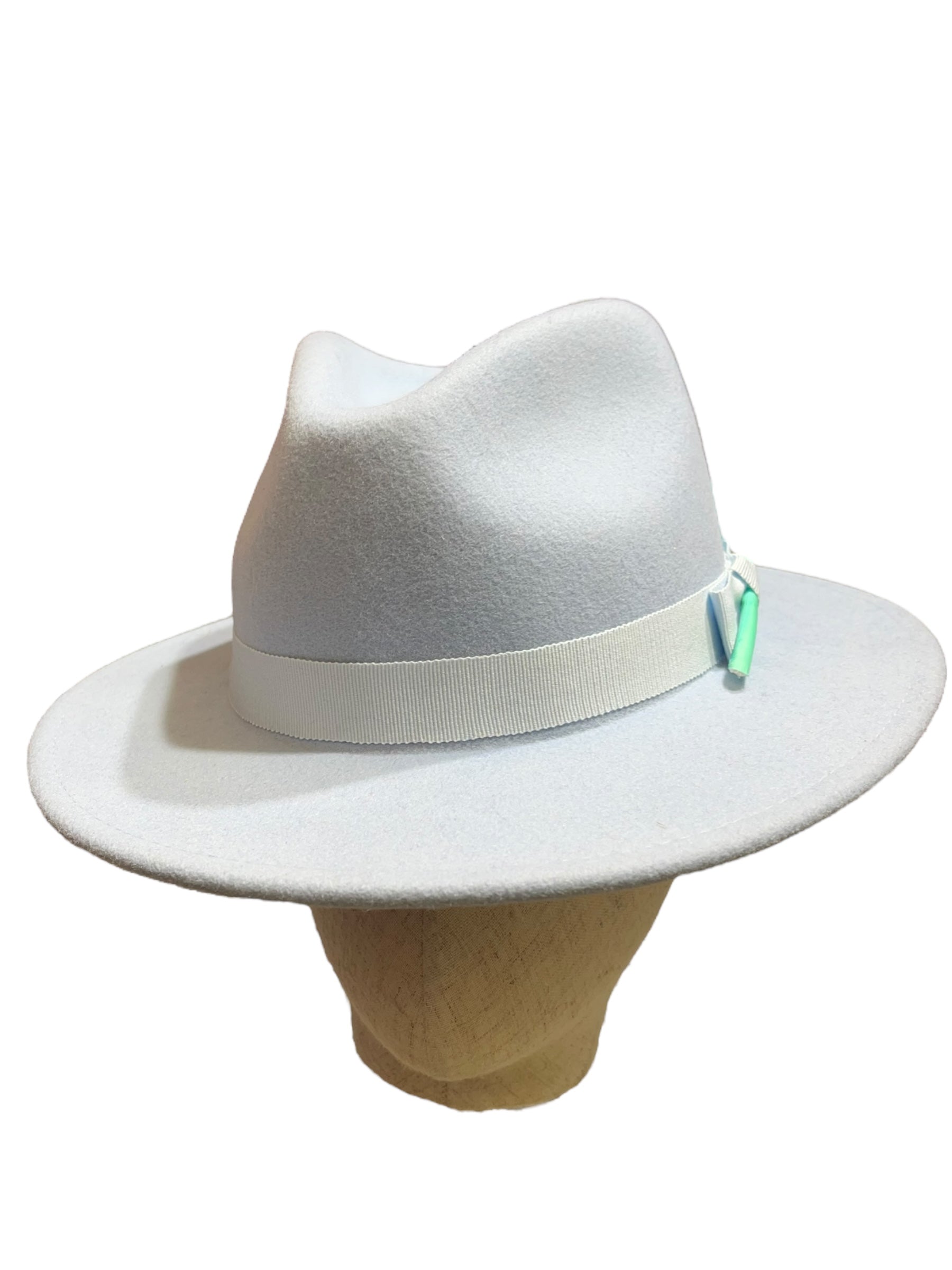 A W&B monochrome Merino wool felt fedora with a arrowhead turkey quill feather perfect for the winter day who need a splash of colour