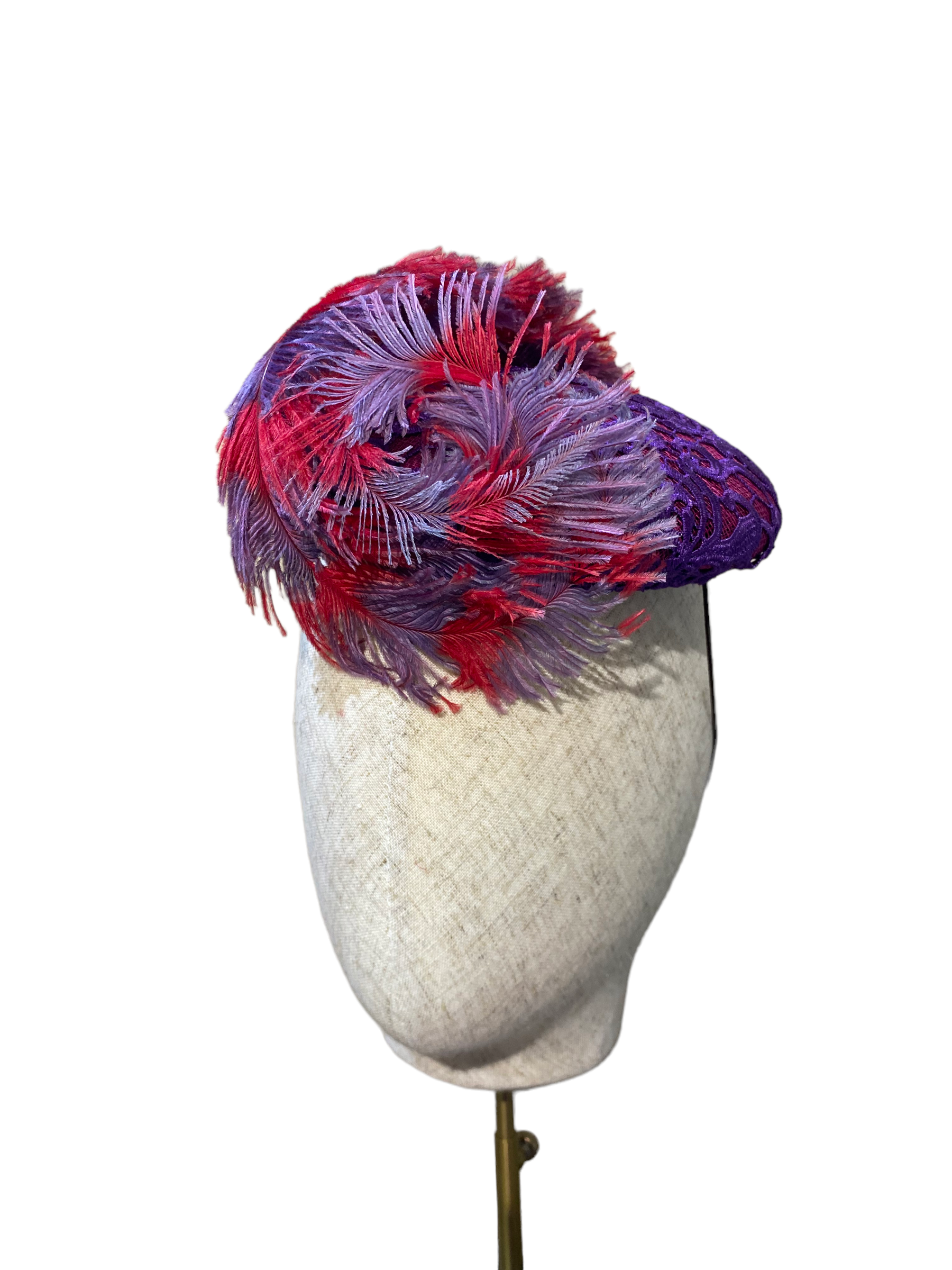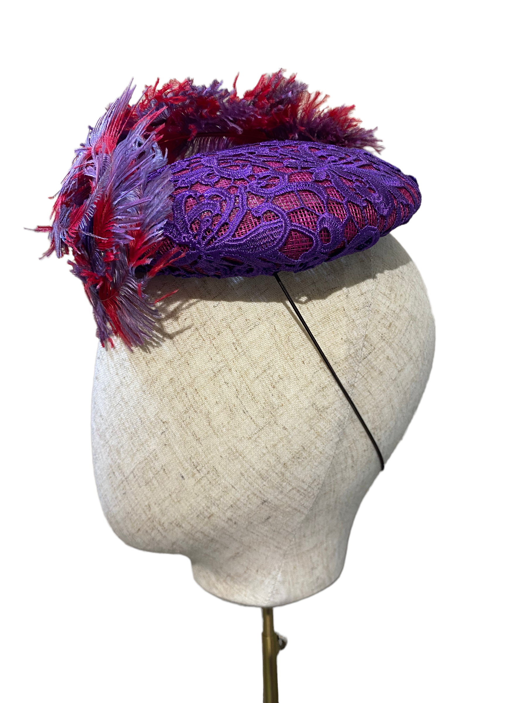 Lilac and red meet in this fun pillbox style with antique lace embroidery