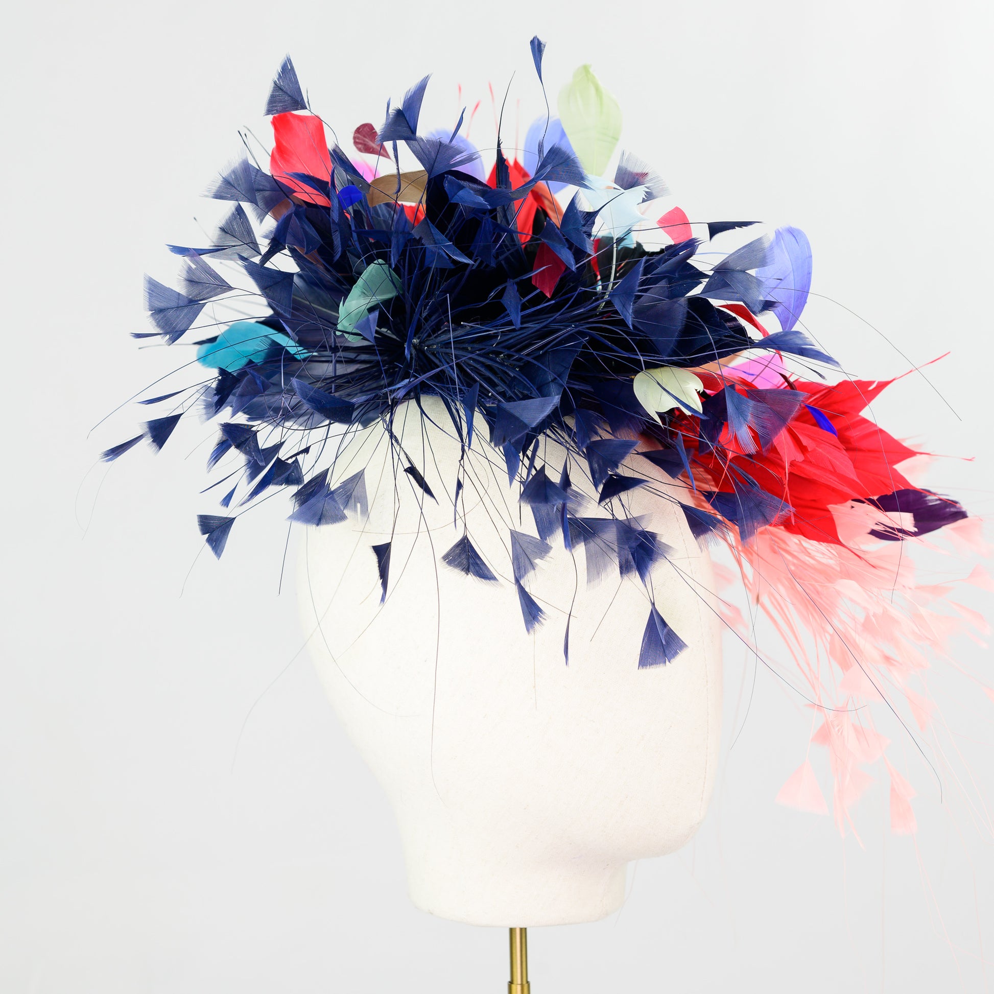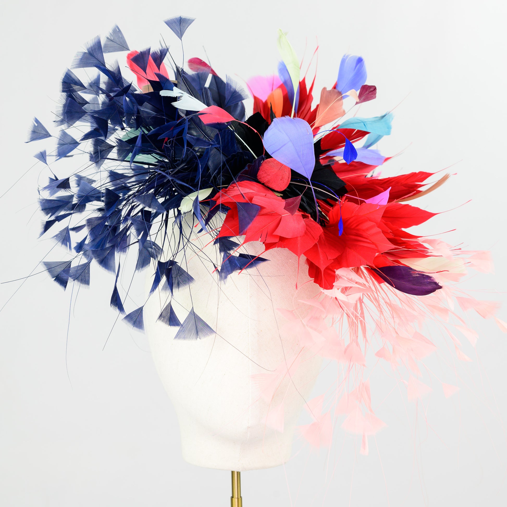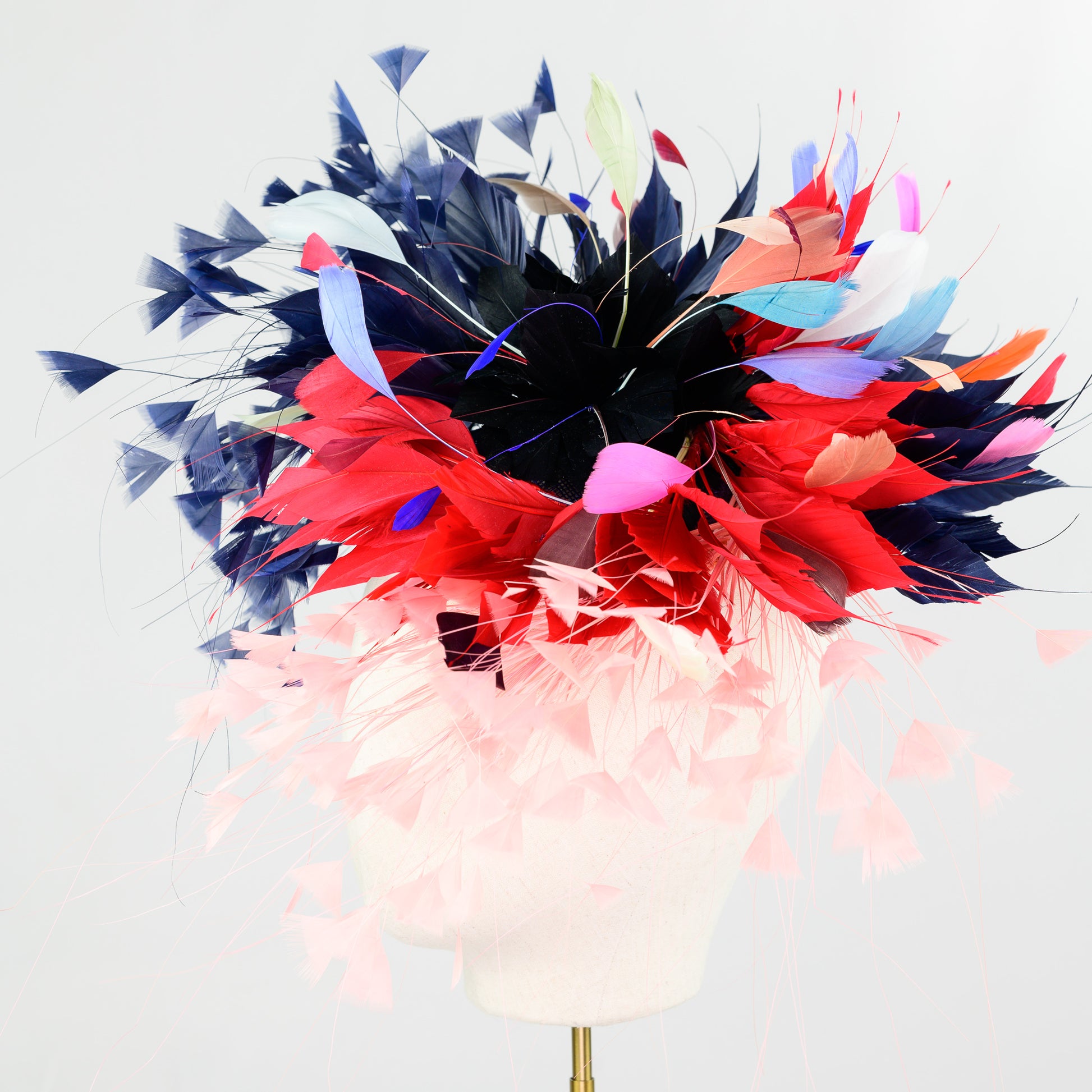 Material : On a base of sinamay an explosion of feather there is goose, cocque and burnt peacock, goose nagorie creating a vibrant composition