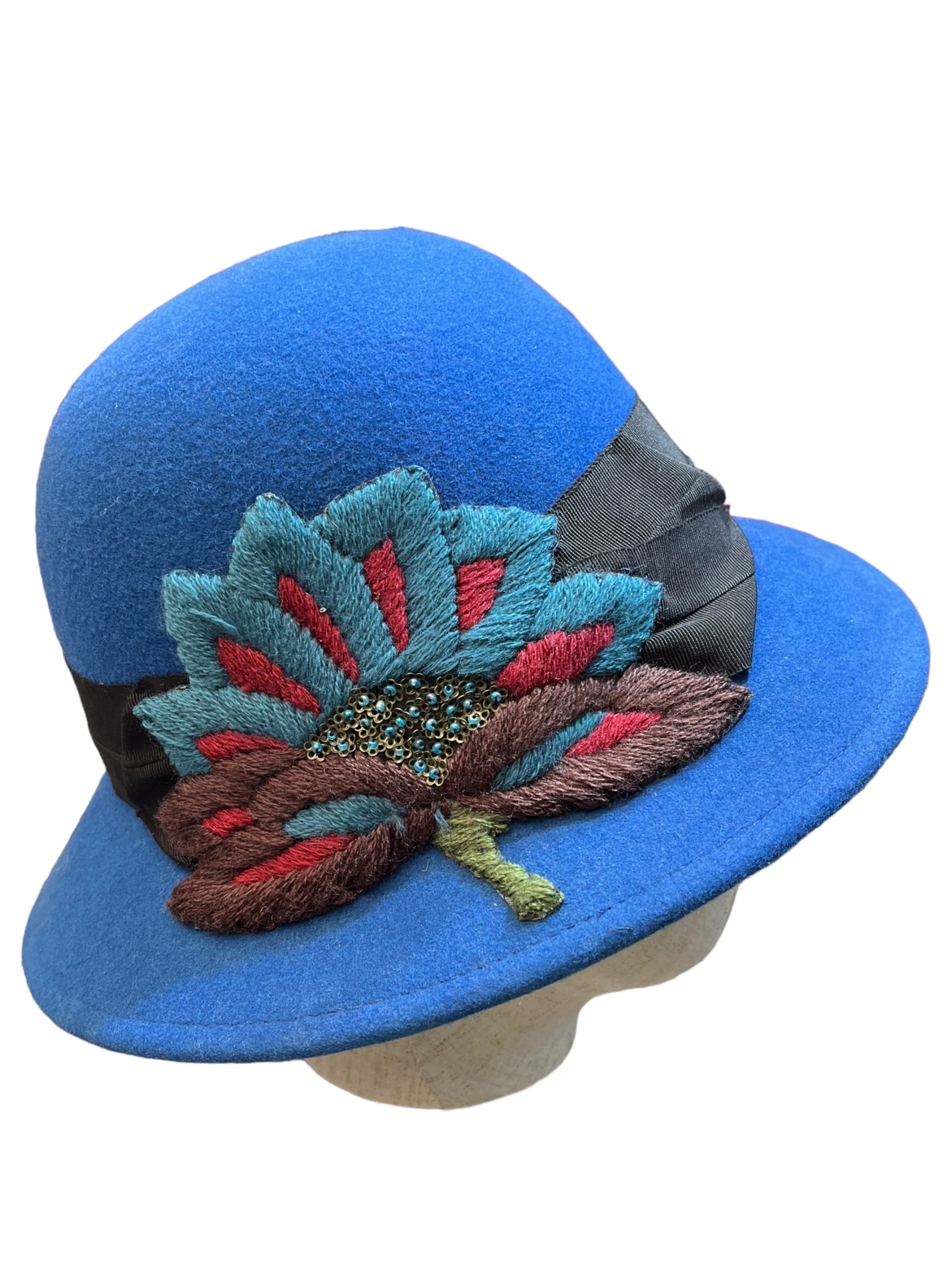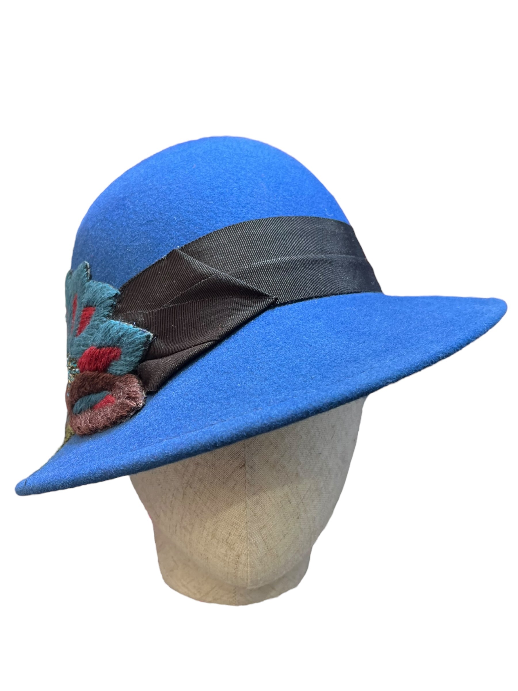 W&B cloche made in merino wool with a 1970s handmade wool embroidery patch, its one size adjustable