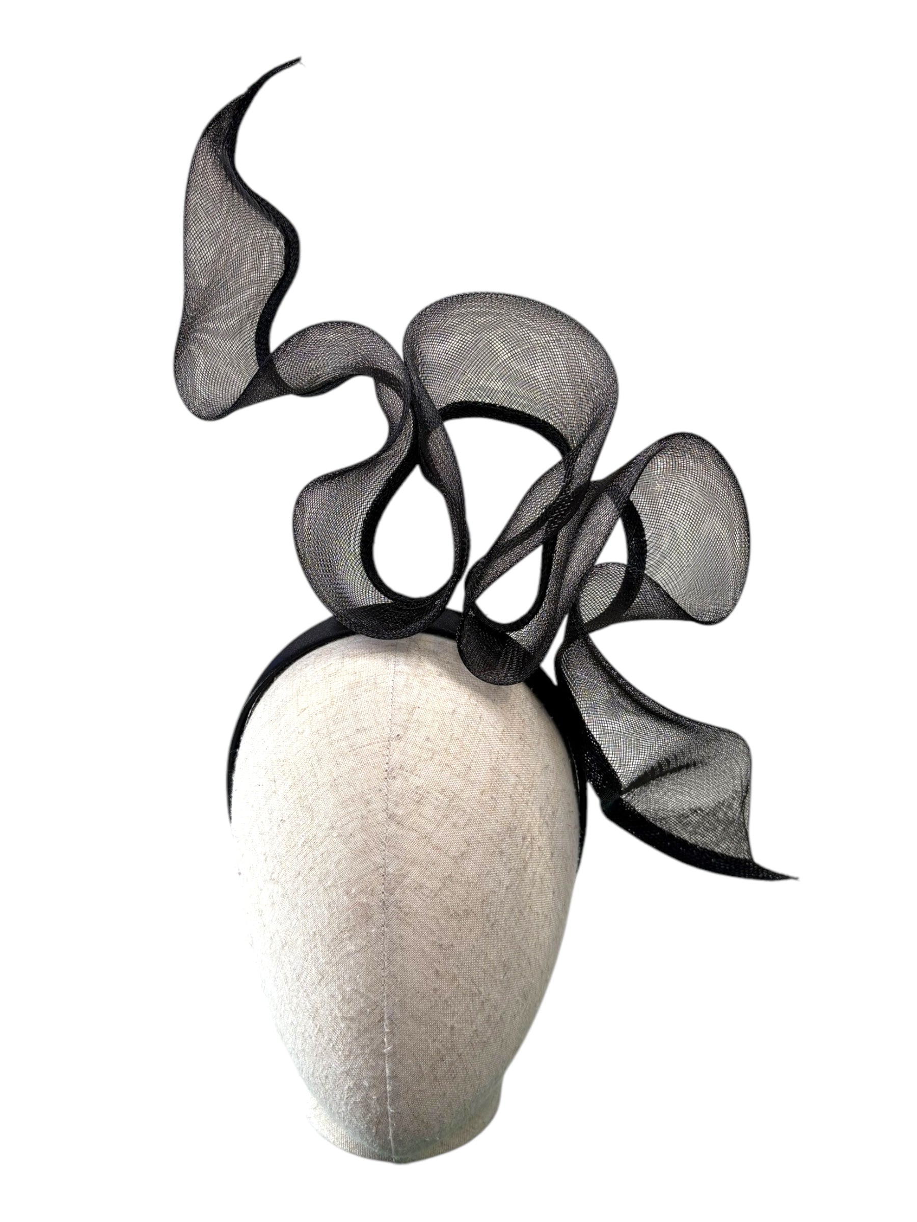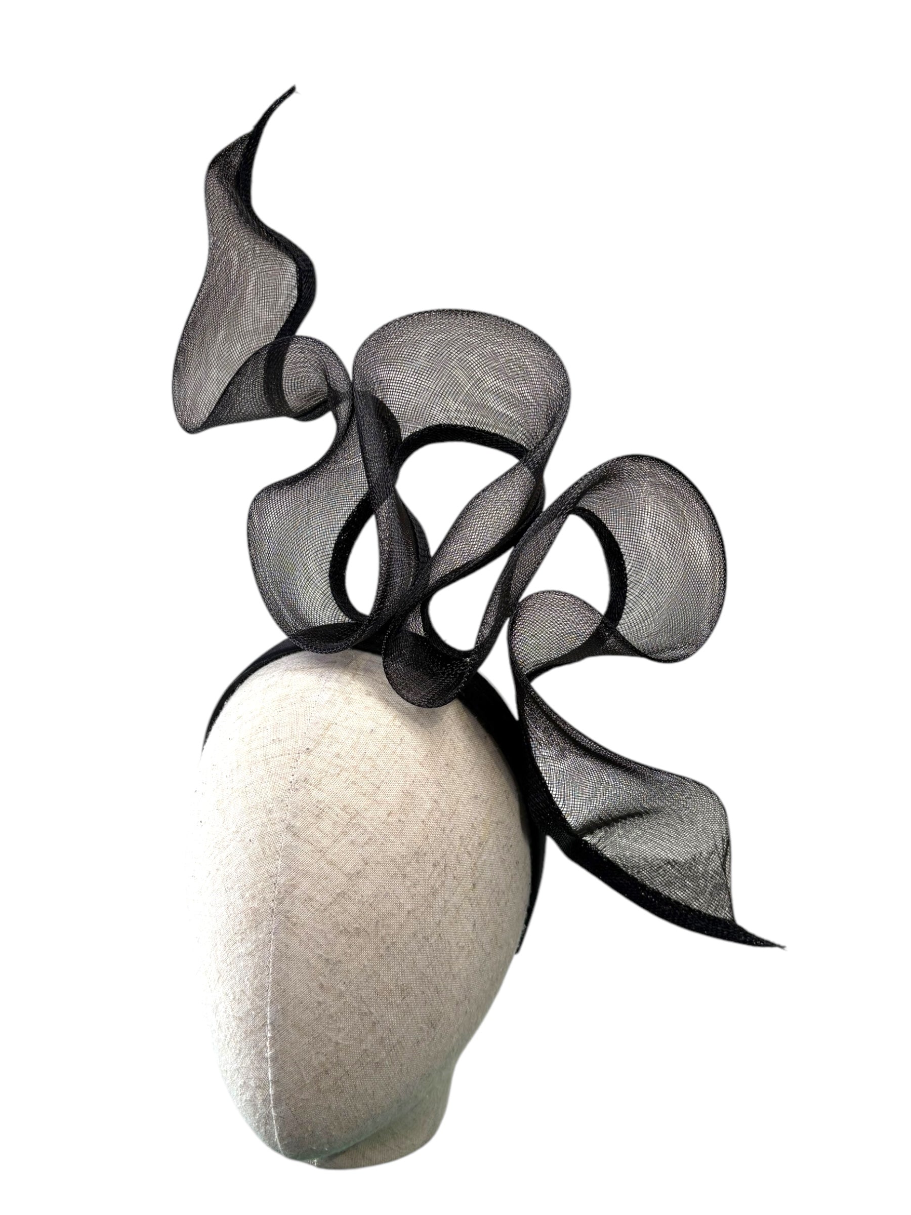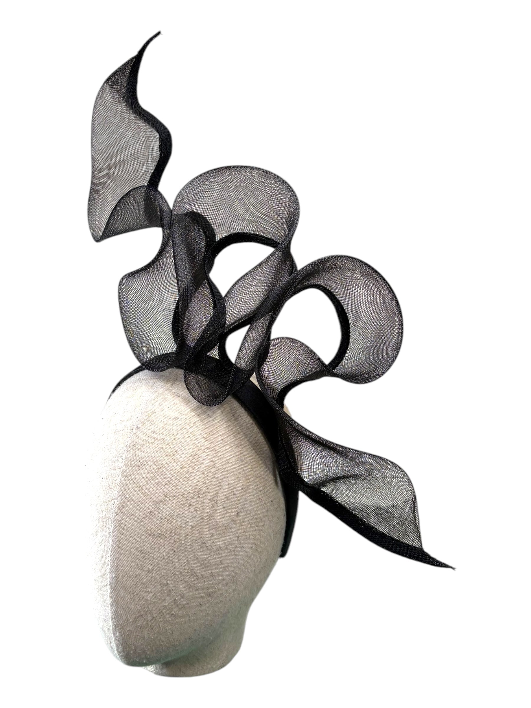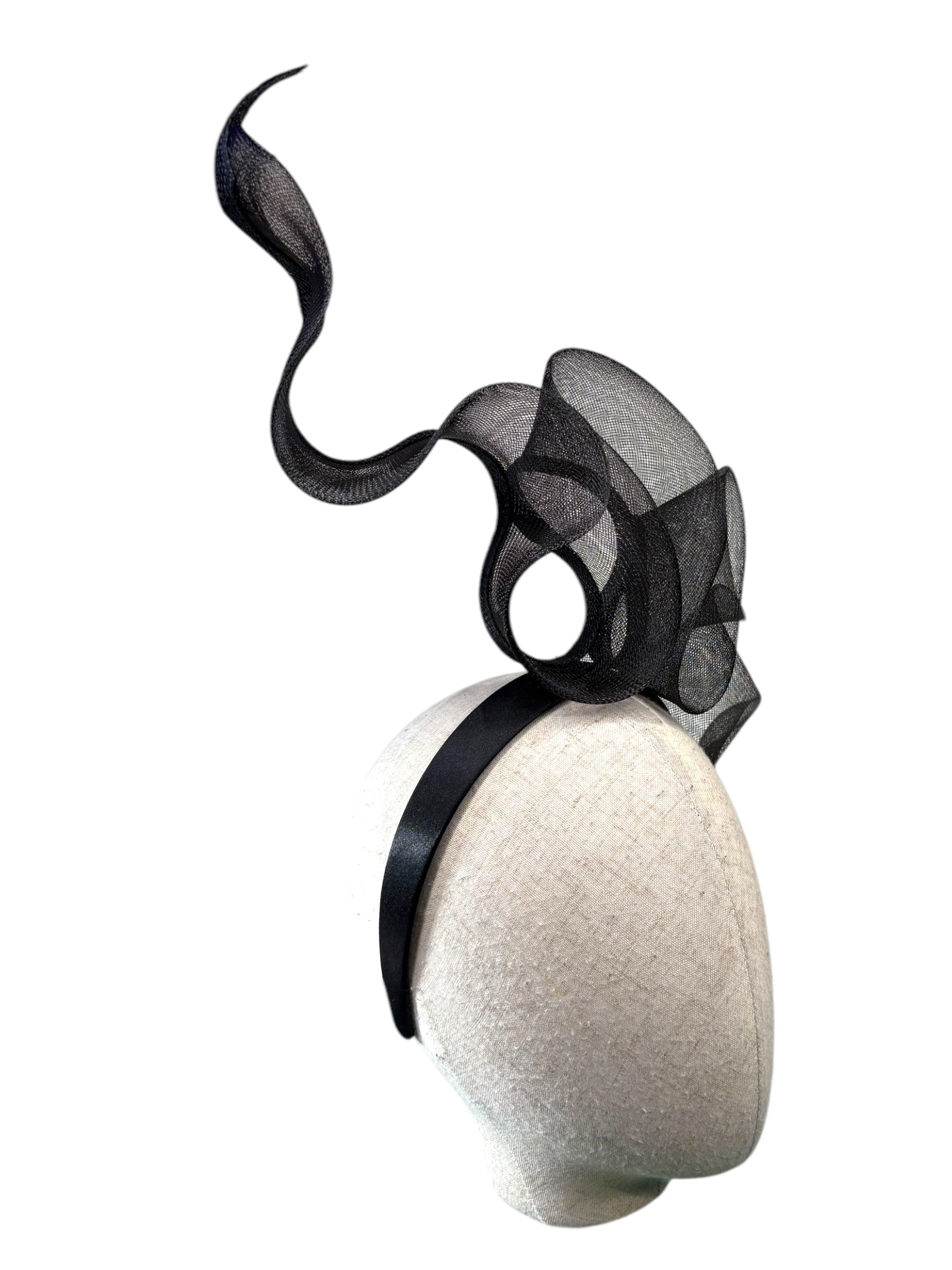 The wave style modern twirling fascinator made of black Crinoline and sinamay with a satin black headband