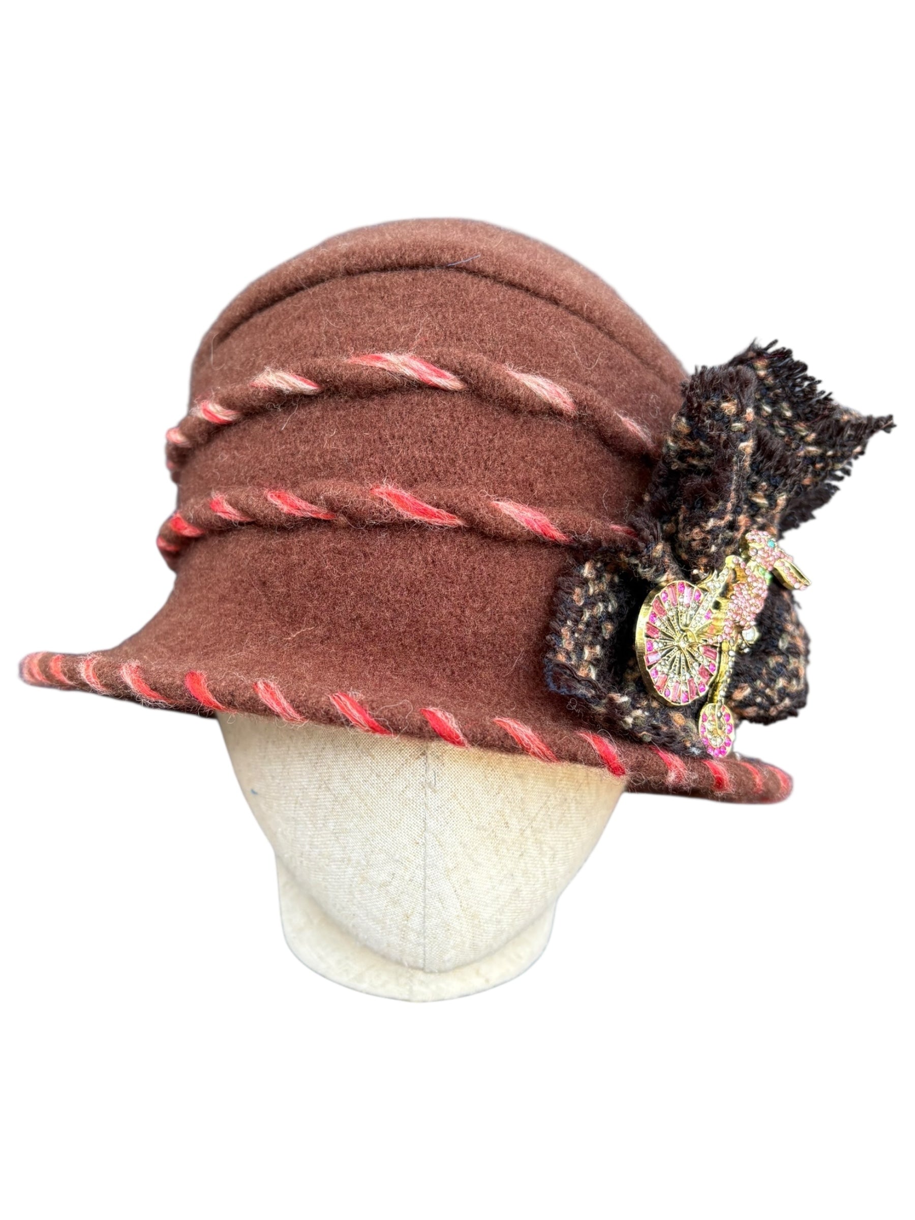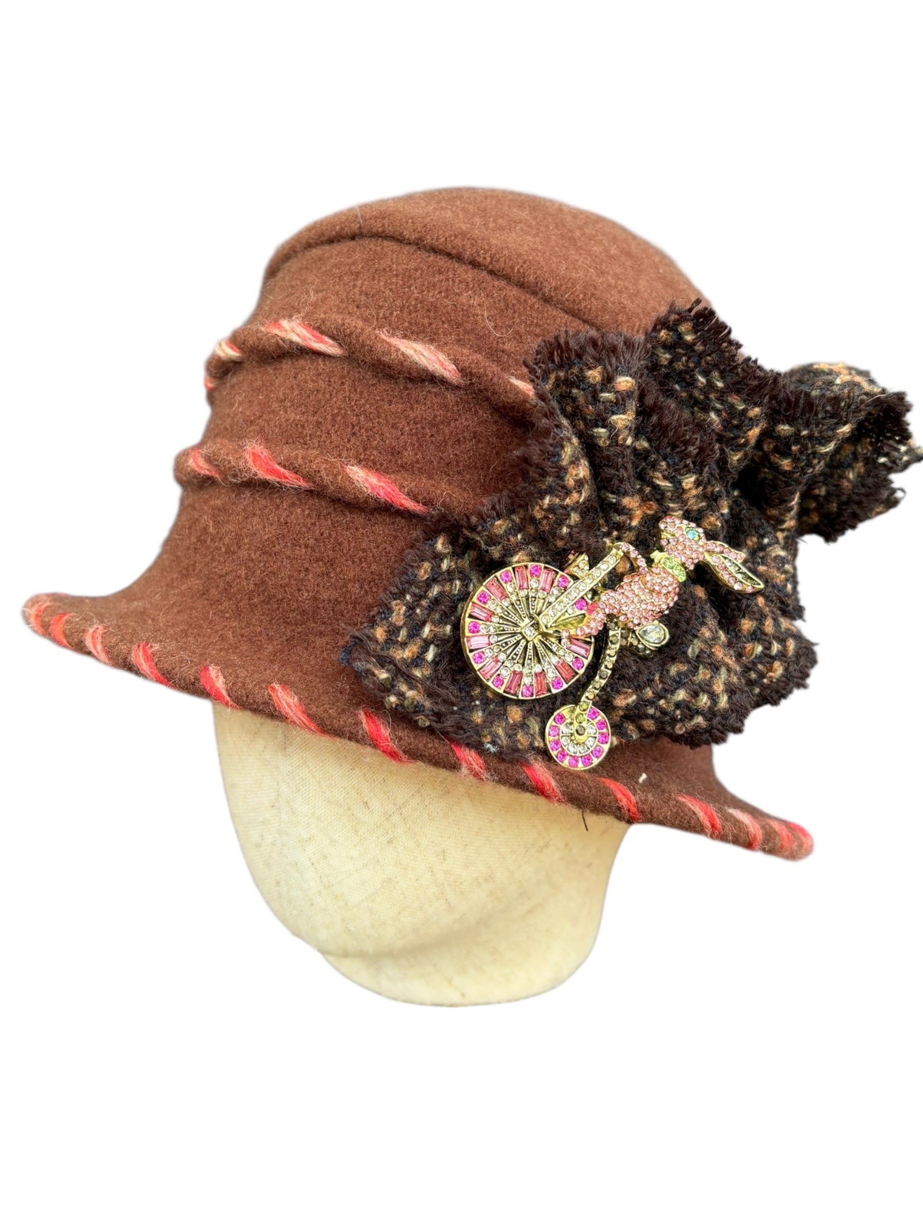 To care for your unique Madame Dippy cloche, we recommend a hand wash and then towel it dry, like a delicate jumper. Let it dry naturally in the warm environment of your home away from sources of heat, such as radiators.