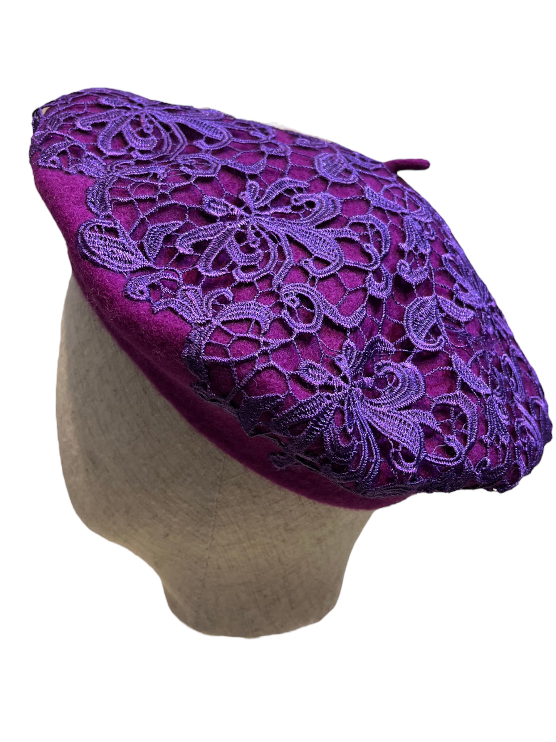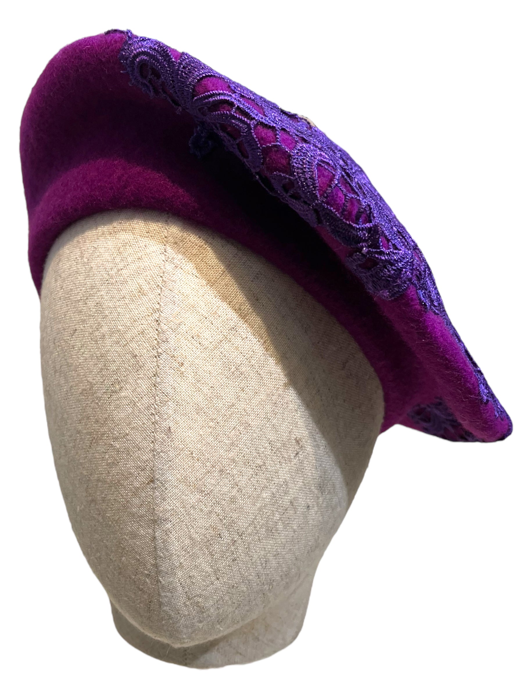 From the volcanic depths of my imagination and using a 100% pure merino wool, I decorate them with an exuberant combination of trimmings-beads, French Silk Lace or whatever takes my fantasy and just enjoy the blast of creativity and fun.