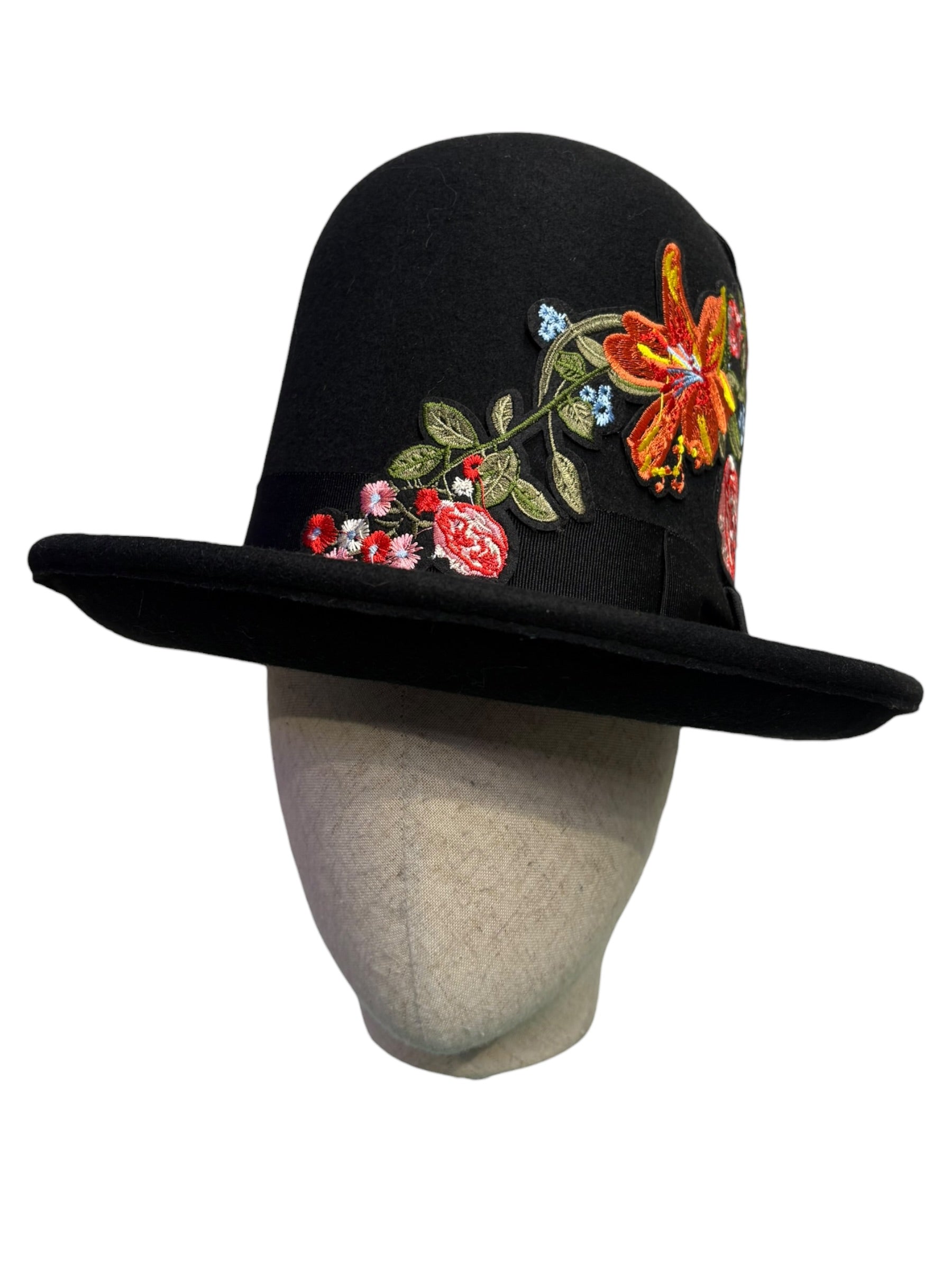 A unique Tall Bowler hat made in 100% pure black merino wool felt with a 1970s vintage silk embroidery