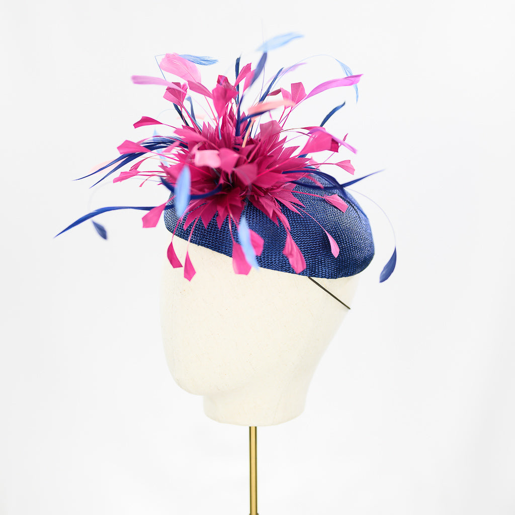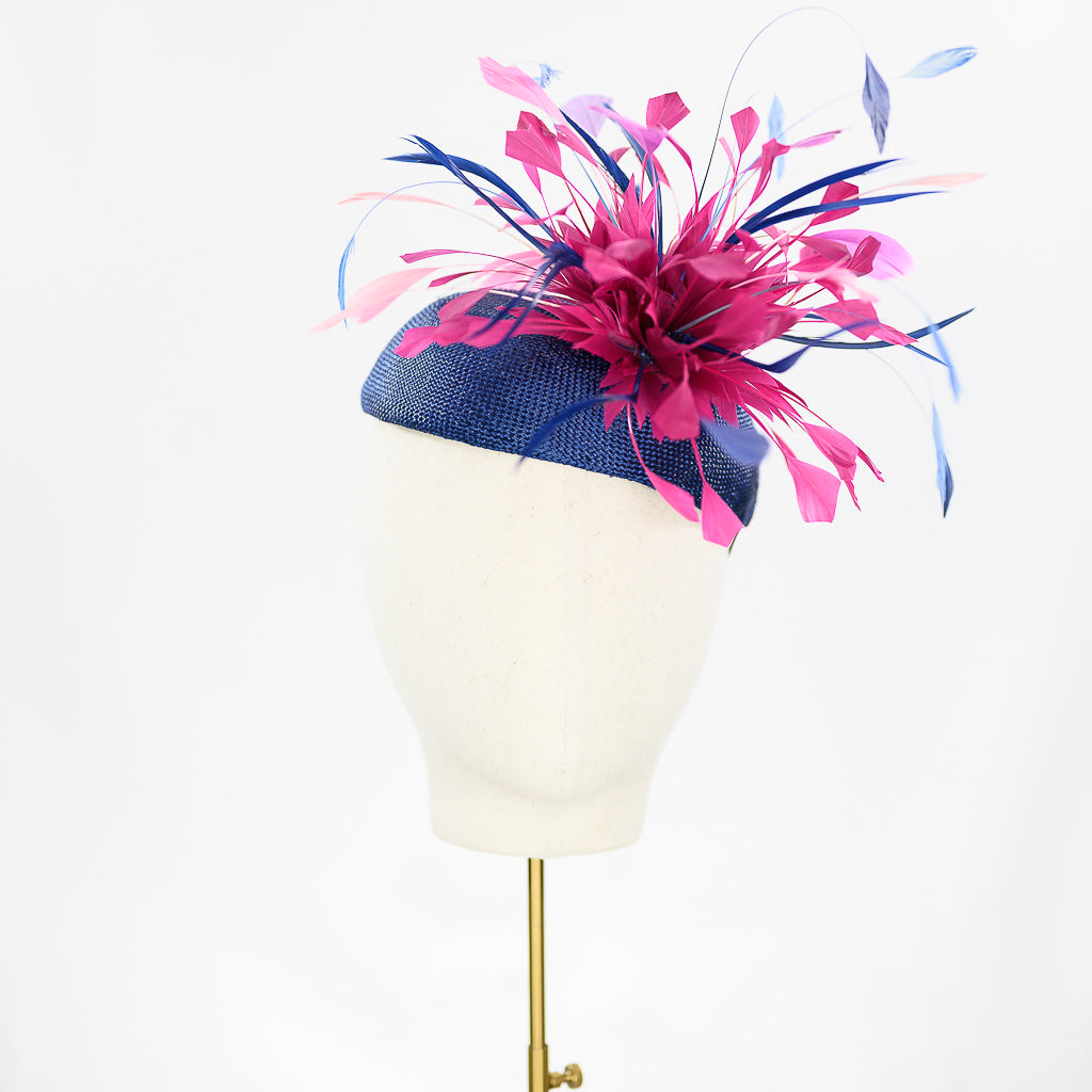 A hand blocked and made raffia button fascinator with a firework style explosion of feathers