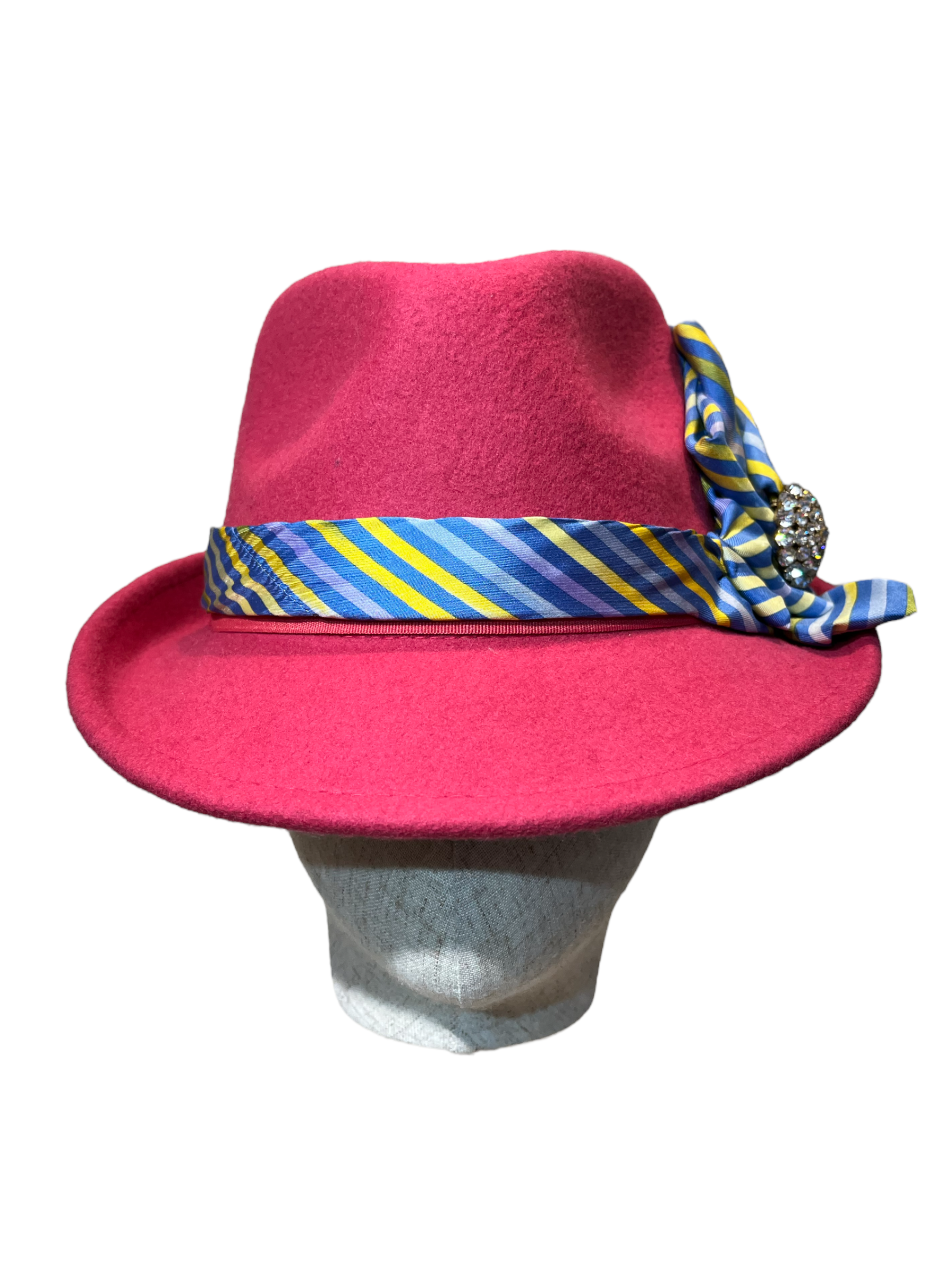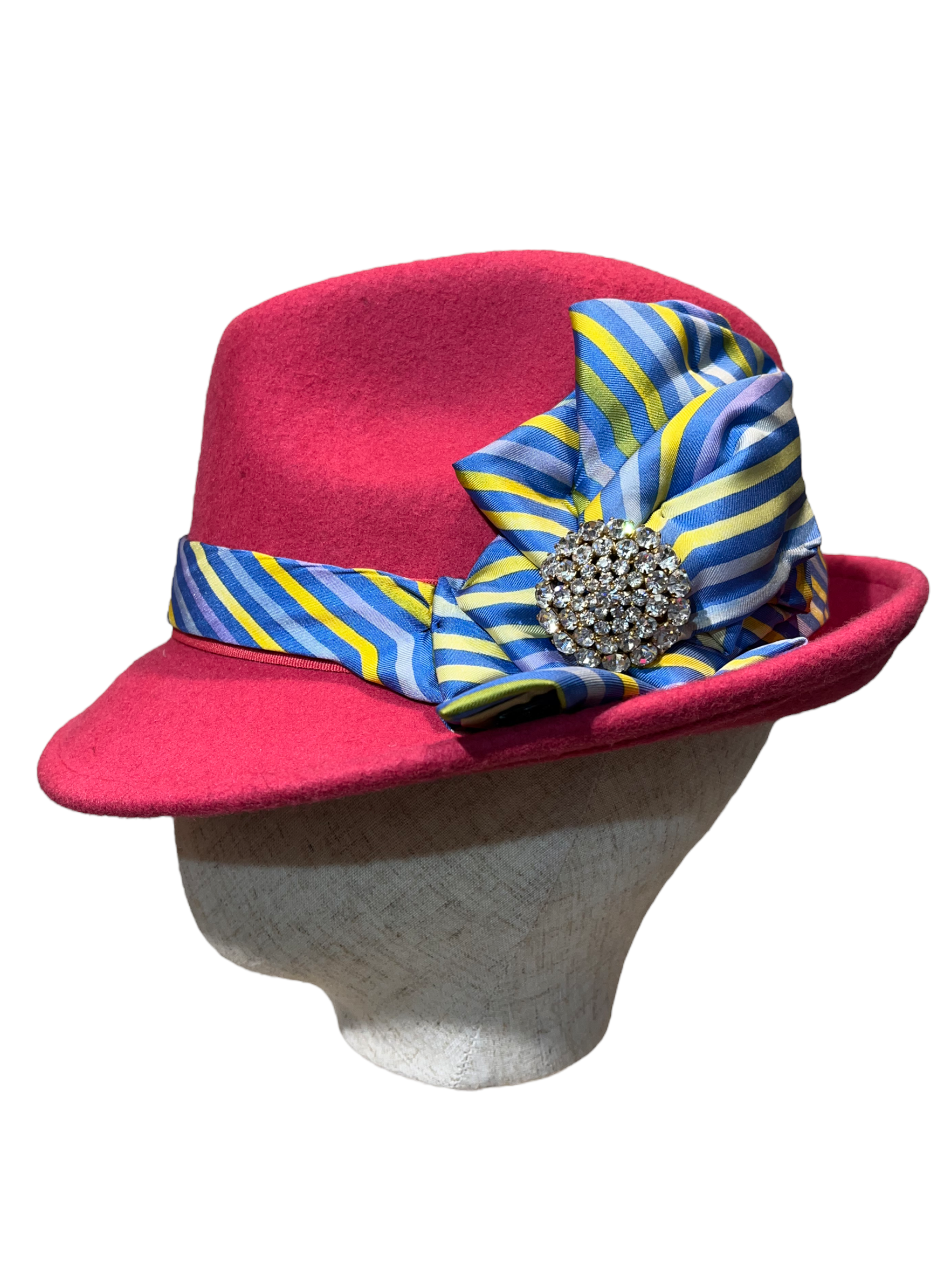 A warm pink merino wool felt Trilby with a silk tie and an original vintage brooch