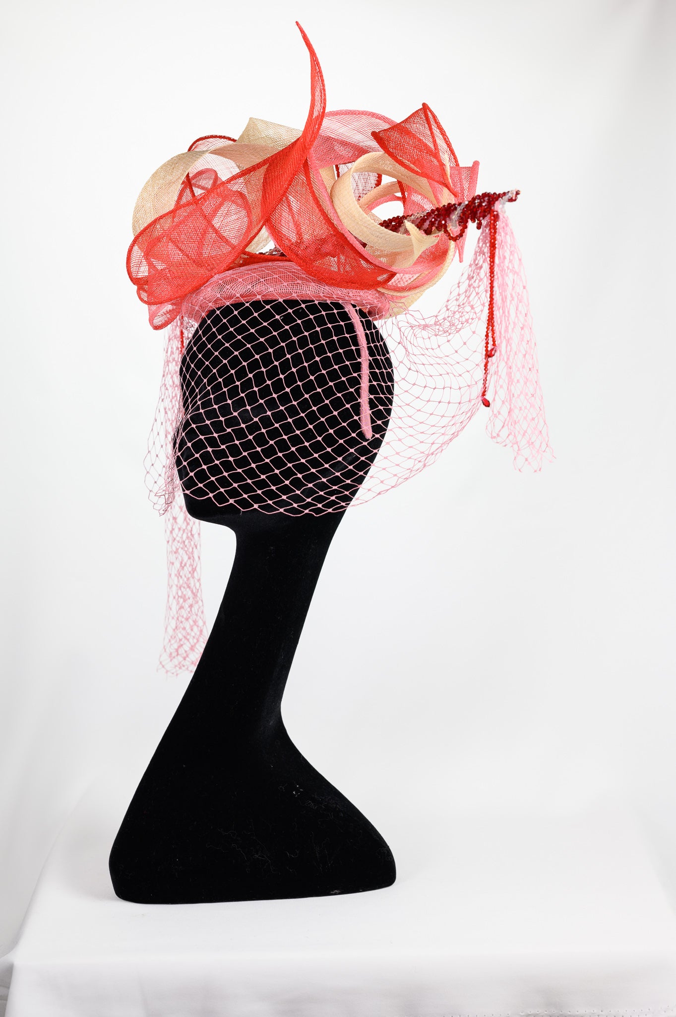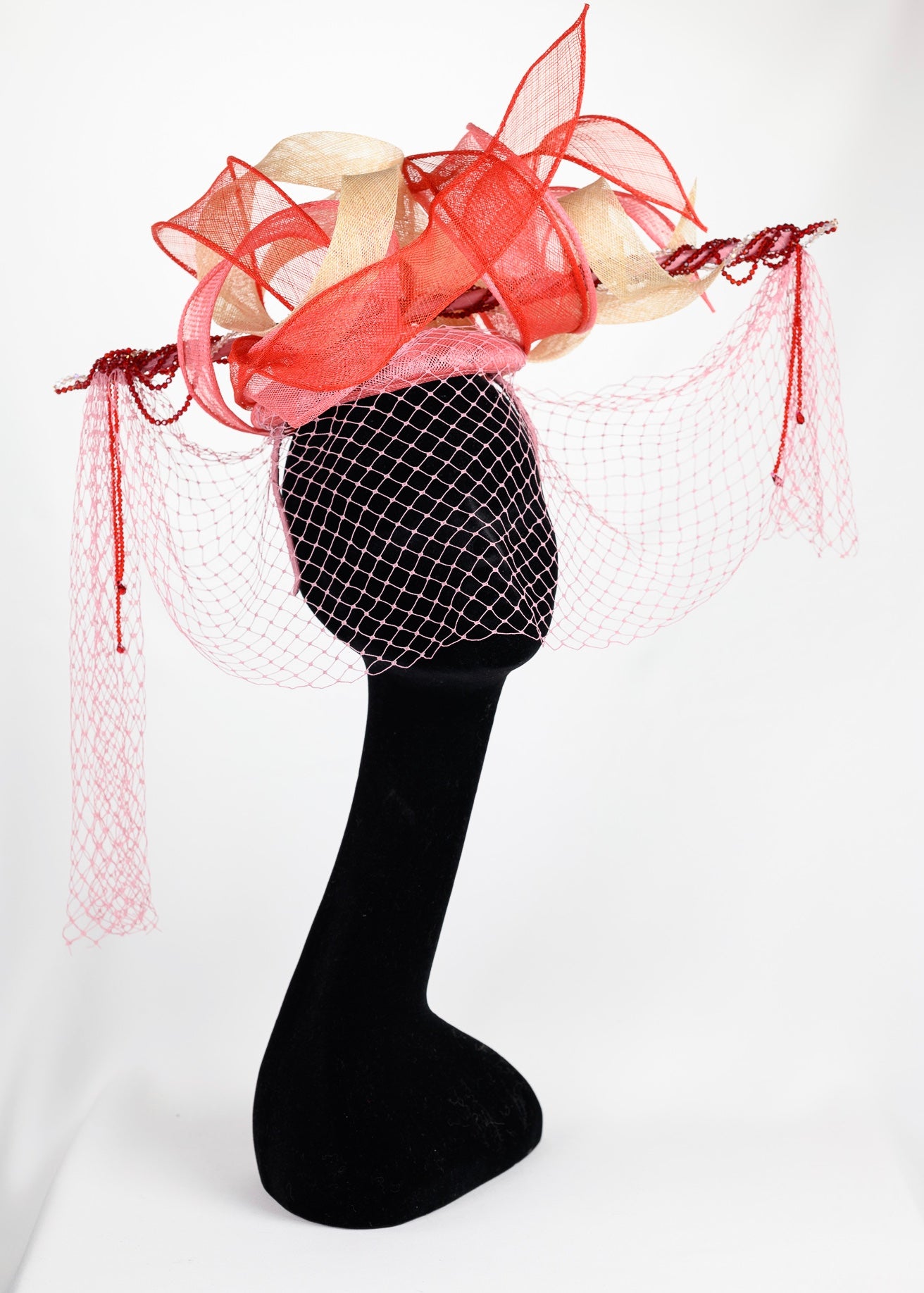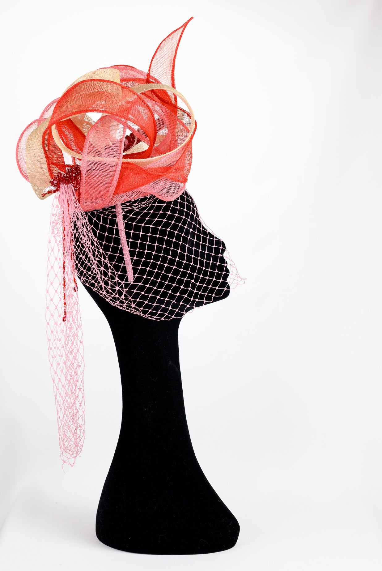 Material : 100% pure Sinamay (100% Vegan) petersham french Ribbon, a vintage 1950s powder pink veil and Swarovski red crystals
