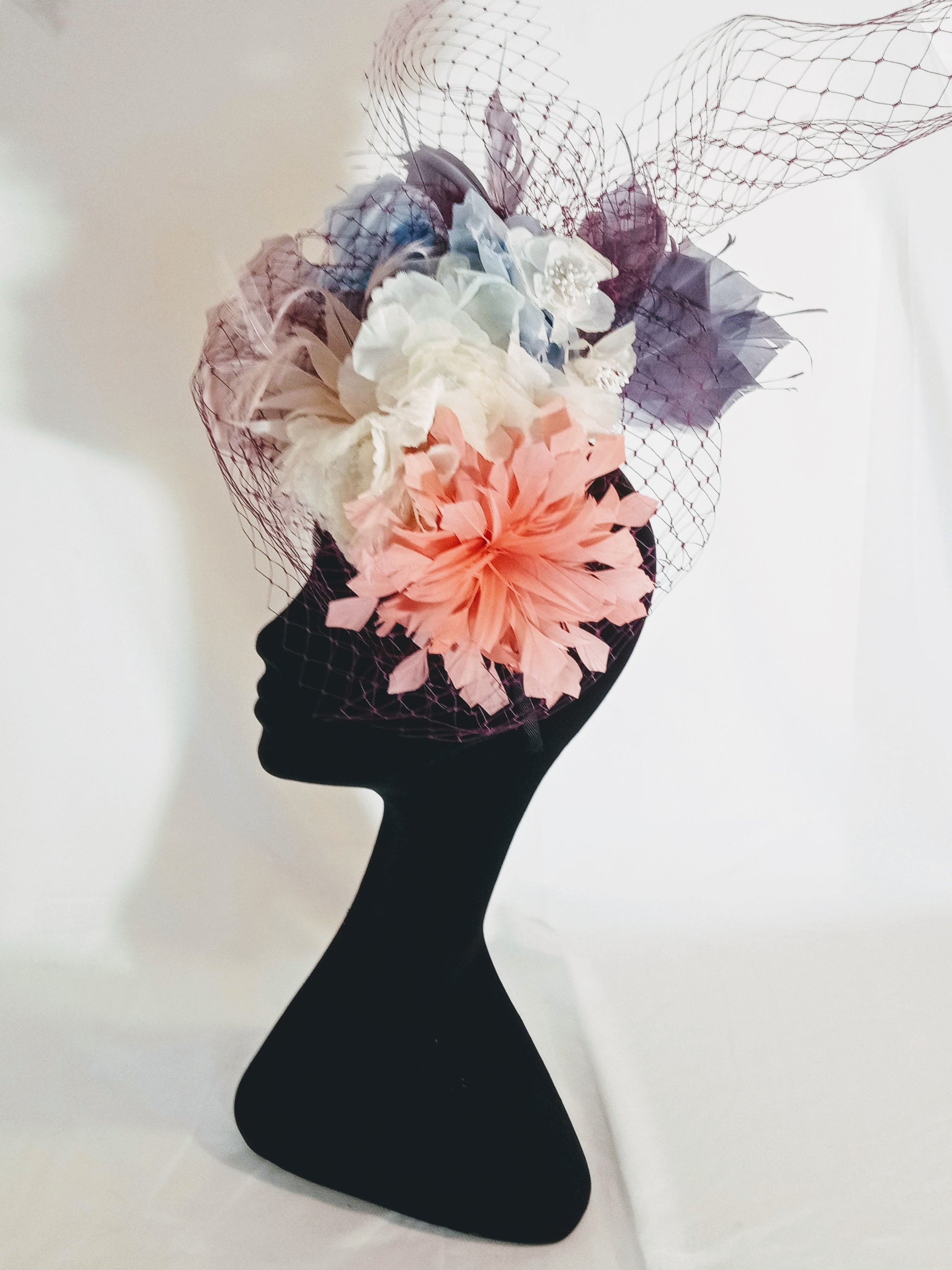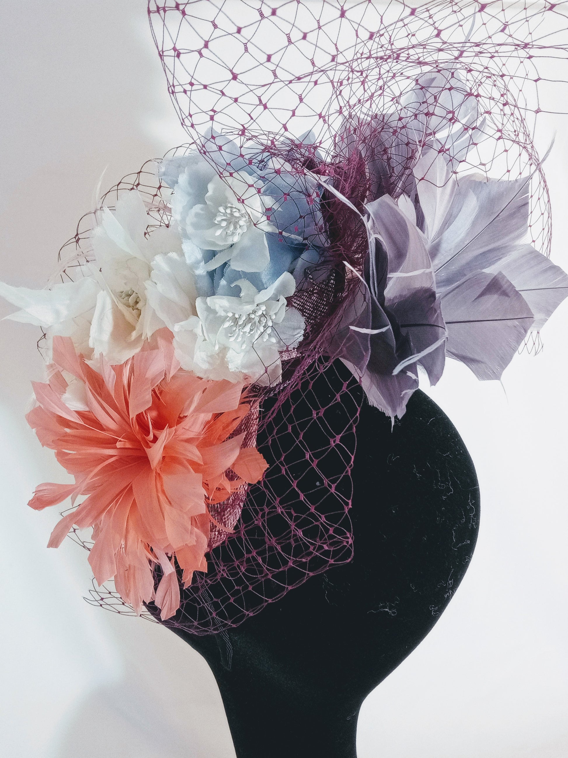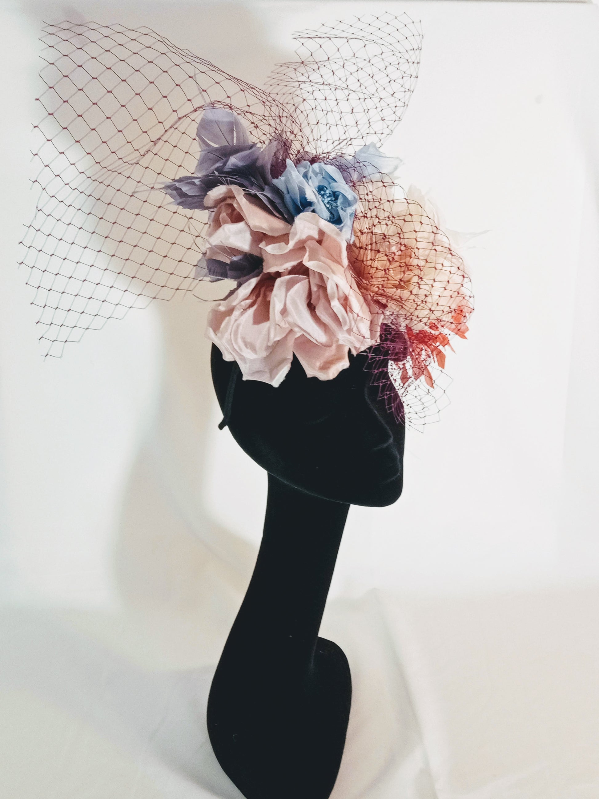 Perfect for a day at the races or a wedding, here a fascinator made with a mix of organza silk flowers and rooster feathers with a 1950s vintage veil.