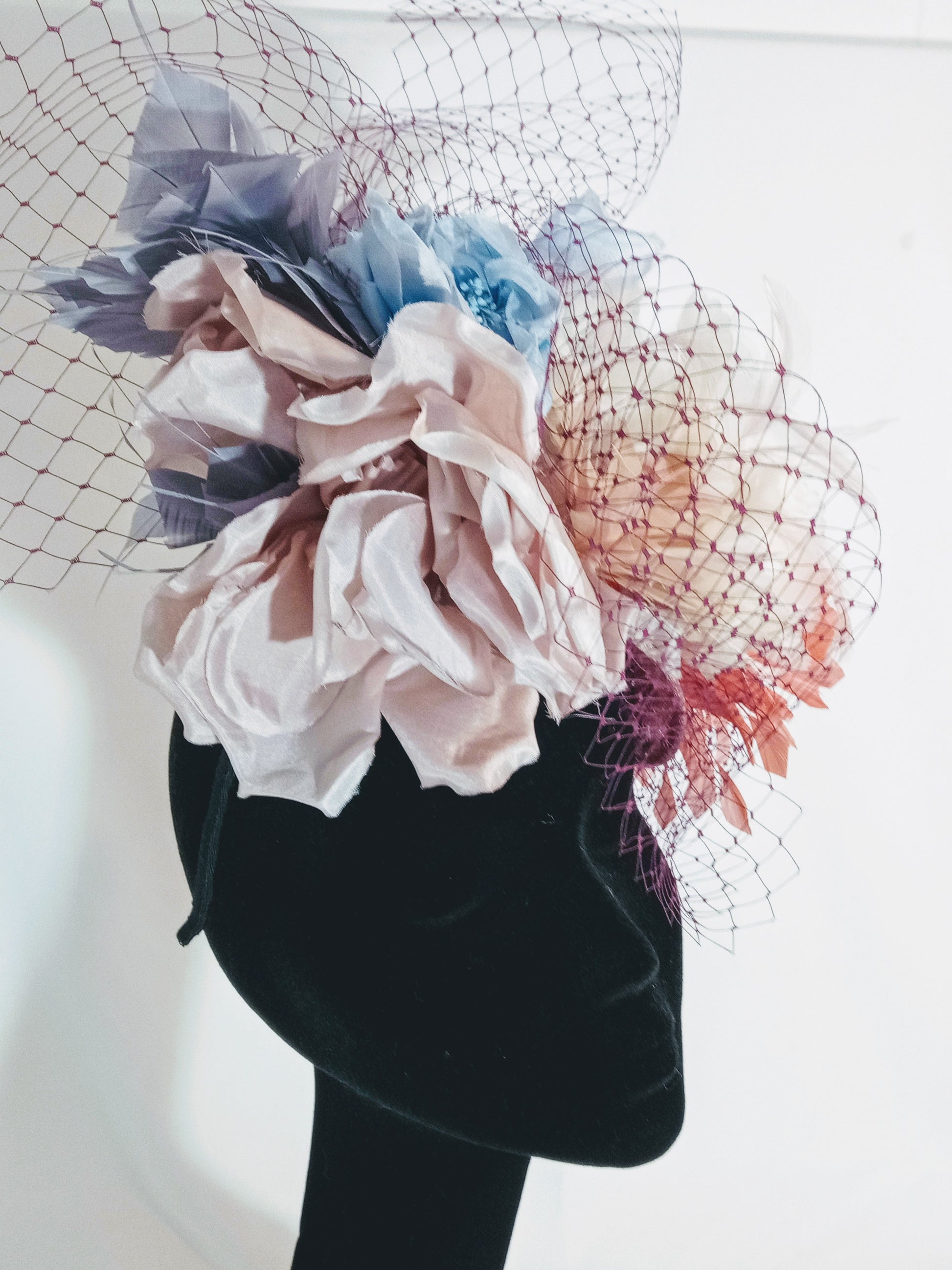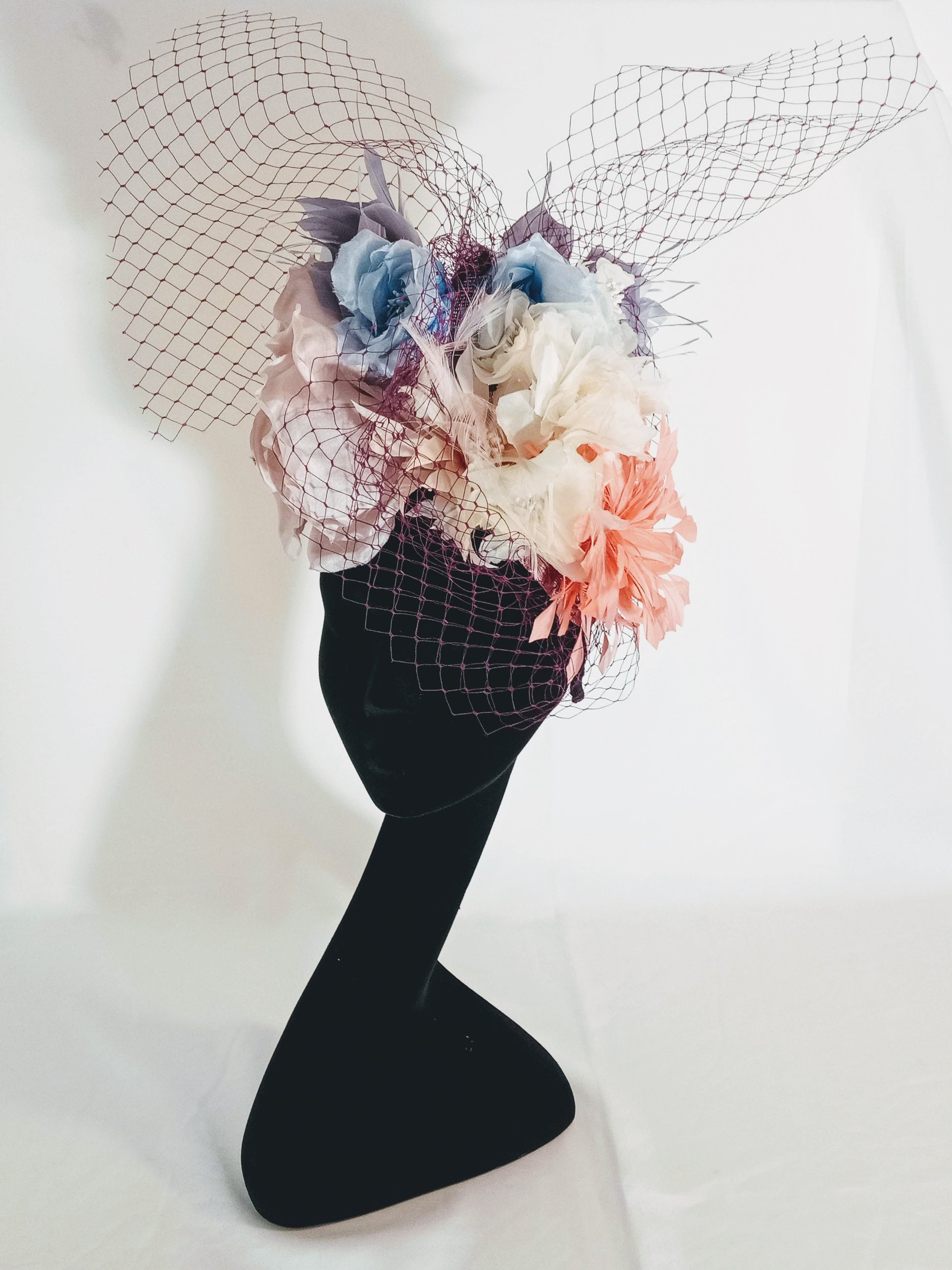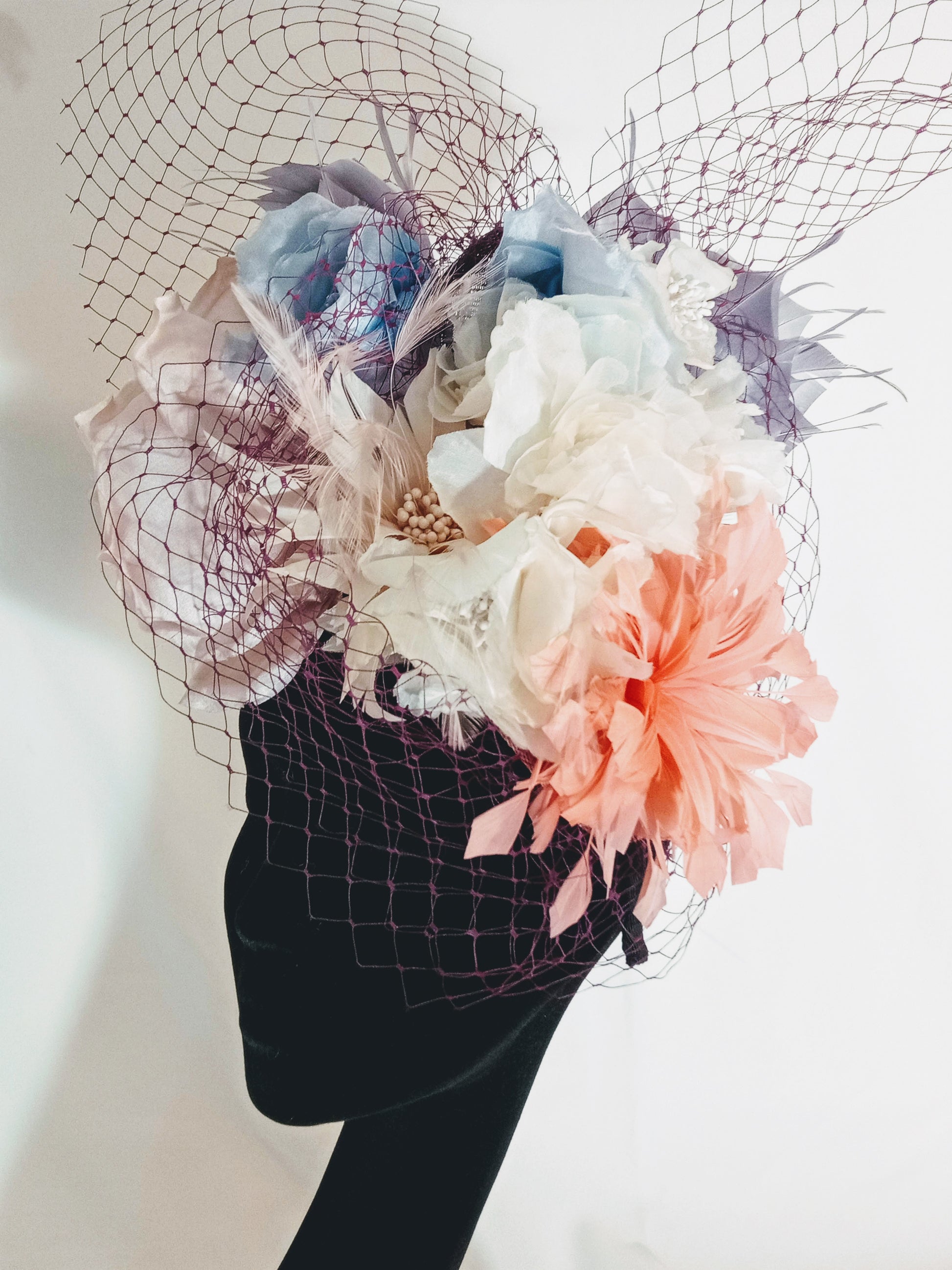 Perfect for a day at the races or a wedding, here a fascinator made with a mix of organza silk flowers and rooster feathers with a 1950s vintage veil.