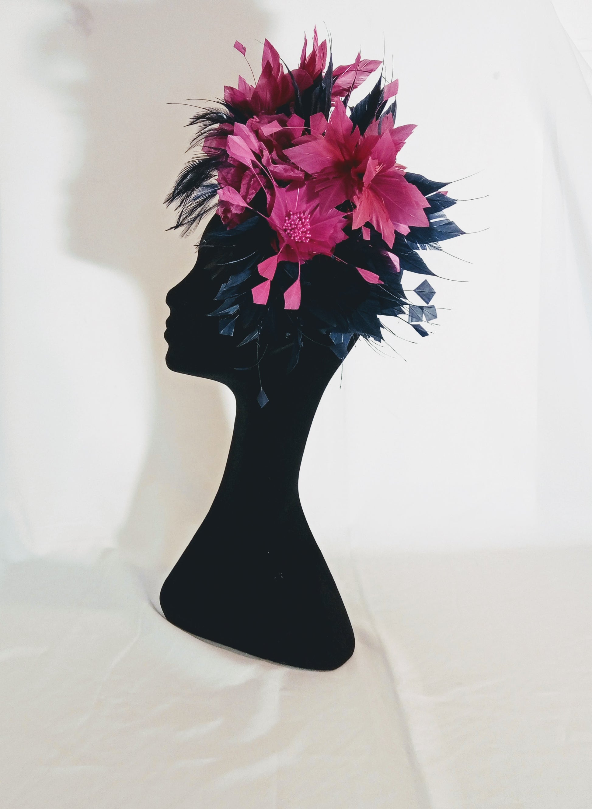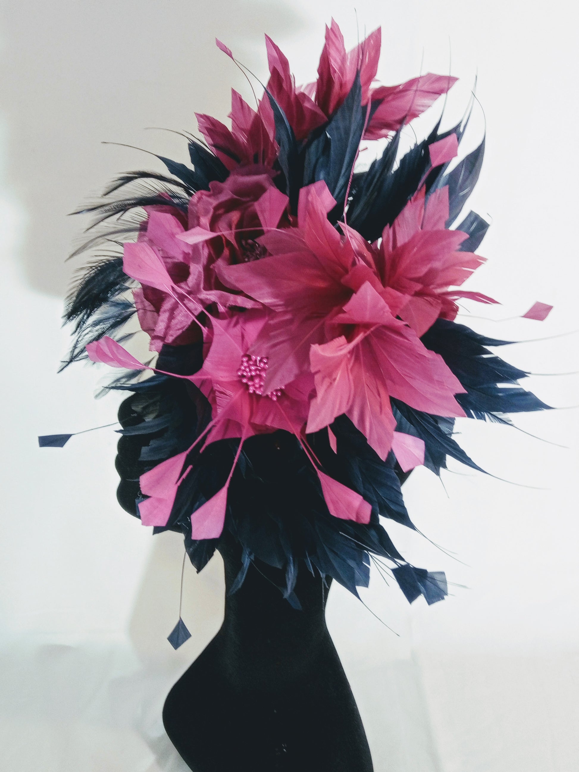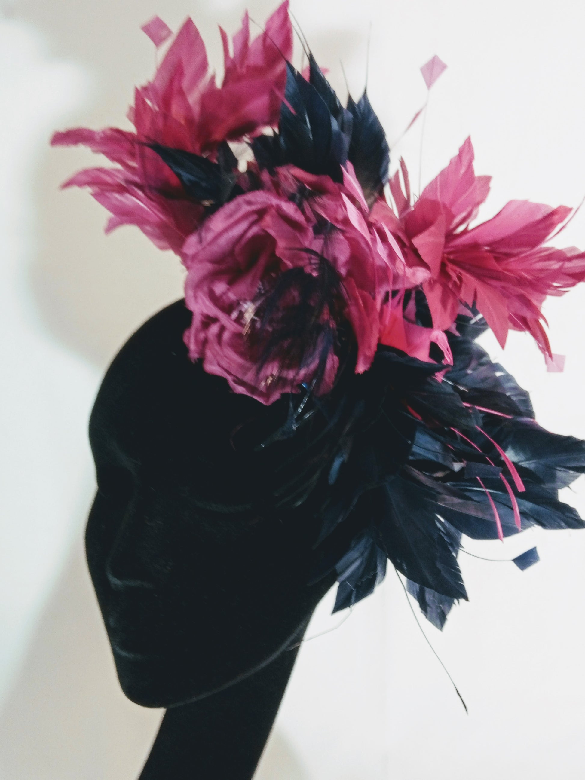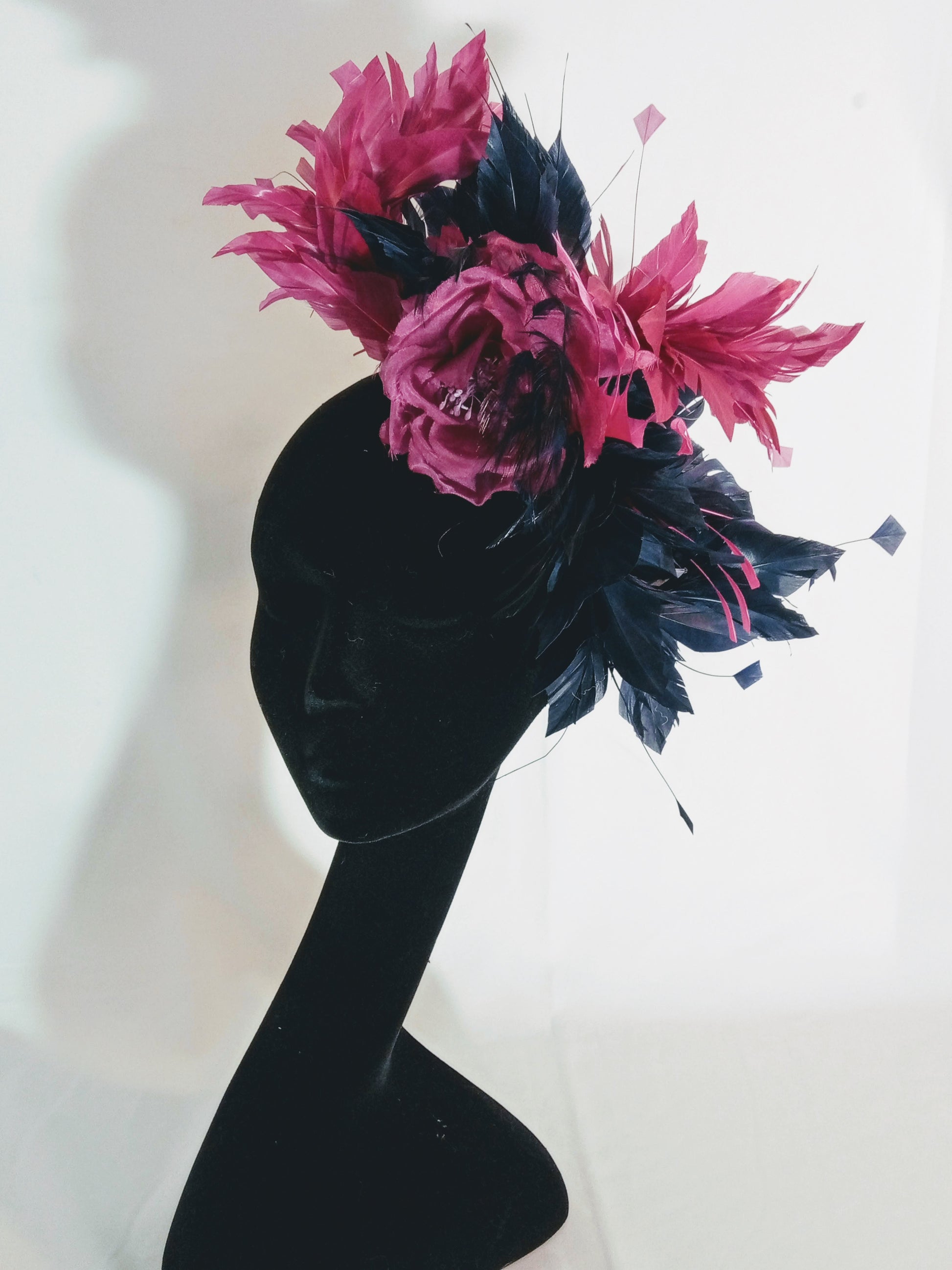 Perfect for a day at the races or a wedding, here a blue and Fuchsia Alice band fascinator made of a celebration of feather and organza silk flower.