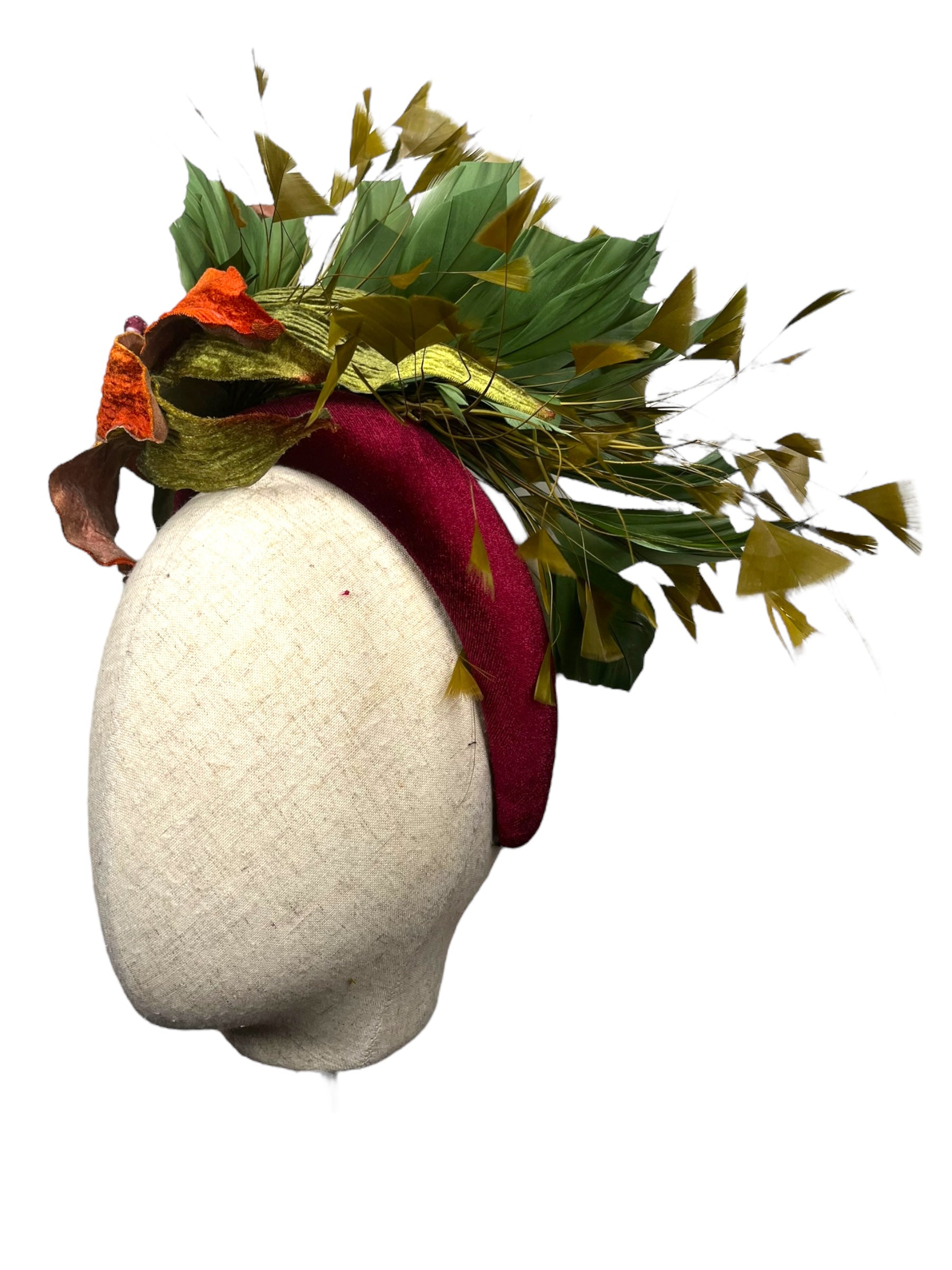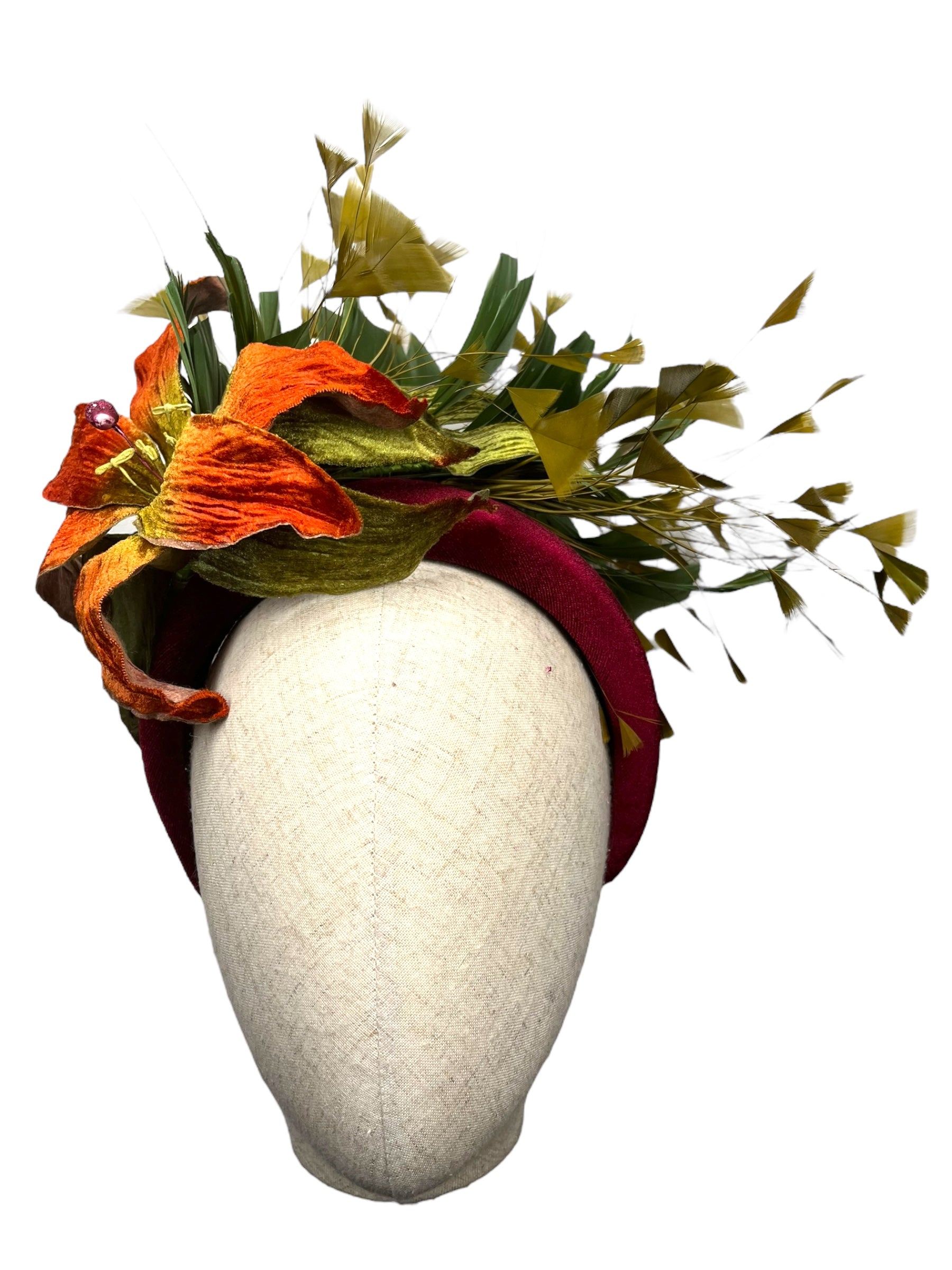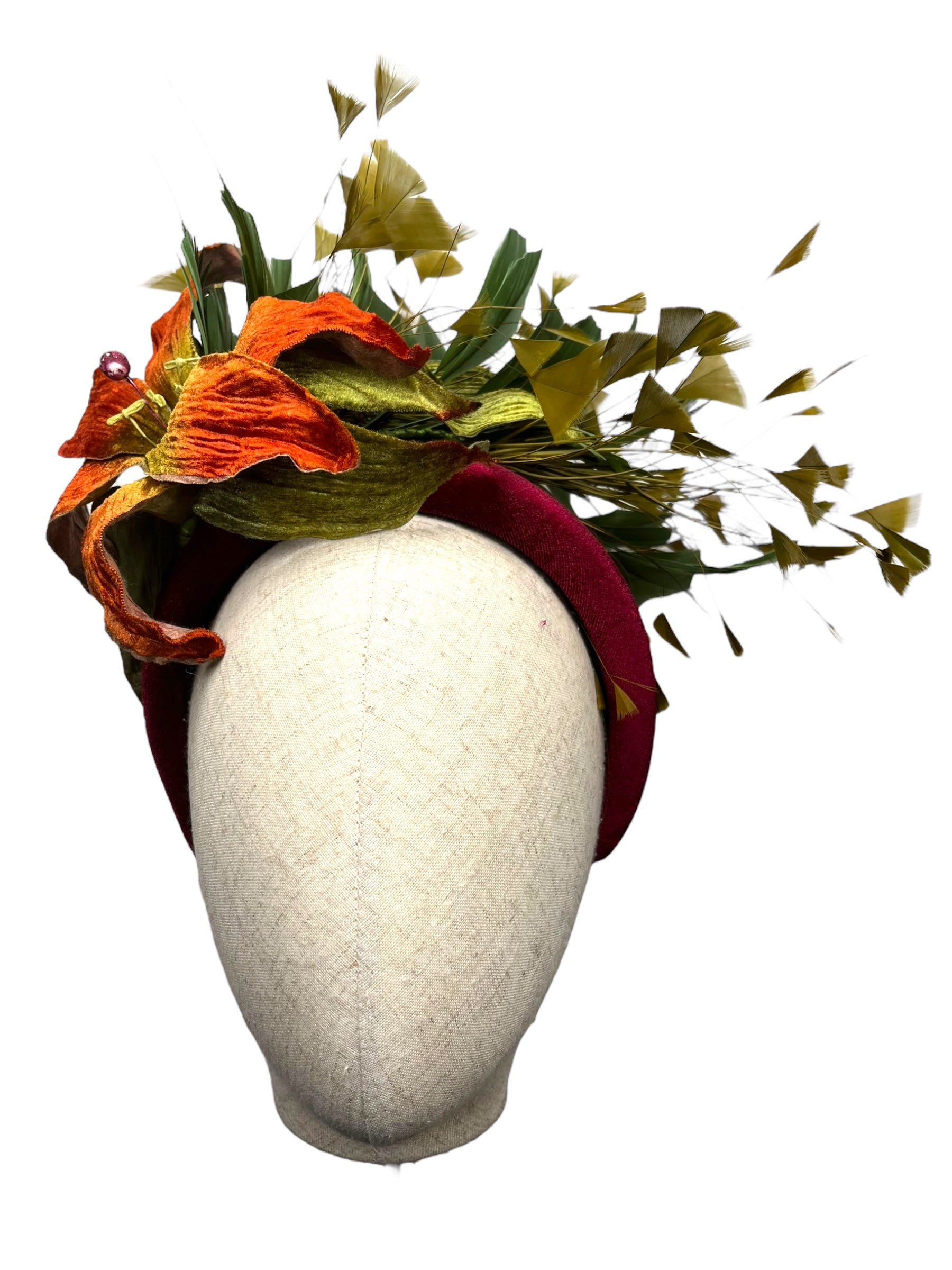A padded velvet headband with a vintage orange Lily in velvet and feathers