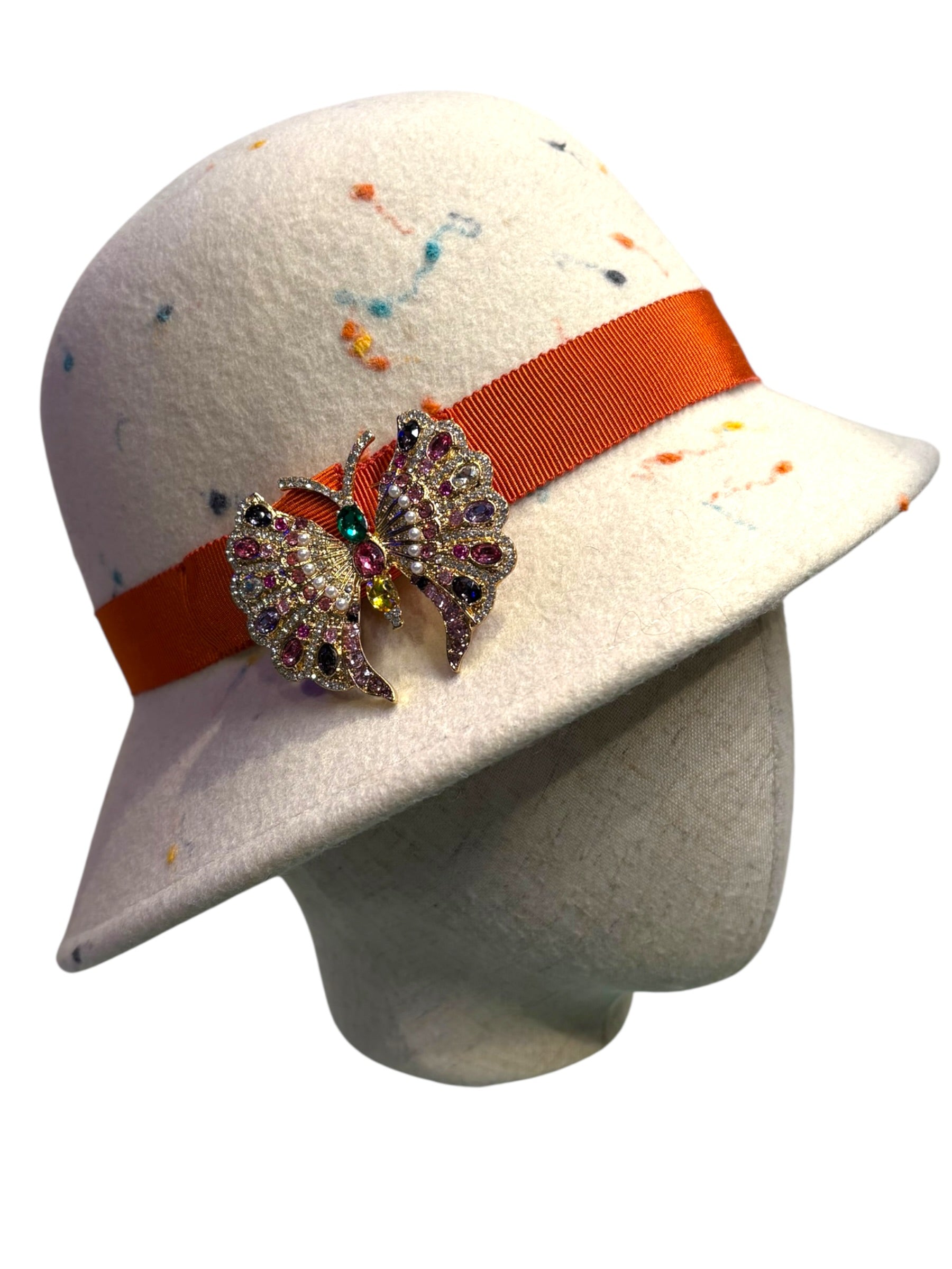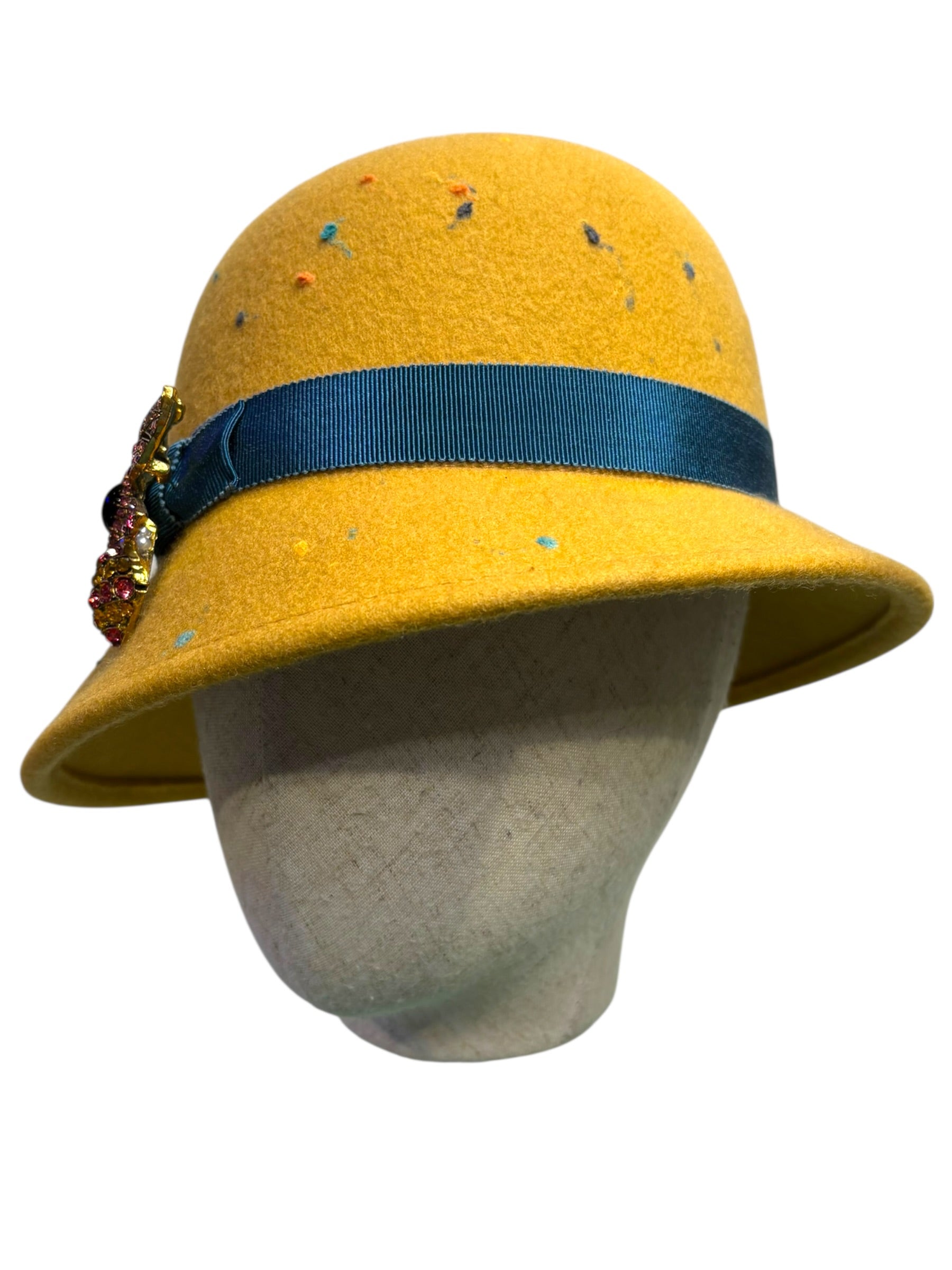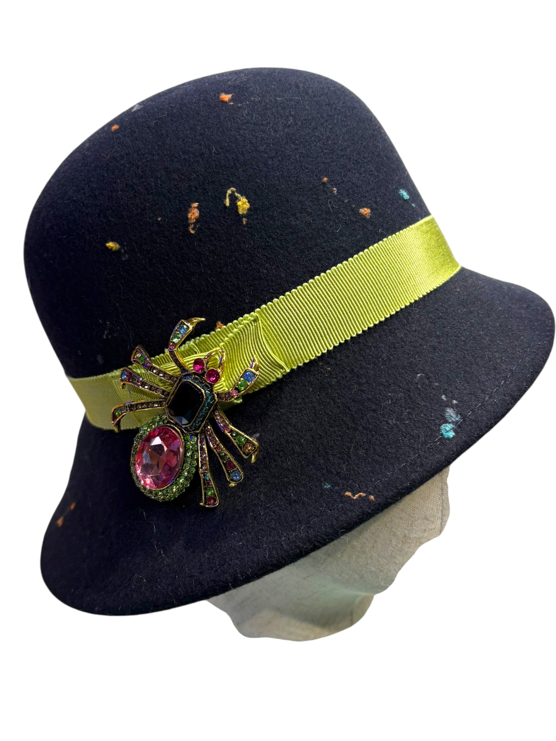 A W&B 1920s style cloche made in original 1970s Merino wool felt with a Petersham ribbon and a Swarovski brooch