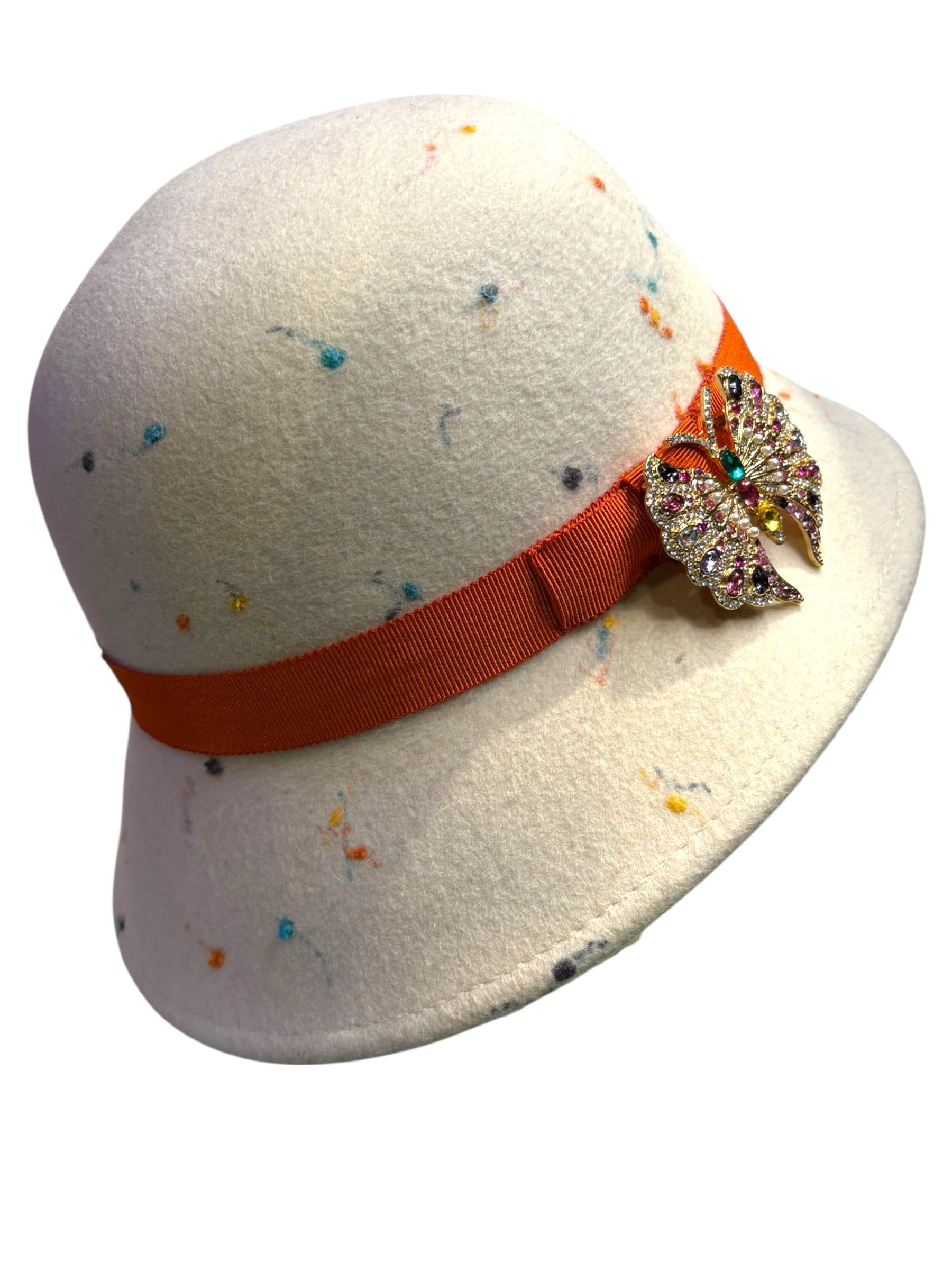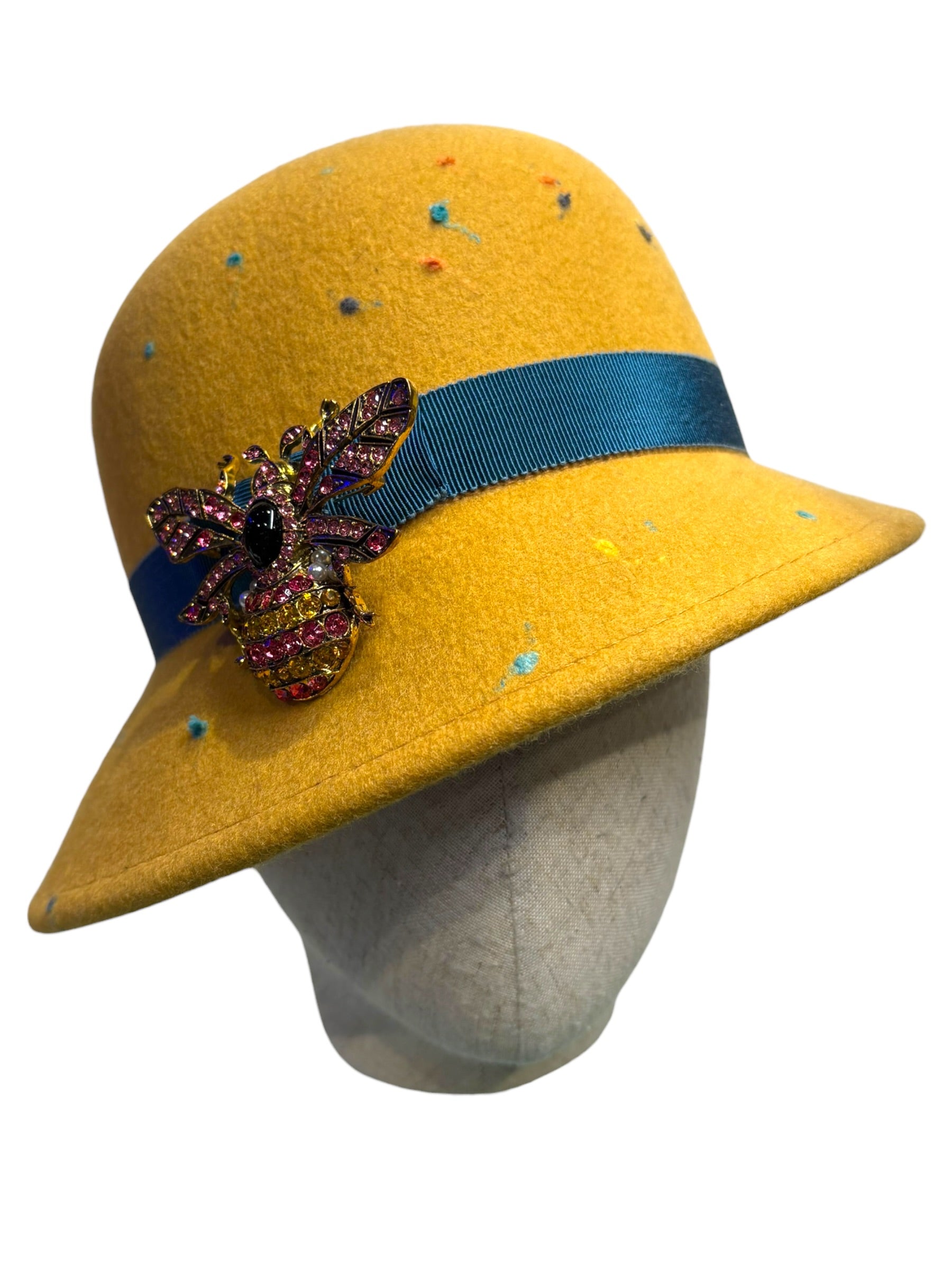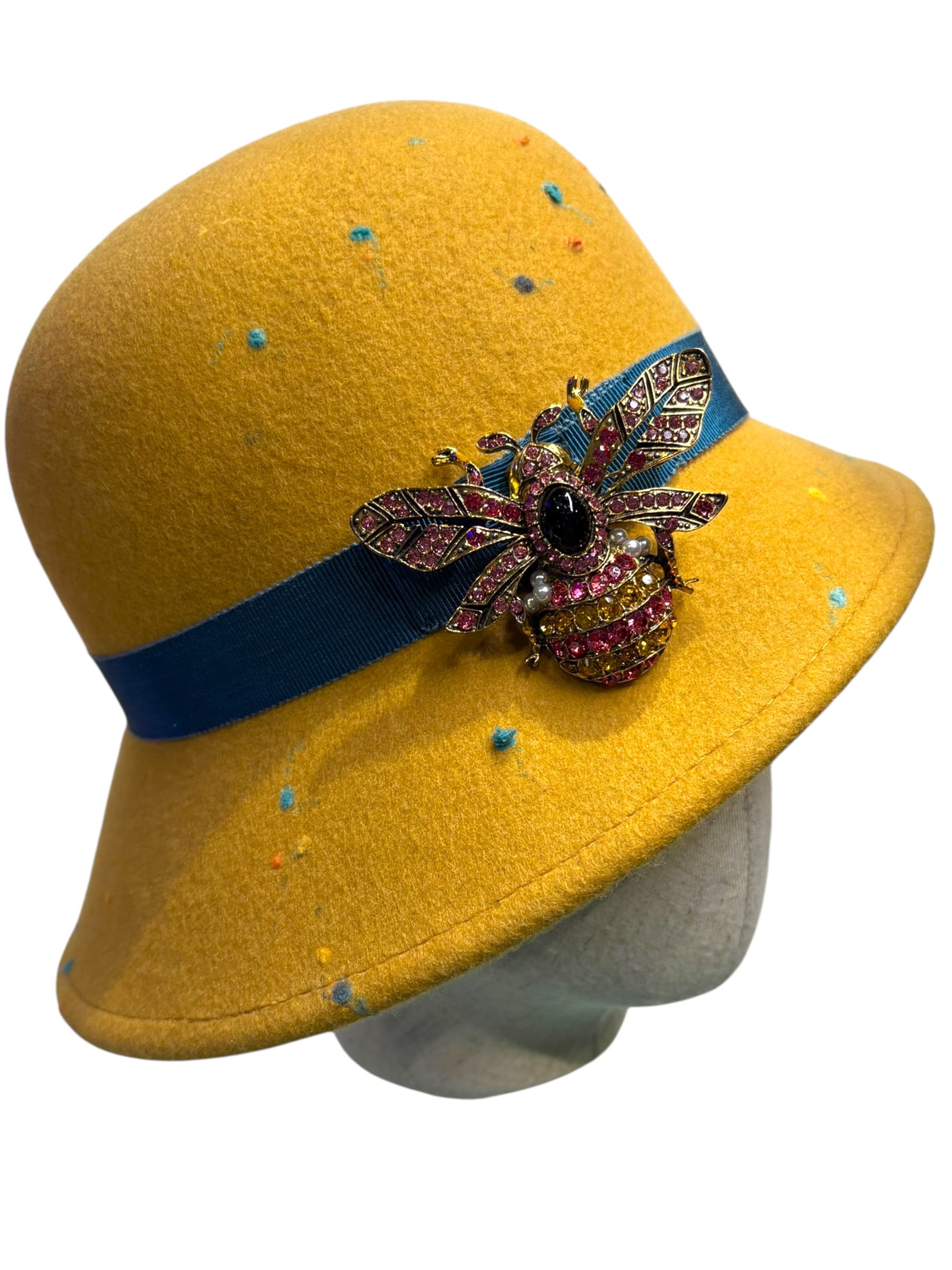 A W&B 1920s style cloche made in original 1970s Merino wool felt with a Petersham ribbon and a Swarovski brooch