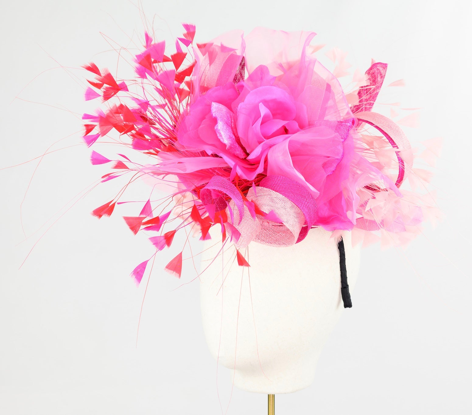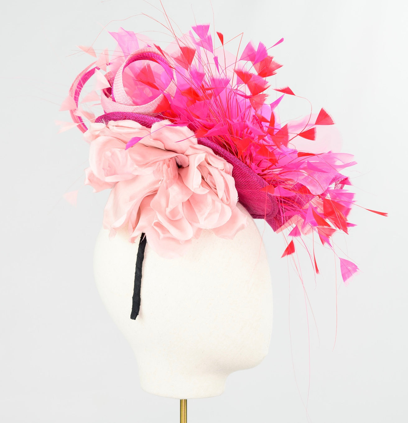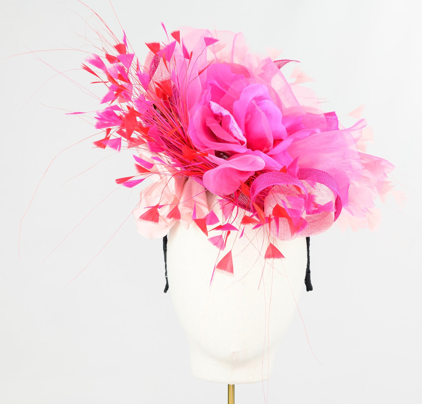 Material : On a 21cm sinamay fuchsia rounded scoop, with two tone pale pink & cerise pink sinamay ribbons, stand a 25cm velvet and organza silk handmade flower wrapped in two triangle of tipped stripped coque & burnt peacock feather mount and finish the side with a 20 cm large blush pink organza silk flower