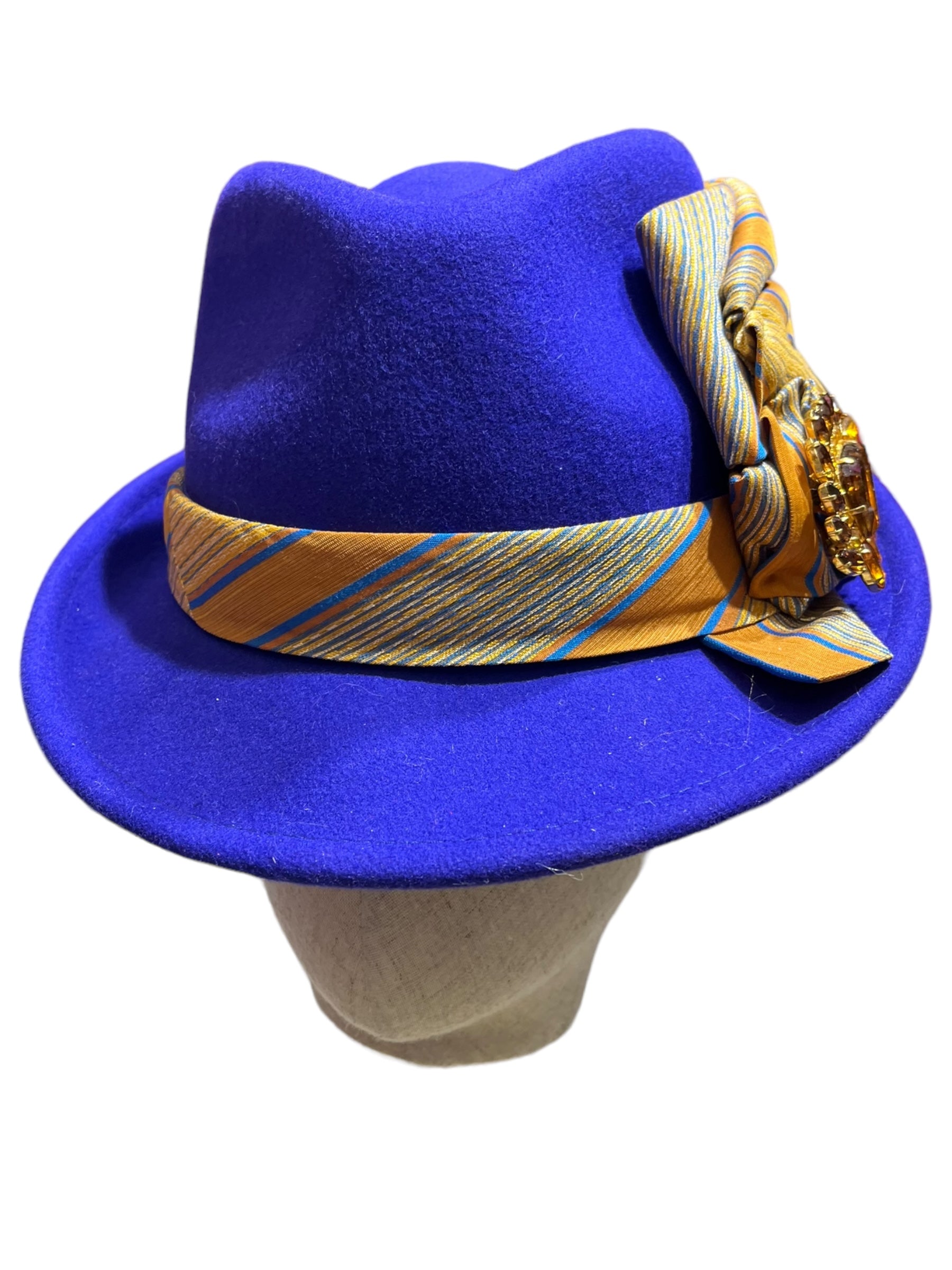 A Royal Blue 100% Merino Wool felt Trilby with a silk tie by Paul Smith and an original vintage brooch