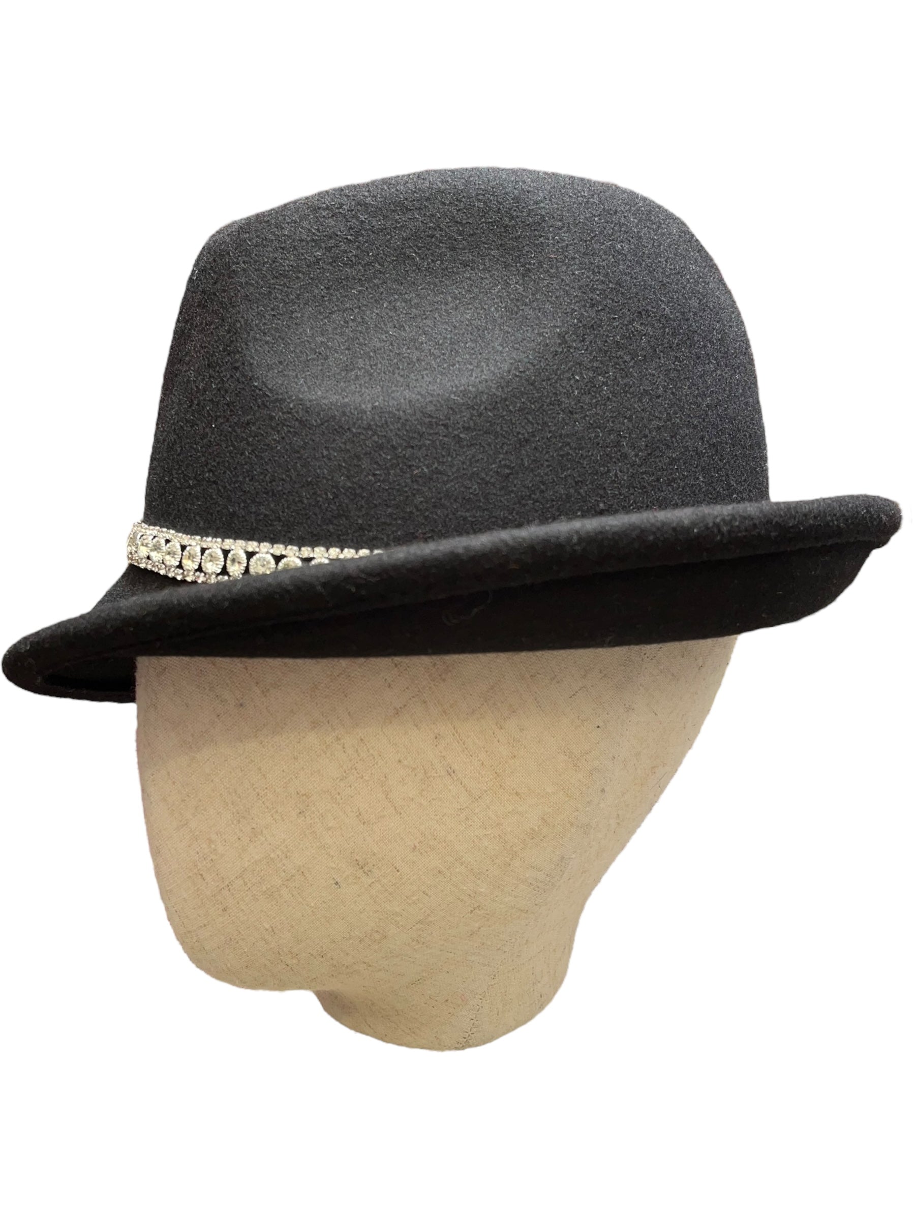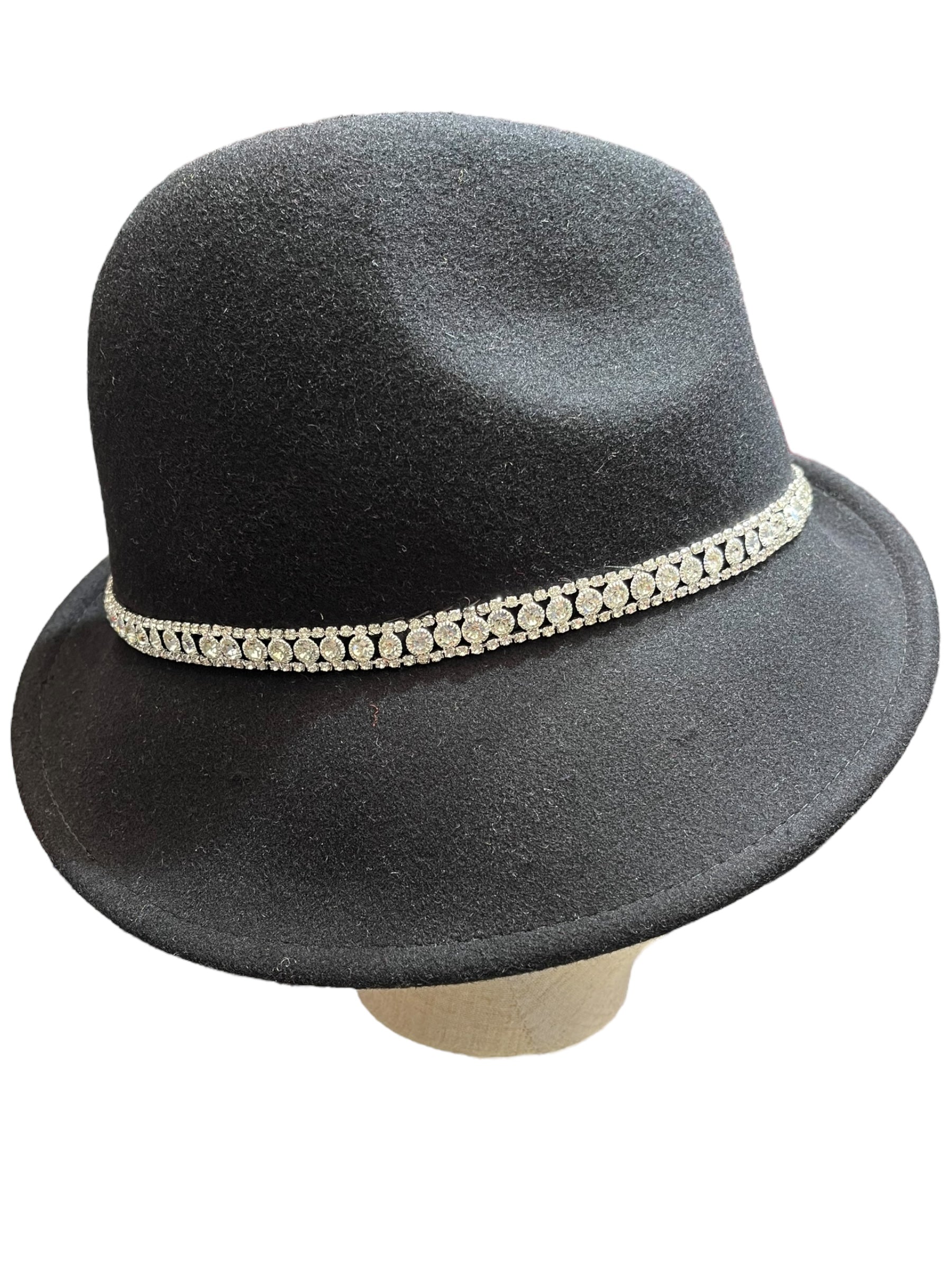A W&B 1940s style side trilby in black merino wool felt with a Swarovski belt it’s lined too