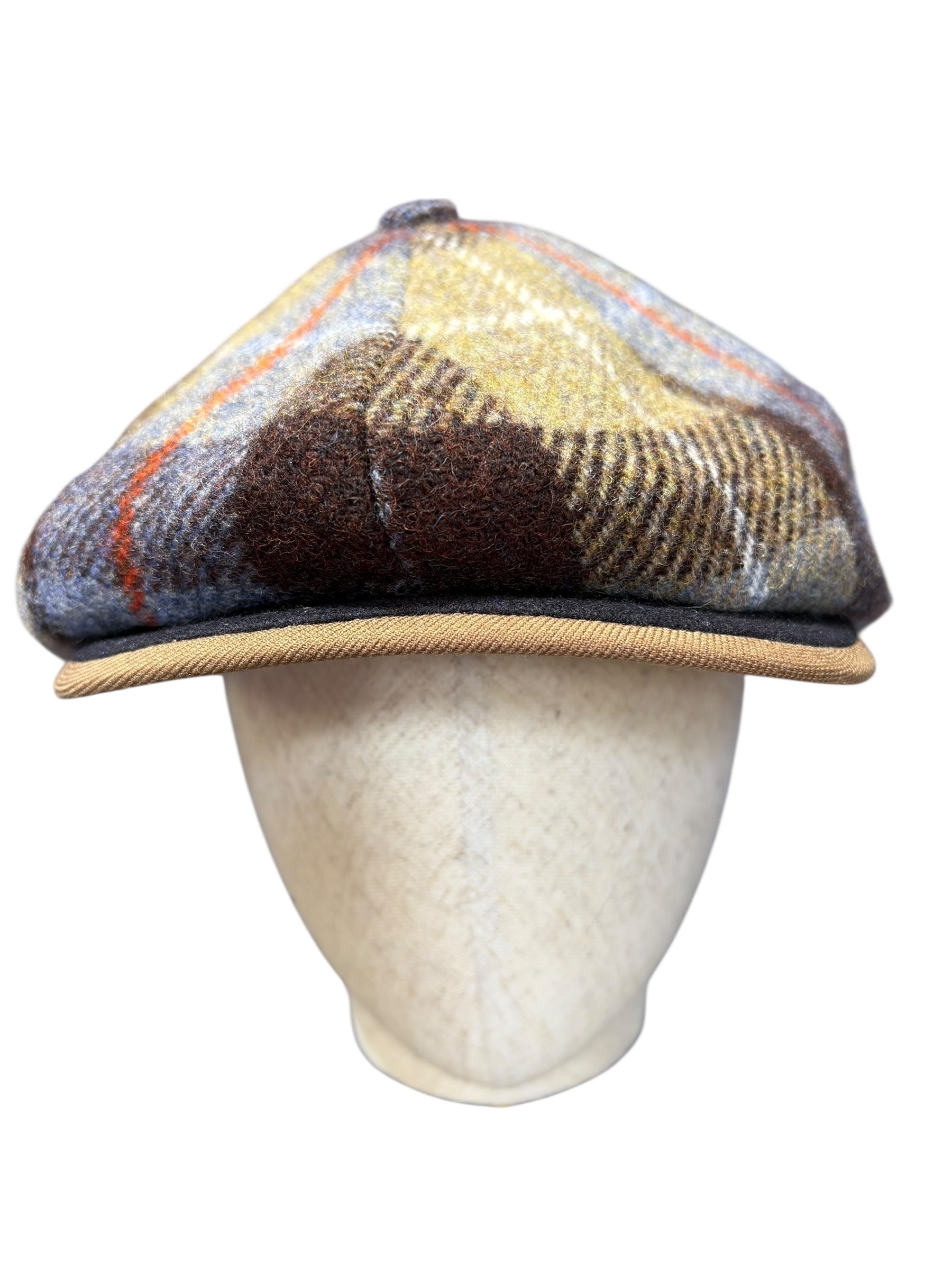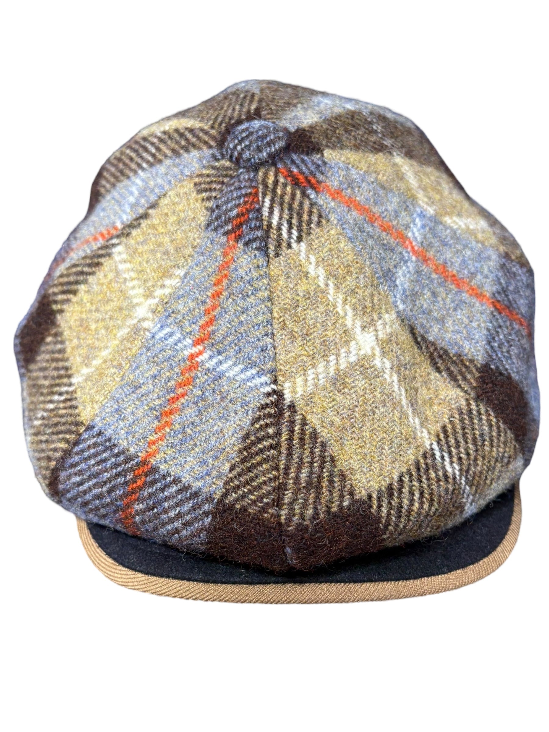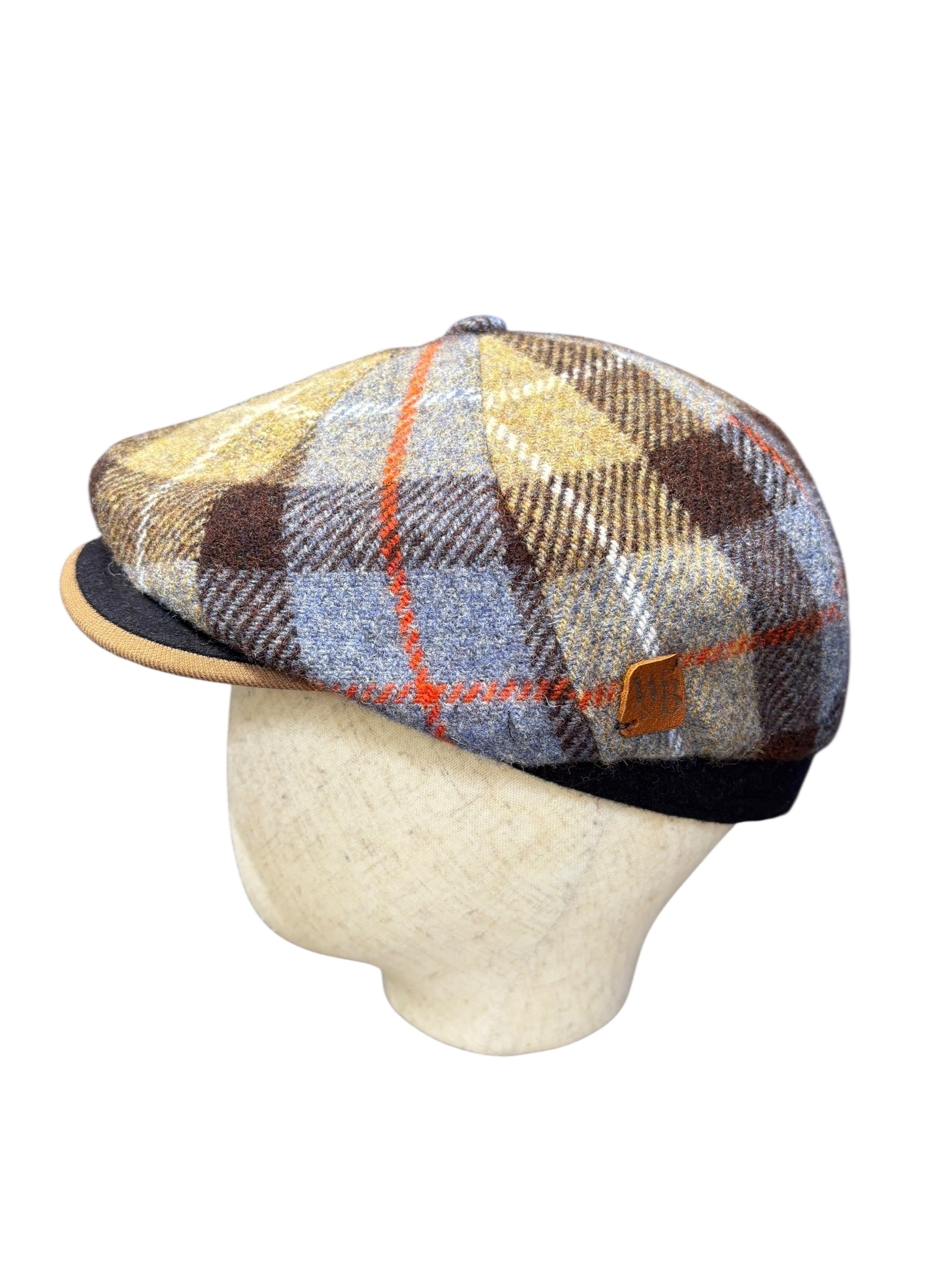 its a classic Baker Boy cap in non clan 100% wool Tartan blue camel peak, it’s come in two joint sizes and branded on the side with ours leather logo
