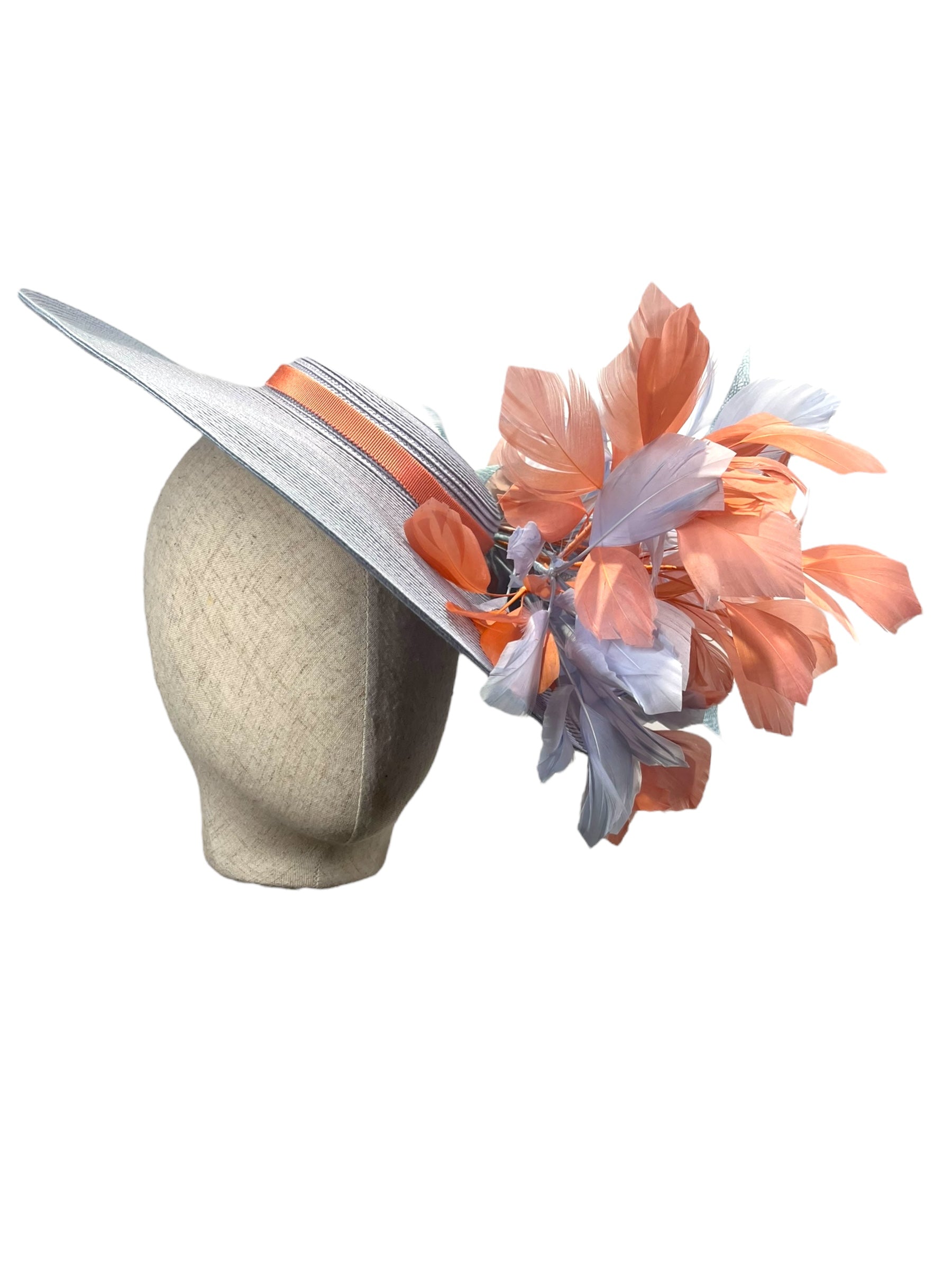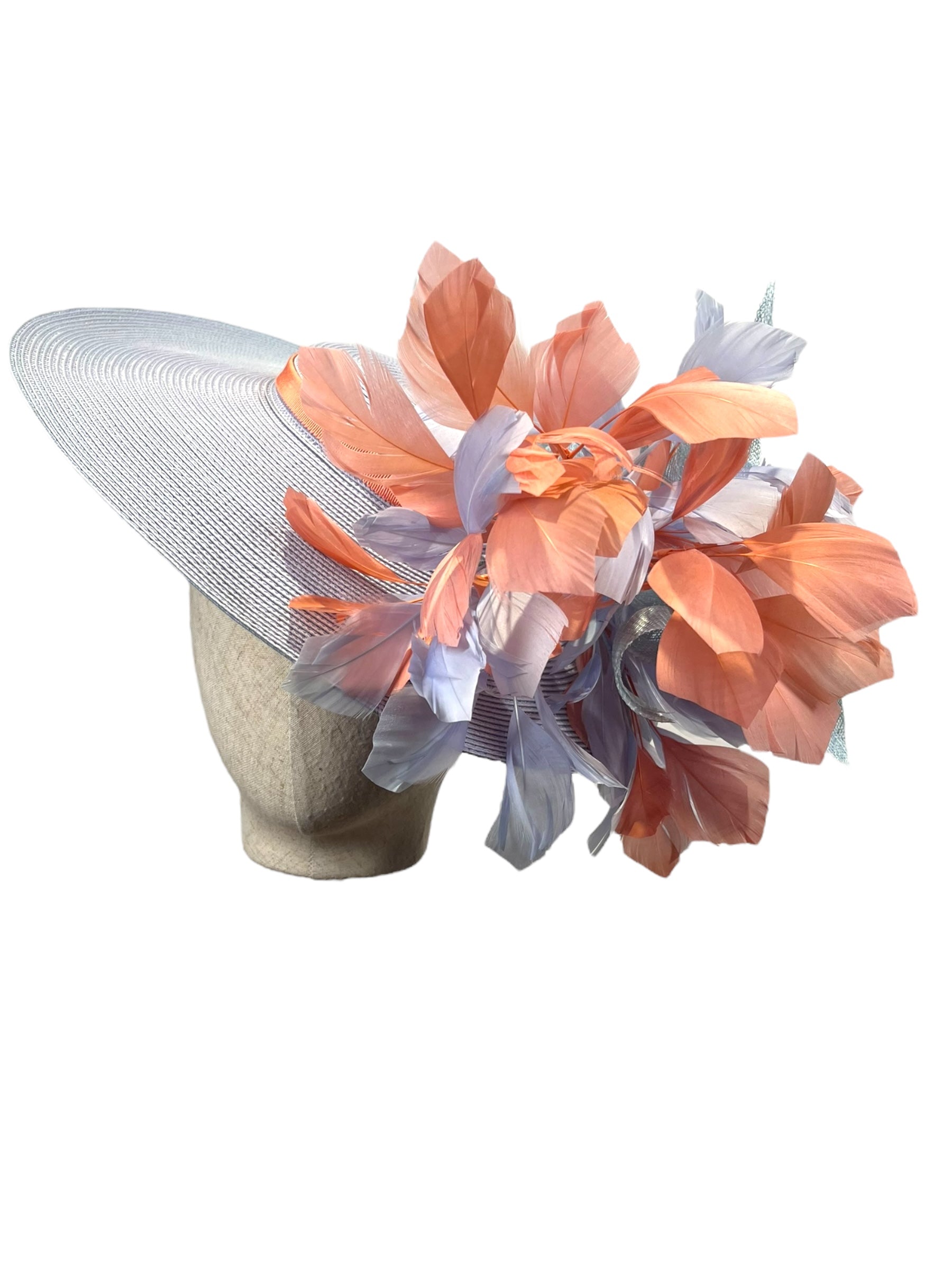 a soft Sky blue lilac boater with a goose feather mouth in lilac and blush pink with blush pink organza silk flower it’s seat on a comb and can be put on headband on request
