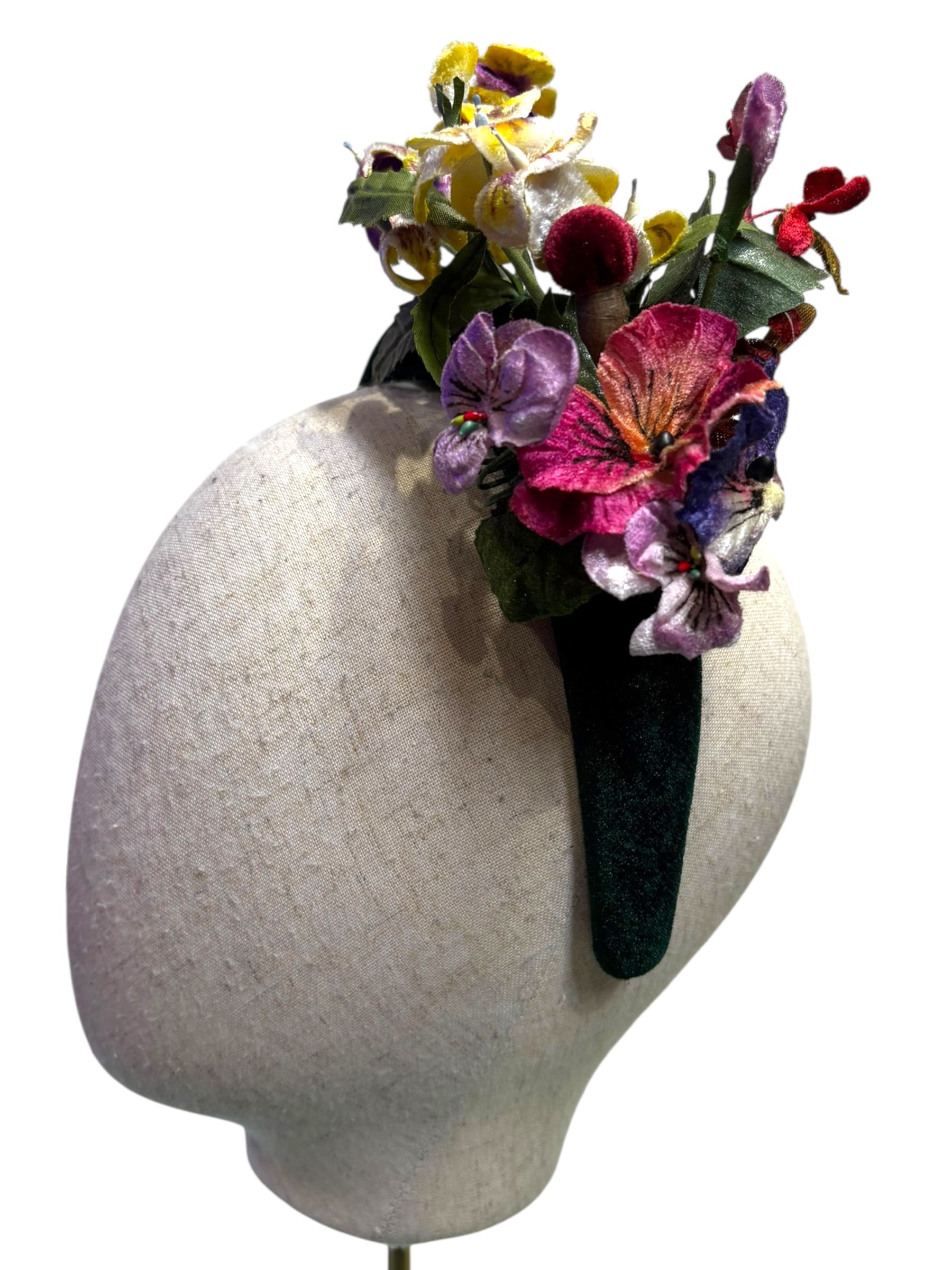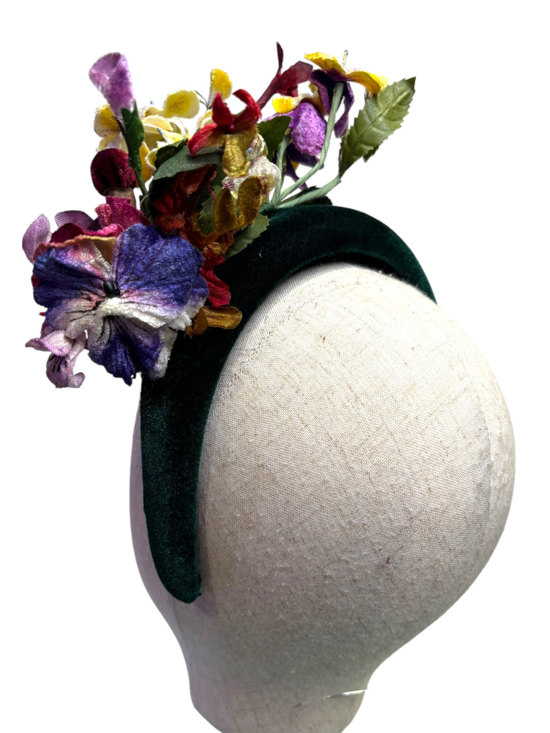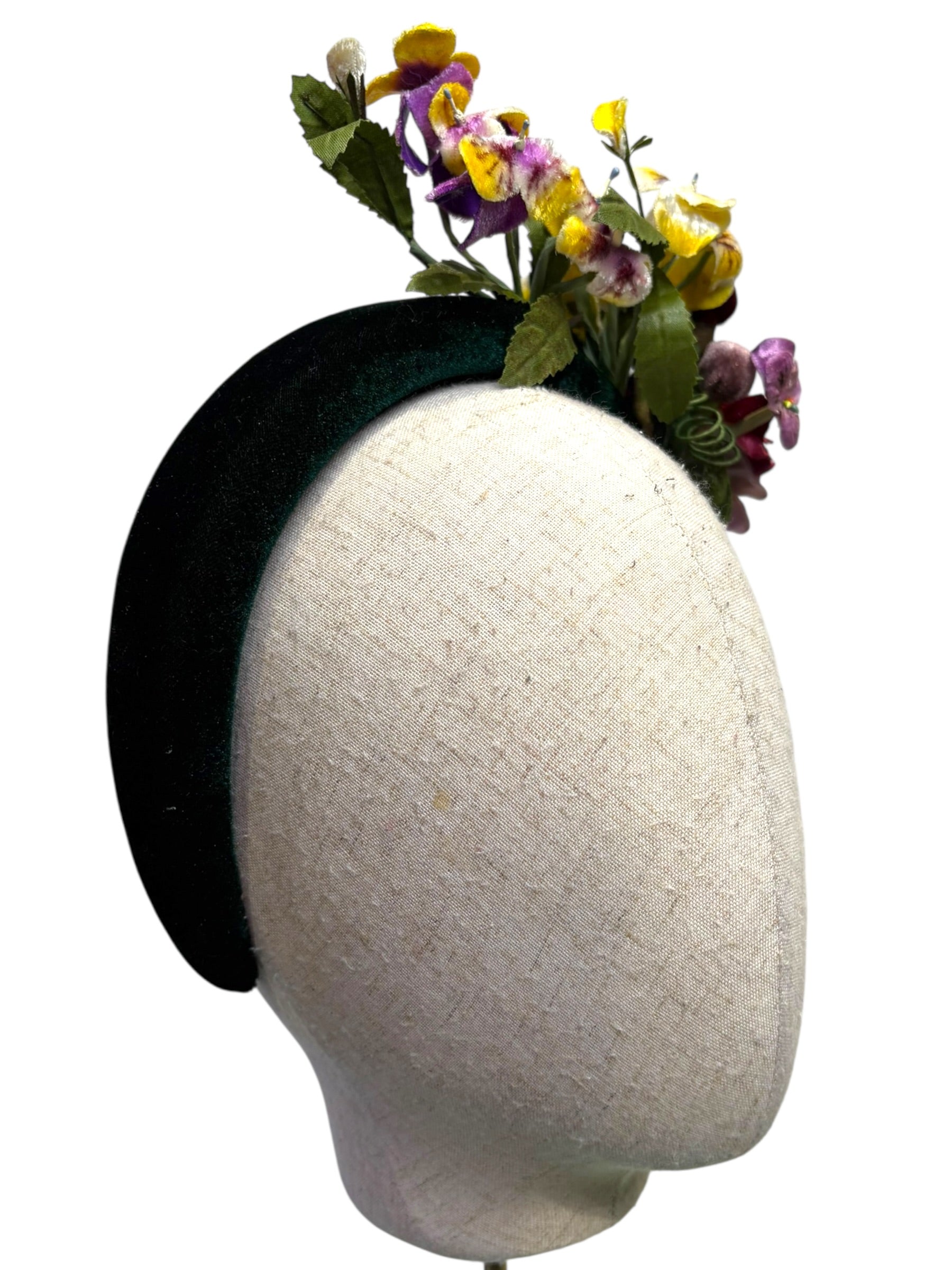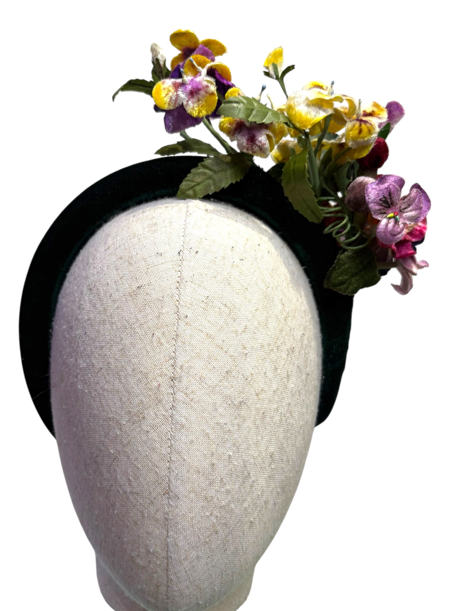A W&B padded deep green velvet headband with fone incredible handmade and hand painted vintage 1940s violets